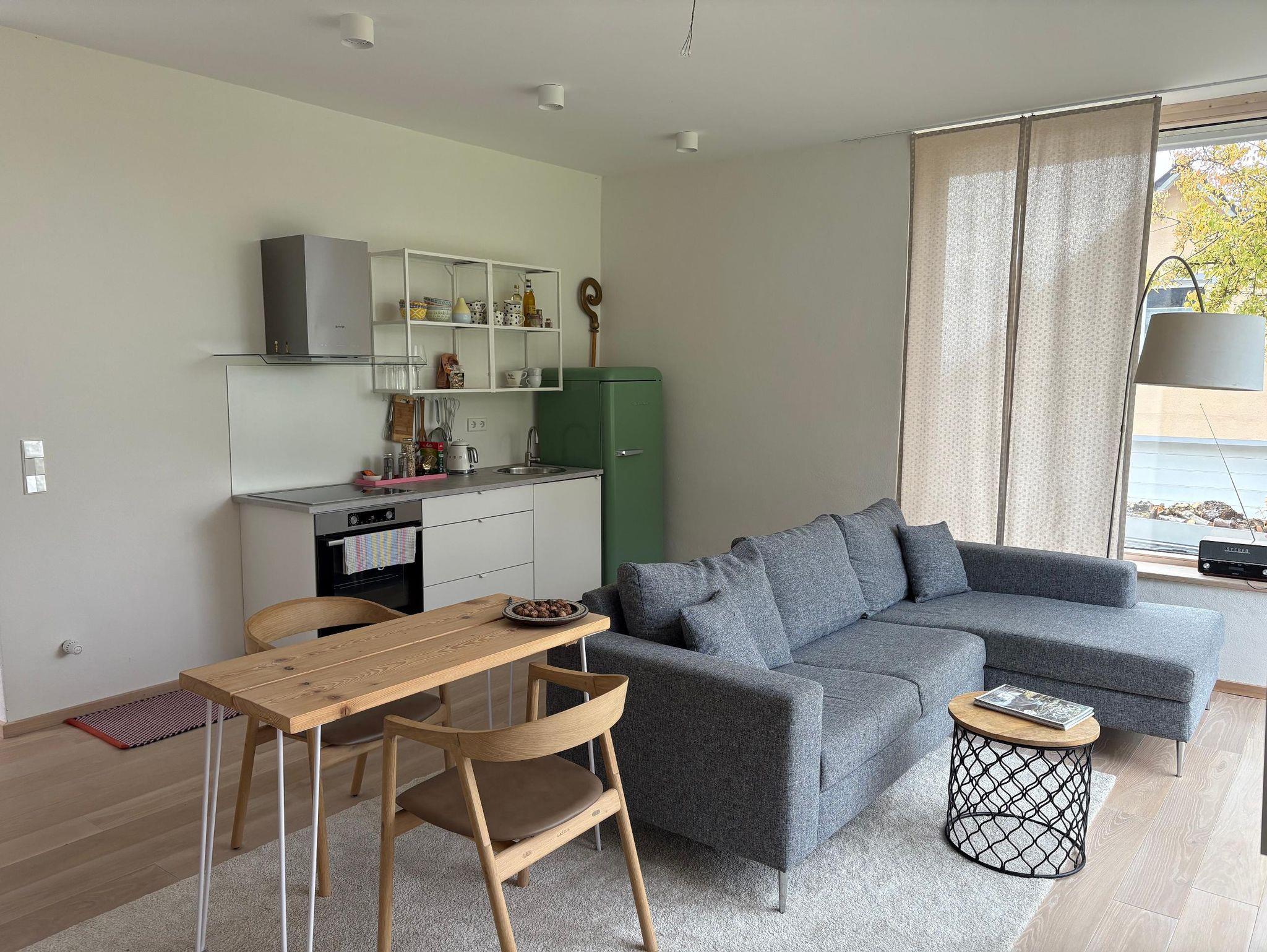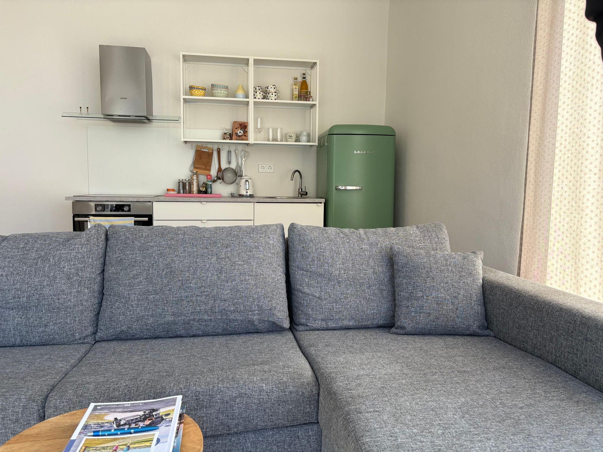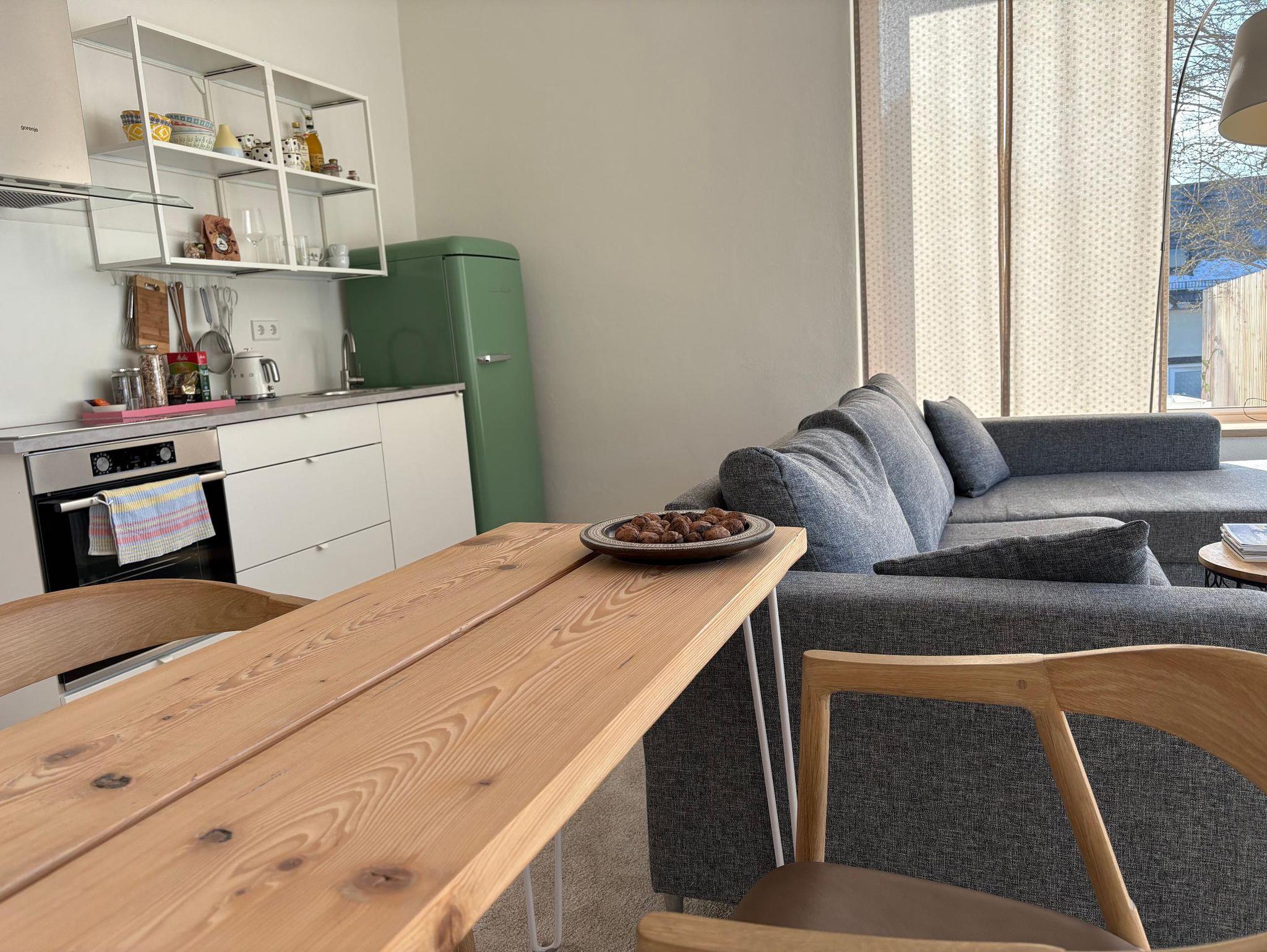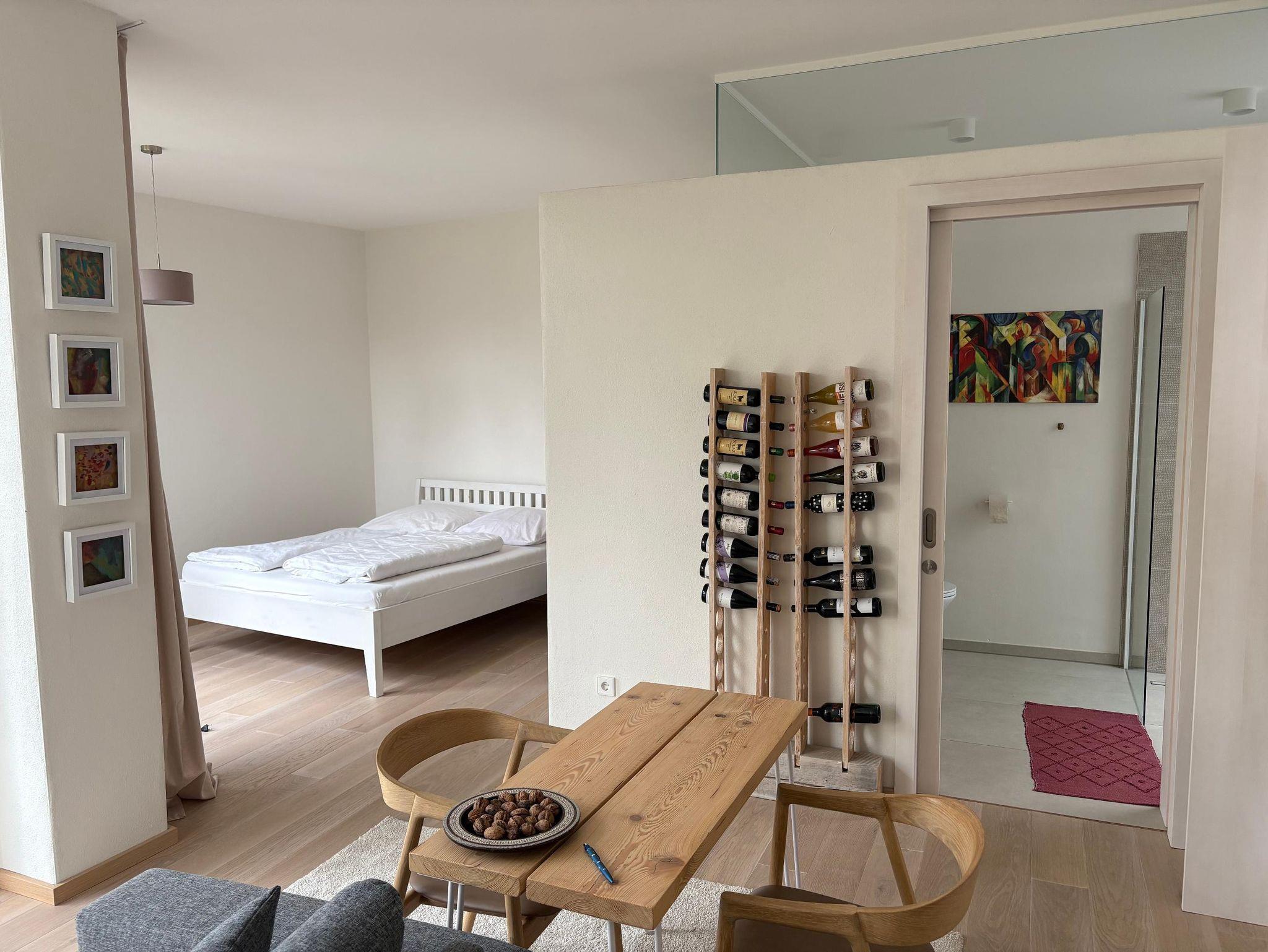 Das Gästehaus verfügt über eine vollständig ausgestattete Küche, einen Wohn-Essbereich mit gemütlicher Couch, einen Schlafbereich und ein separates Badezimmer mit großzügiger Dusche.