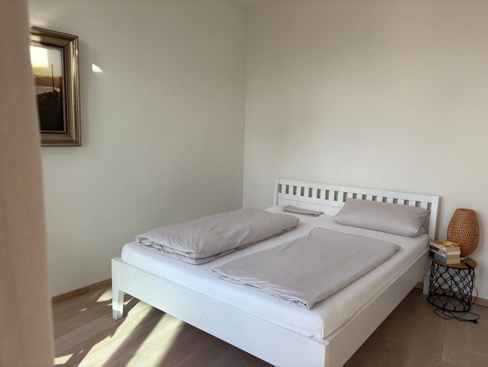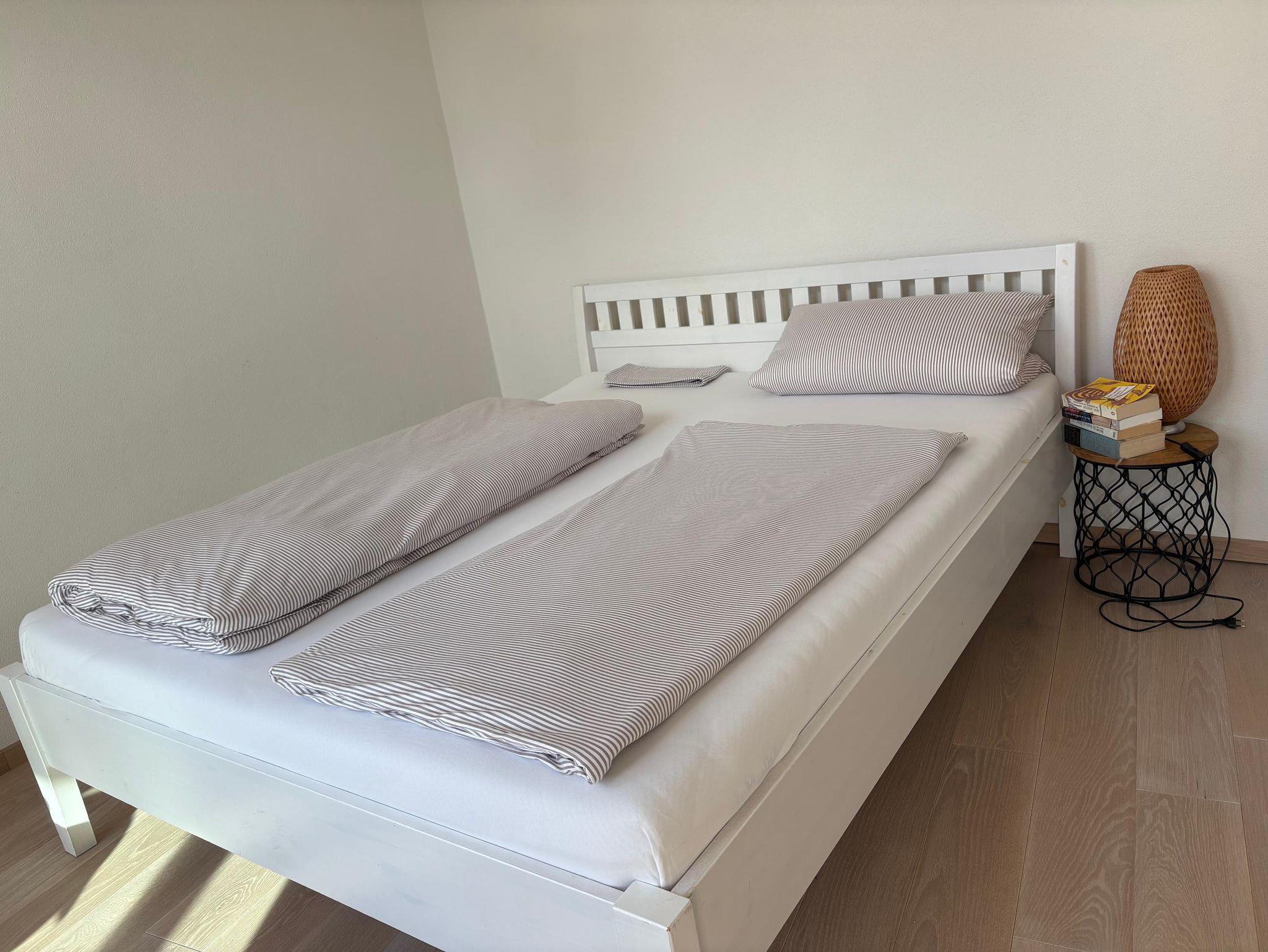 Es ist ein 1,60 Meter großes Doppelbett vorhanden.
