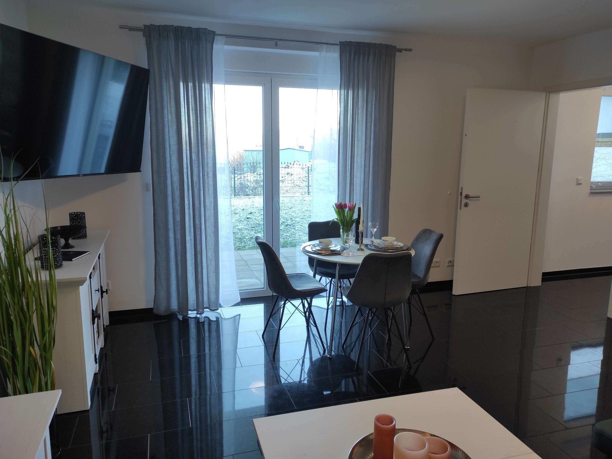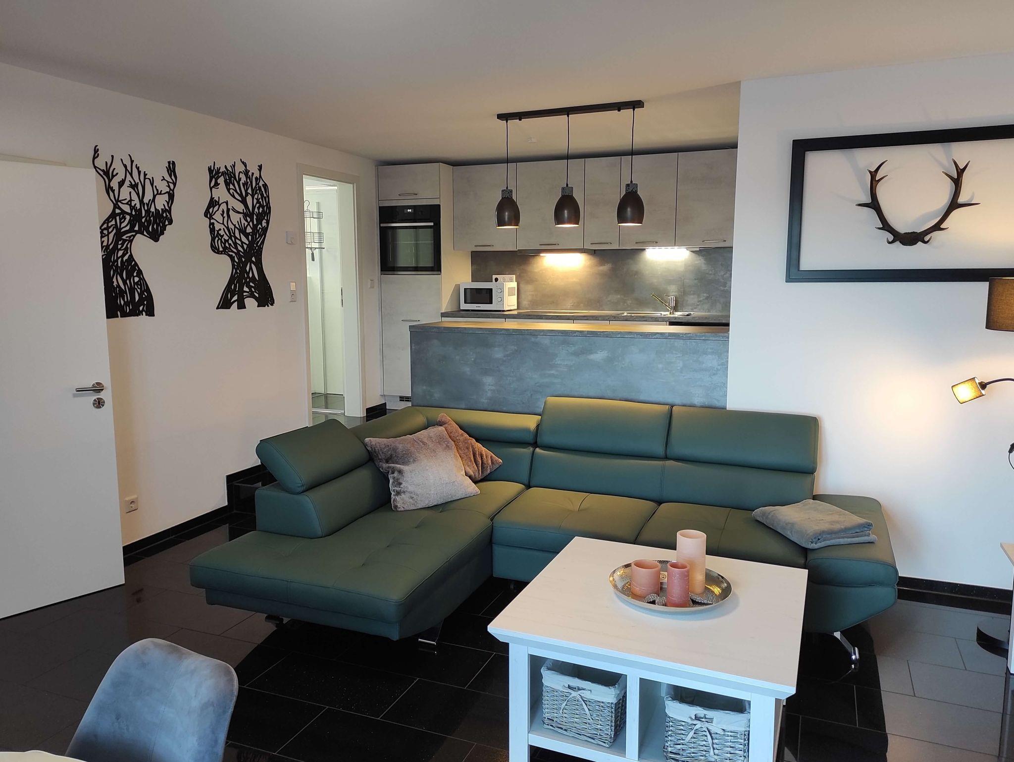 Im Wohnbereich befindet sich ein hochwertiges Lederschlafsofa mit einer ausziehbaren Liegefläche von 130 x 200 cm, der dazugehötige Schlaftopper befindet sich im Bettkasten des Sofas. Ein Elektrokamin für gemütlich ausklingernde Abende, sowie ein 65 Zoll großer Fernseher rundet die Einrichtung des Wohnzimmers ab. Für die gemeinsamen Mahlzeiten befindet sich der Esstisch mit 4 Stühlen vor dem Terrassenfenster.