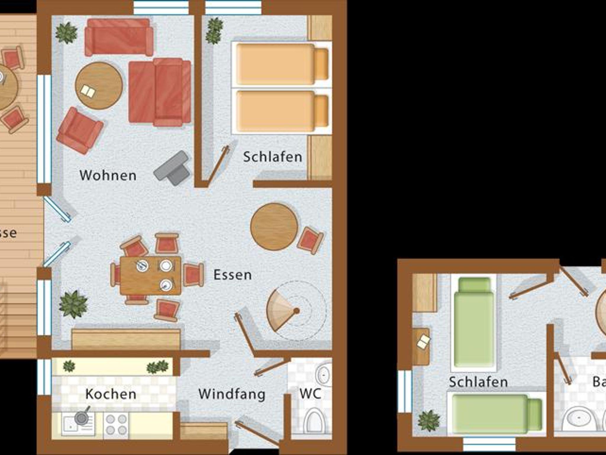 In der mit viel Liebe ausgestatteten Wohnung im Erdgeschoß des Hauses befindet sich ein Wohnraum mit einer gemütlichen Sitzecke und Essplatz für bis zu sechs Personen sowie Kabel-TV und Radio. Ein Elternschlafzimmer mit Doppelbett. Im Flur finden Sie die Garderobe und das separate WC. Die separate Küche ist vollständig eingerichtet mit Herd/Backofen/Mikrowelle, Spülmaschine etc. und genügend Geschirr sowie Besteck. Im Untergeschoß ist ein kleines Zweibettschlafzimmer und das Badezimmer mit WC.