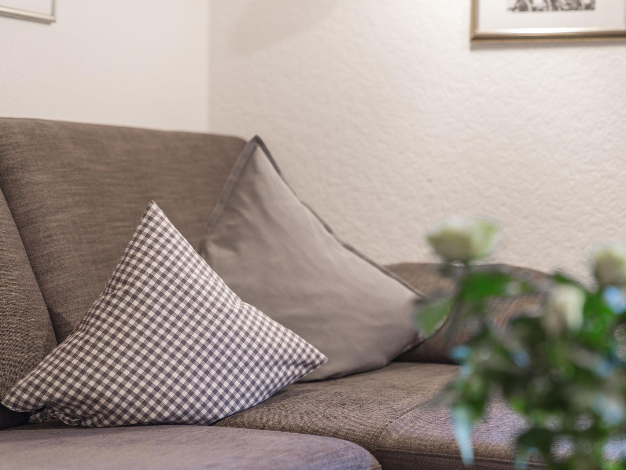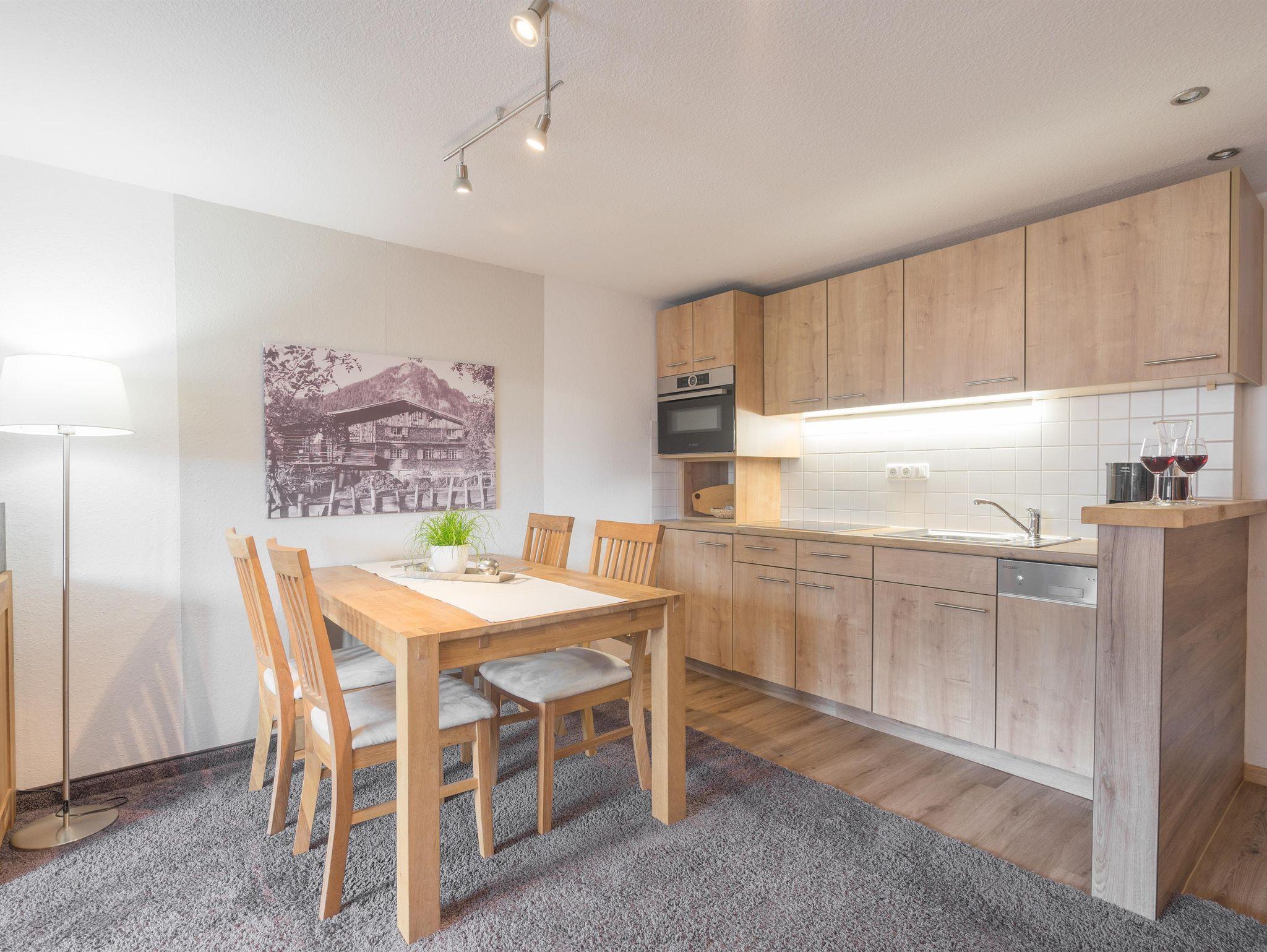 Ferienwohnung Rotspitz-Stube - Wohnraum mit Küchenzeile (Spülmaschine, Backofen, Toaster etc.) u. SAT-TV, Radio - 1 sep. Schlafzimmer, Wecker - Dusche / WC mit Fön und Kosmetikspiegel - Flur, Zimmersafe - Süd- u. Westbalkon mit Sitzecke und Relaxliege.
