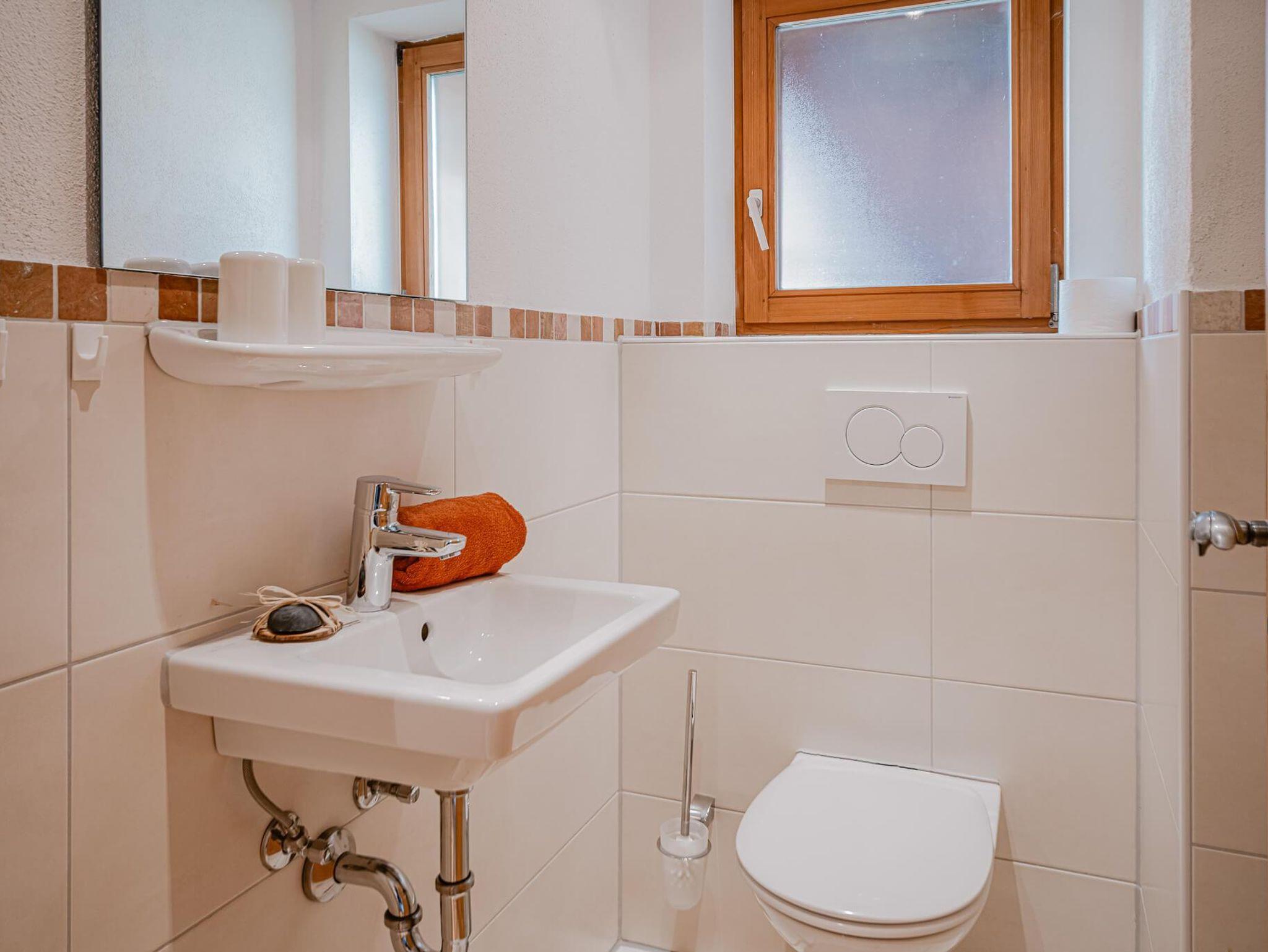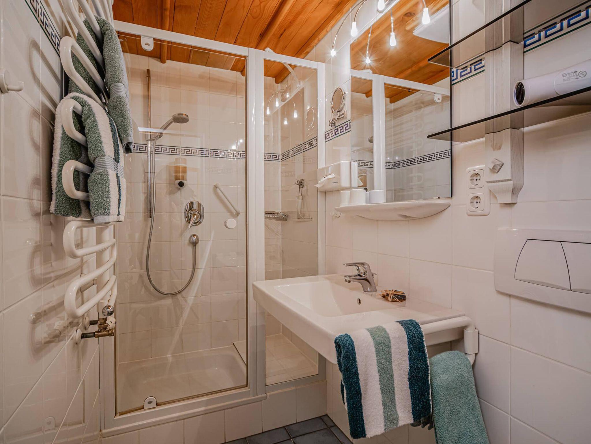 Badezimmer mit Dusche, WC und Haarfön, sept. WC.