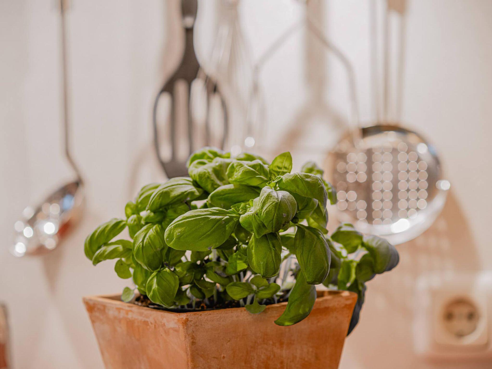 Küche mit 4 Kochplatten, Backofen, Mikrowelle, Spülmaschine, Kaffeemaschine, Espressokocher, Wasserkocher, Toaster, Eierkocher, diverse Arbeitsgeräte, Kochtöpfe, Gläser und Geschirr.