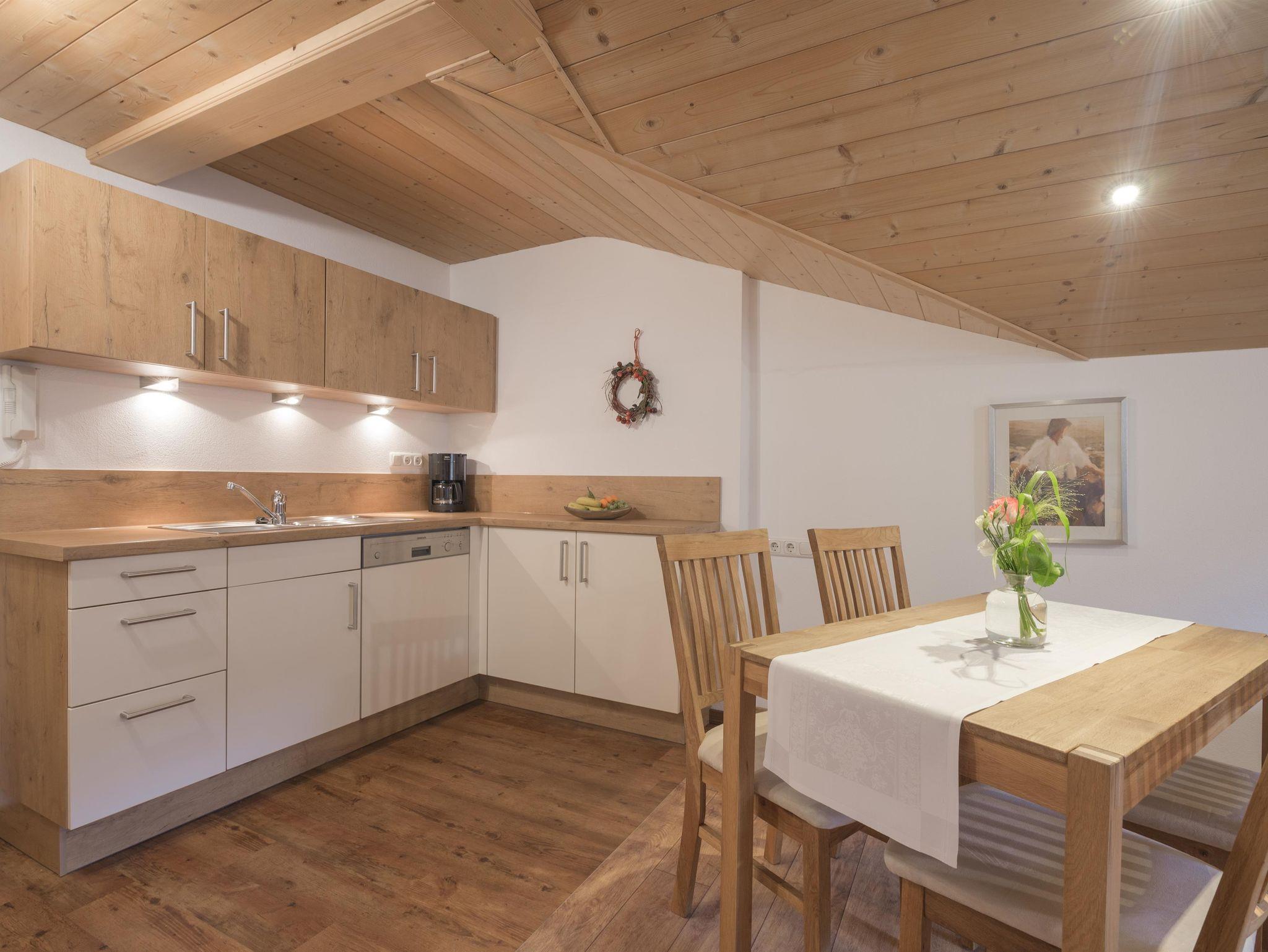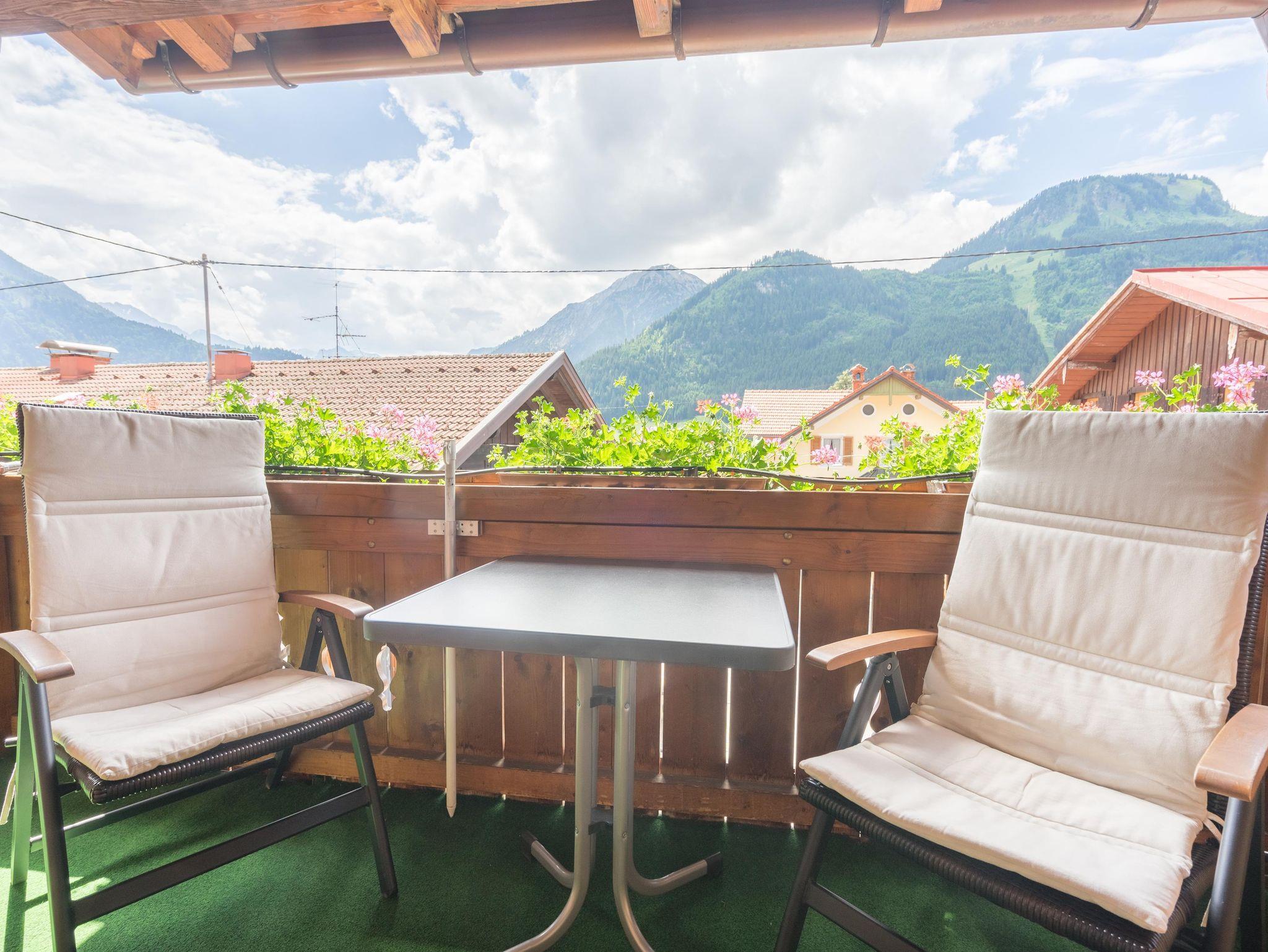 Ferienwohnung Hochvogel-Stube (55m² - für 2 Personen) - Wohnzimmer mit SAT-TV und Radio - 1 sep. Schlafraum, Wecker - Küchenzeile komplett ausgestattet mit Backofen und Geschirrspüler - Dusche, WC, Fön und Kosmetikspiegel - Südbalkon mit Sitzecke und Relaxliege.