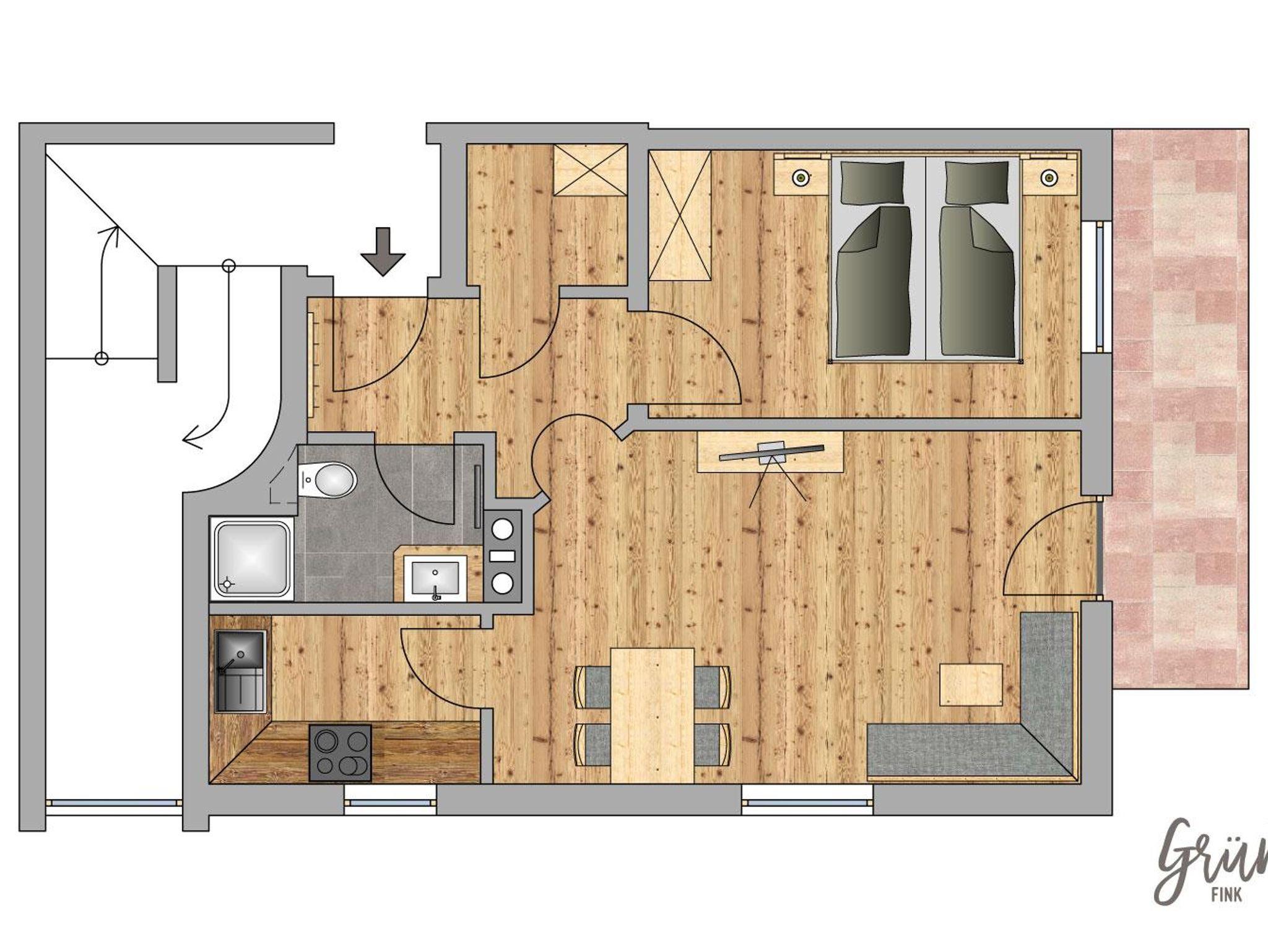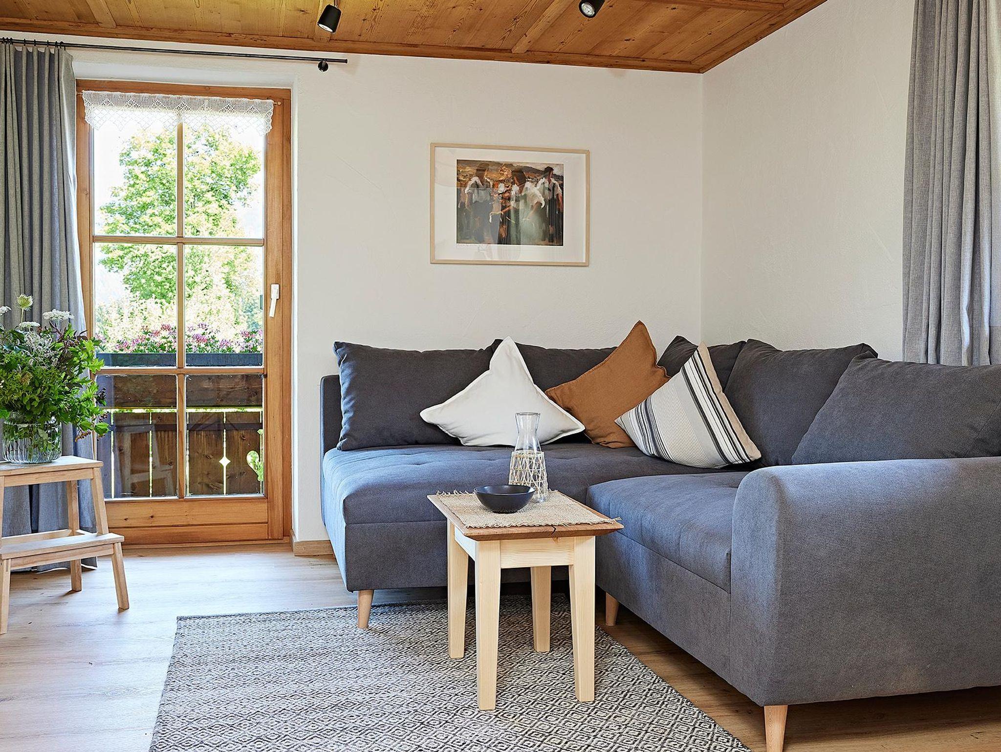 Der gemütliche Wohnraum ist im Allgäuer Stil eingerichtet und hat einen Ausgang zum Balkon.