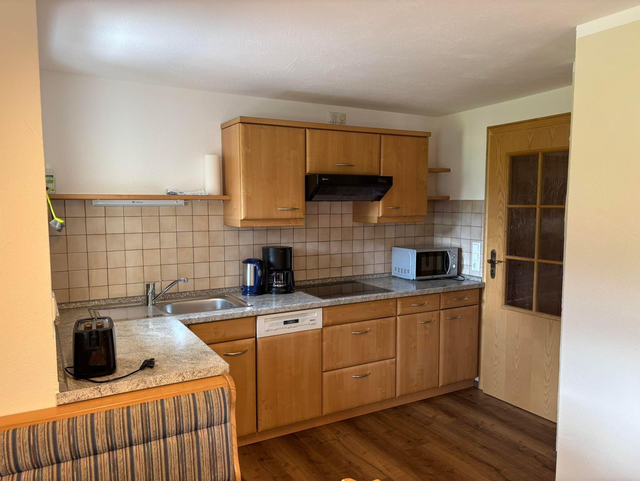 Küchenzeile mit 4-Platten-Cerankochfeld, Spülmaschine, Kaffeemaschine, Toaster, Wasserkocher, Microwelle.