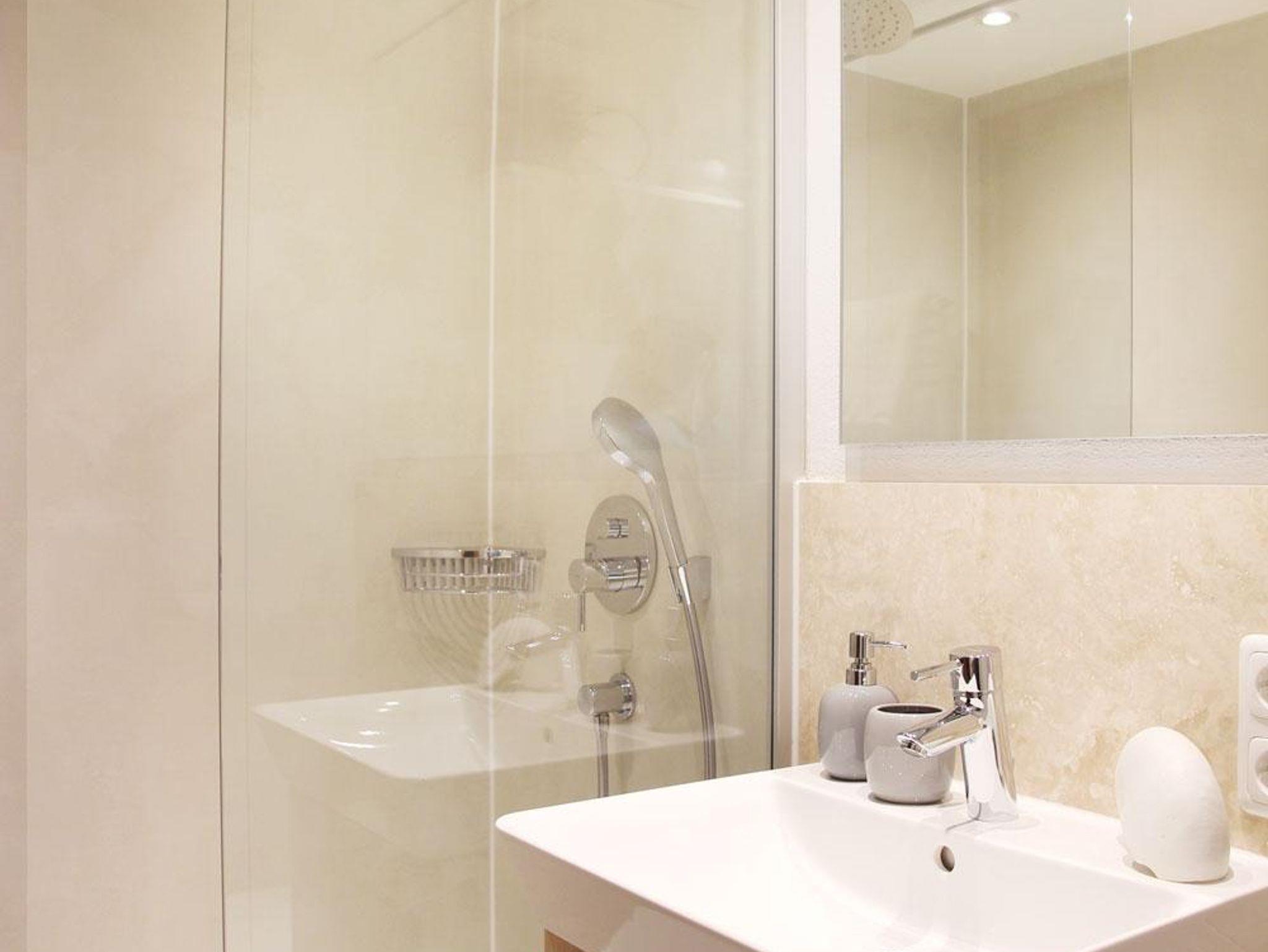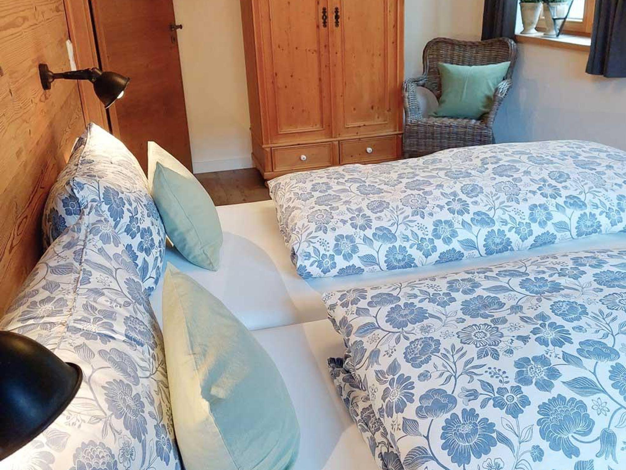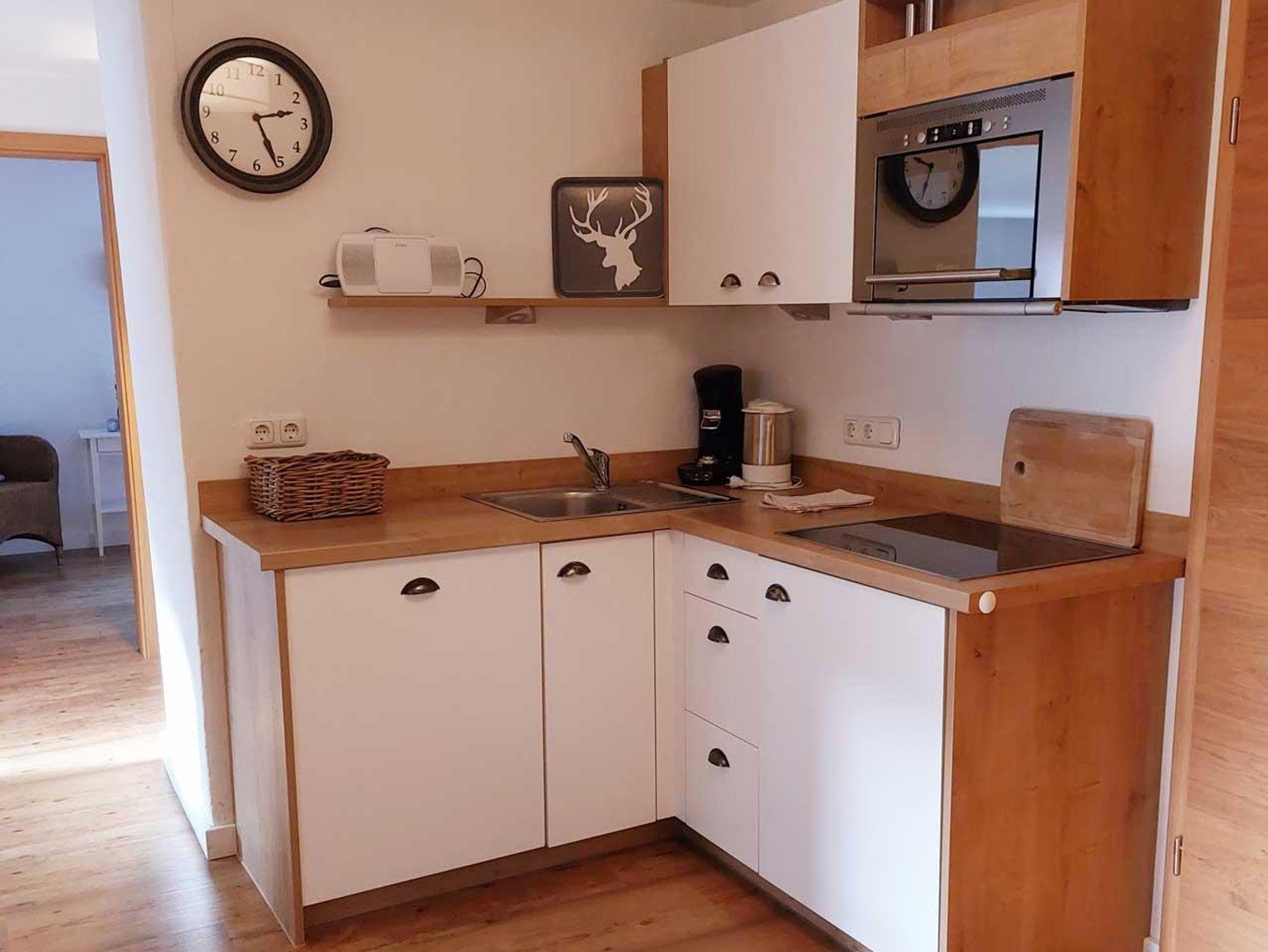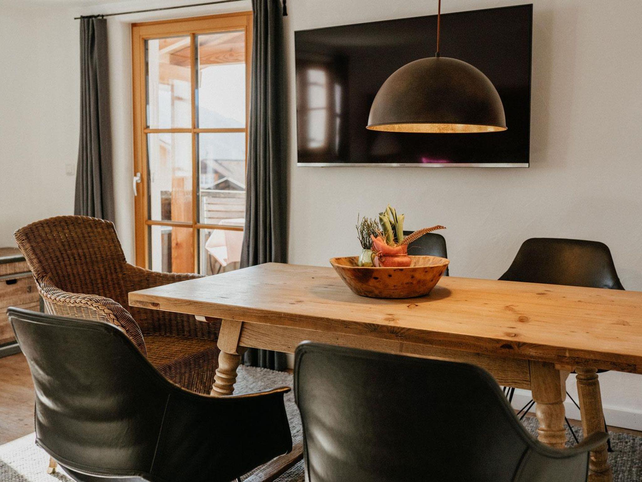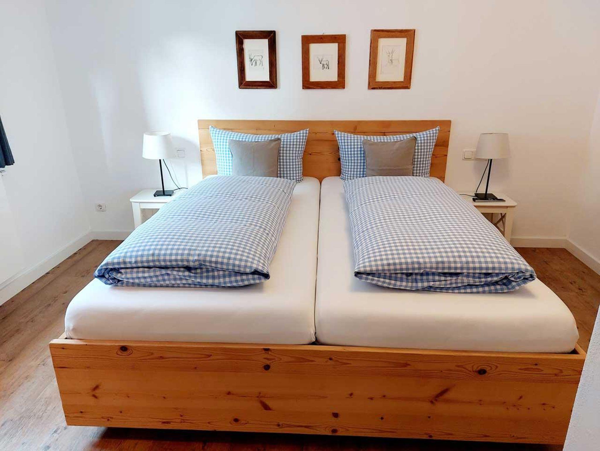 Unsere große Ferienwohnung hat zwei separate Schlafräume mit Betten in Komforthöhe eines davon mit zusätzlichem TV, einen gemütlichen Wohnraum mit Küchenzeile, ein Badezimmer mit Doppelwaschbecken und Dusche sowie ein sep. WC und einen Südbalkon mit Sitzgelegenheit und Bergblick.