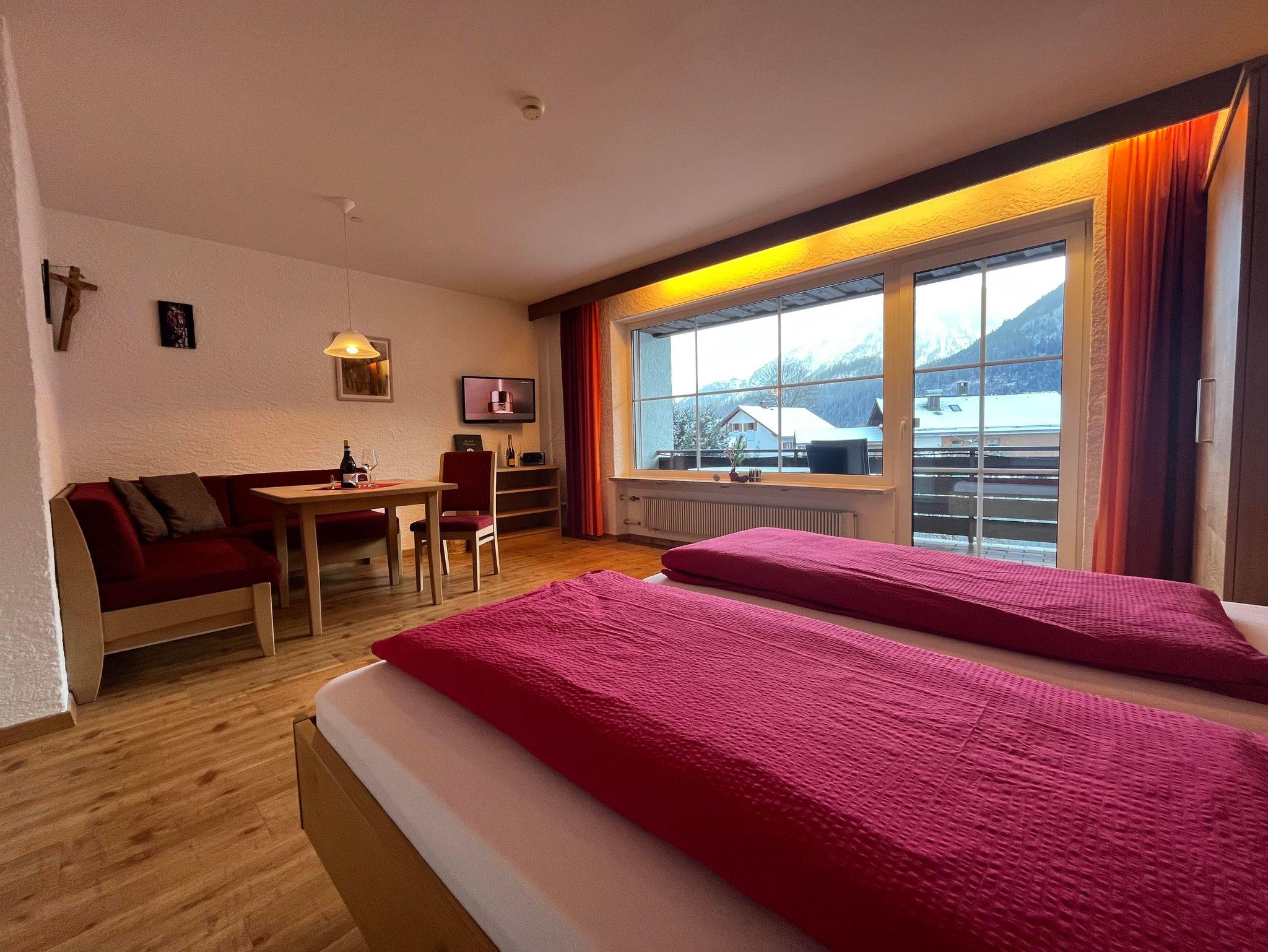 Alles neu renoviert! Geeignet für zwei bis fünf Personen. Lage Süd-Ostseite mit 2 grossen überdachten Balkonen, Flur, grosses Wohn-/Schlafzimmer mit Doppelbett,sep. Schlafzimmer mit Doppelbett und Extrabett (Extrabett ist 1,80m lang), wunderschöne Sitzgarnitur, Fensterfront u. Türe zum grossen Südbalkon. Komplett eingerichtete Küche mit Spühlmaschine, Dusche u. WC. Radio u. Flachbildfernseher-Sat-TV. Kinderbett auf Wunsch. Gesamt ca. 55 qm.