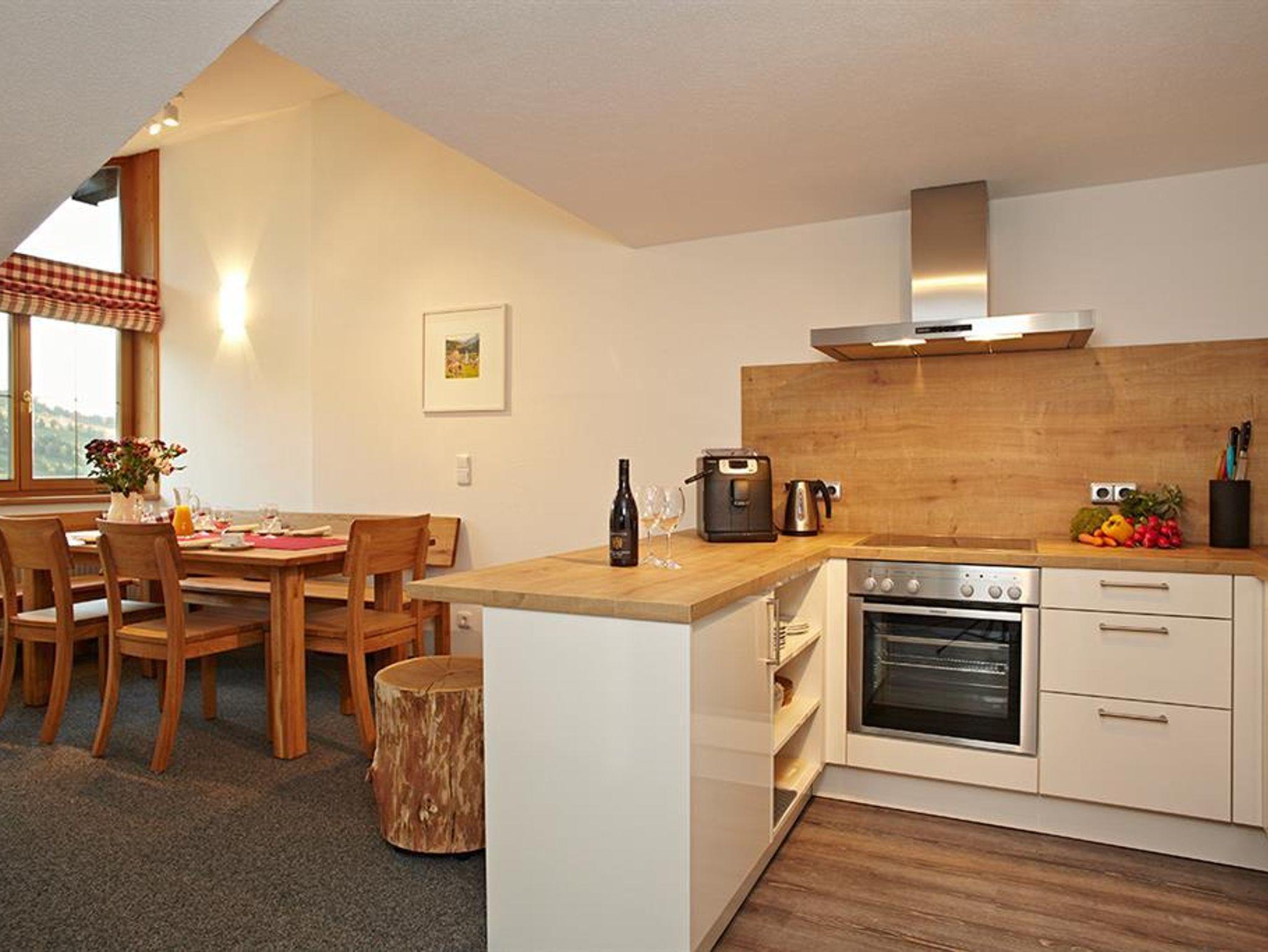 Die offene Küche mit gemütlicher Essecke ist komplett ausgestatte.