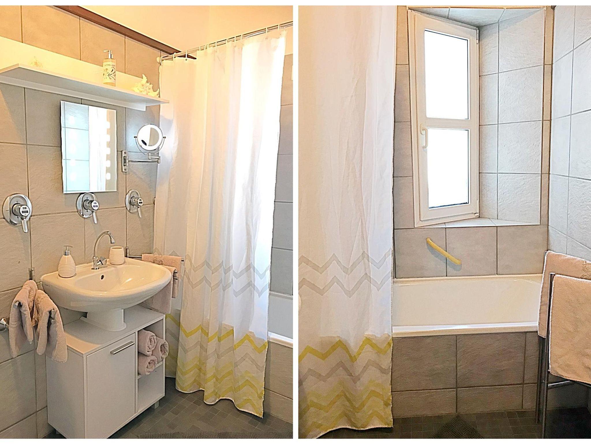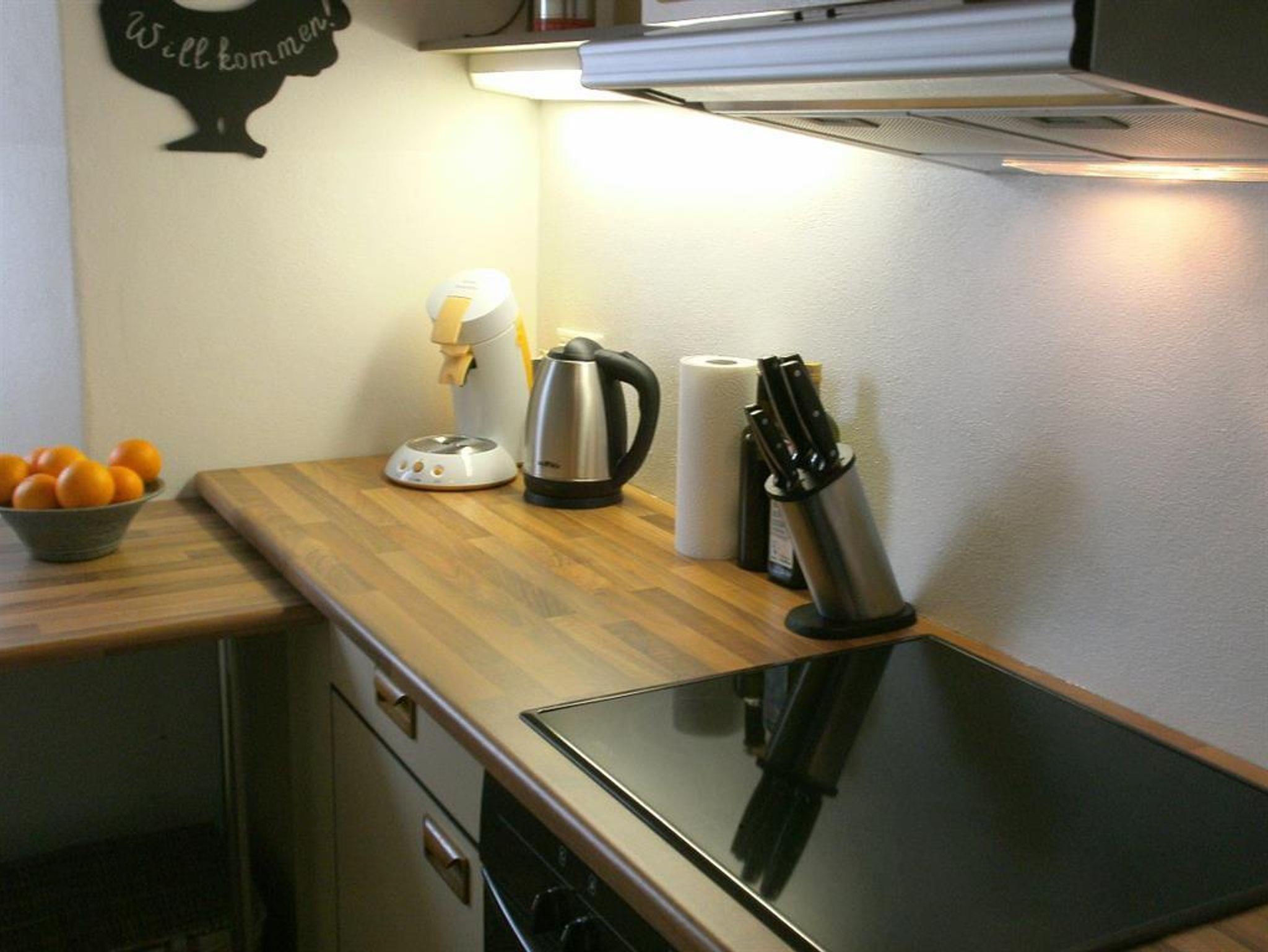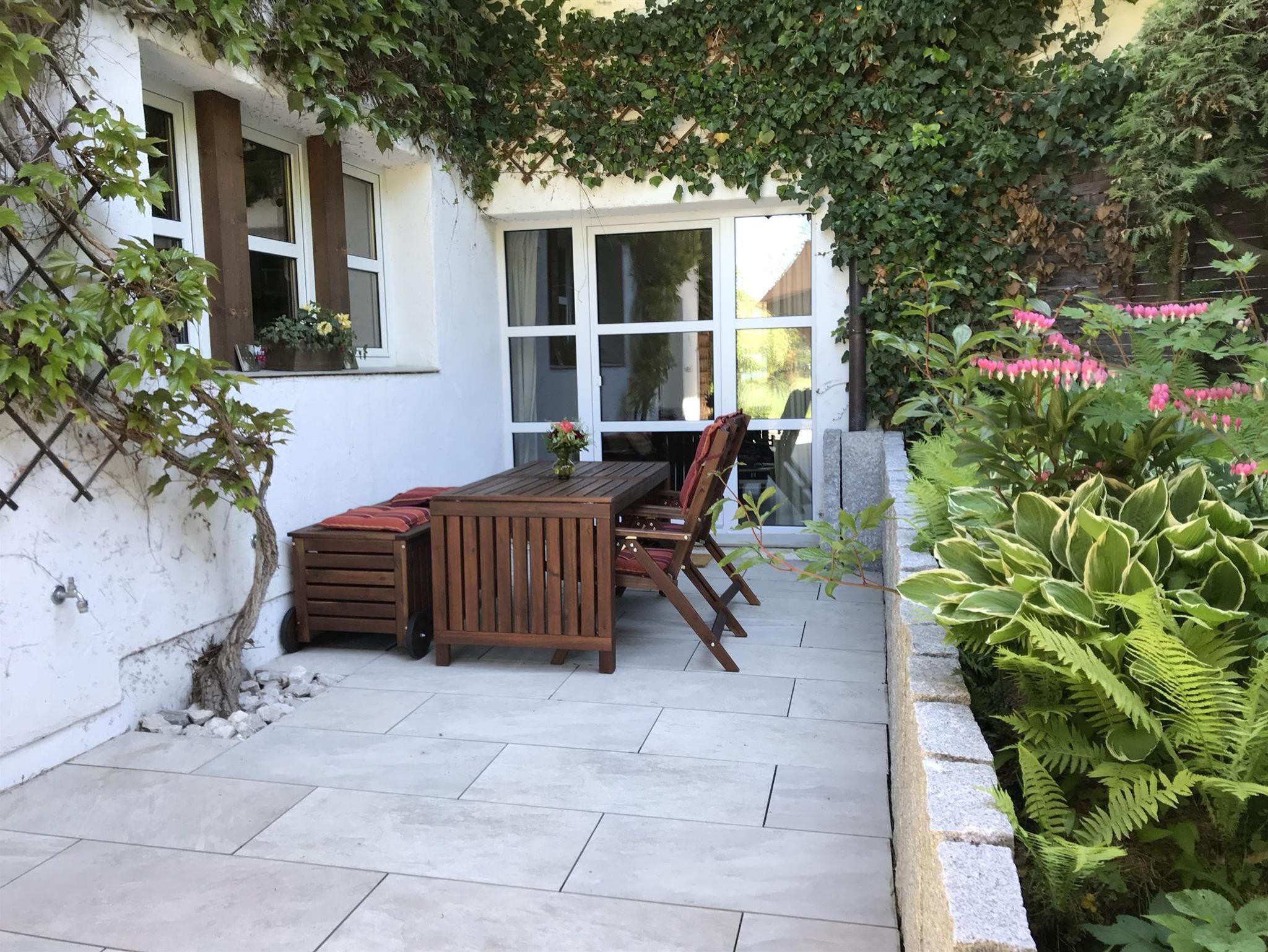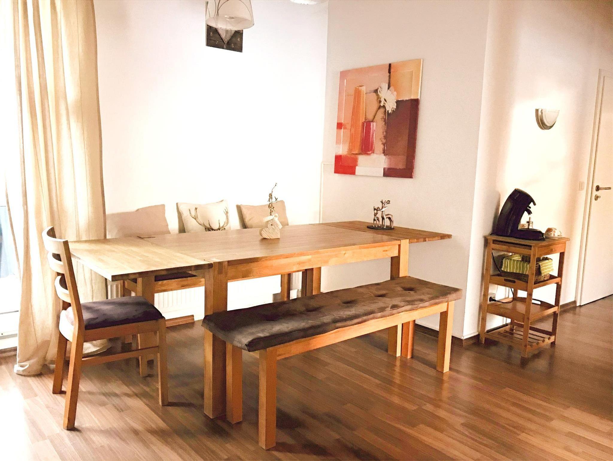 Im Wohnzimmer ermöglichen eine Wohnwand im Landstil, Fernseher, CD-Anlage und Sofa einen gemütlichen Zeitverbleib. Die Essecke befindet sich neben der großen Fensterwand, die auf die 35 qm große sonnige Terrasse führt. Bad und Toilette sind getrennt.