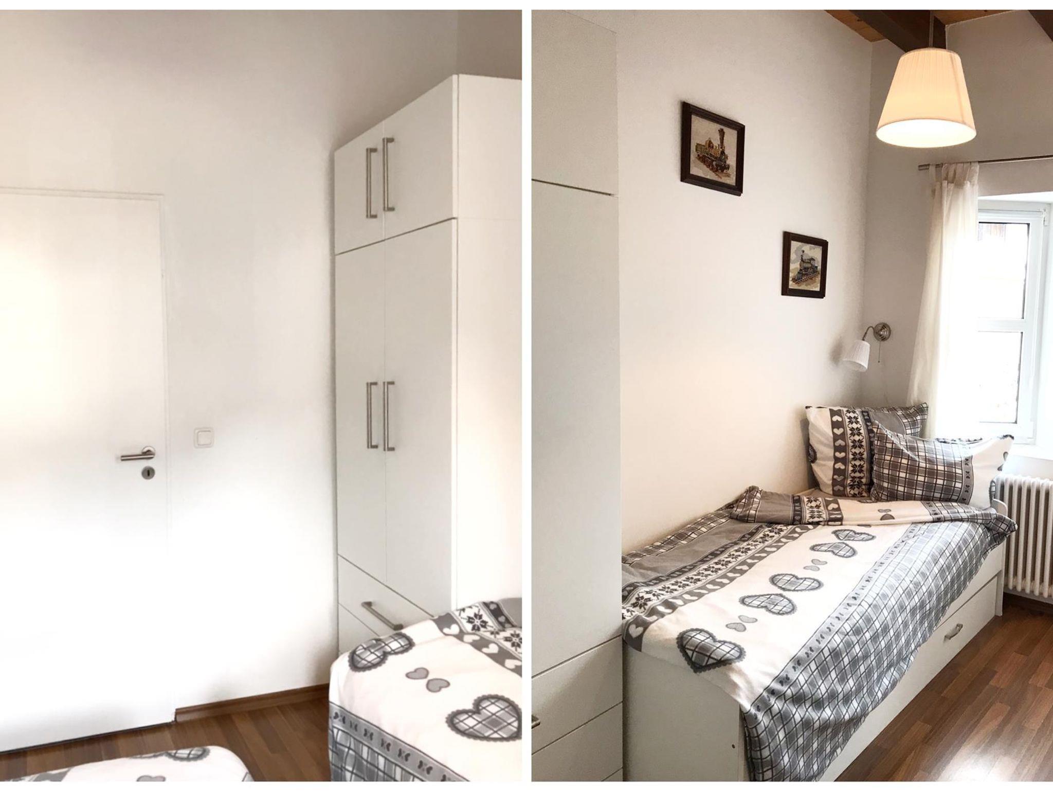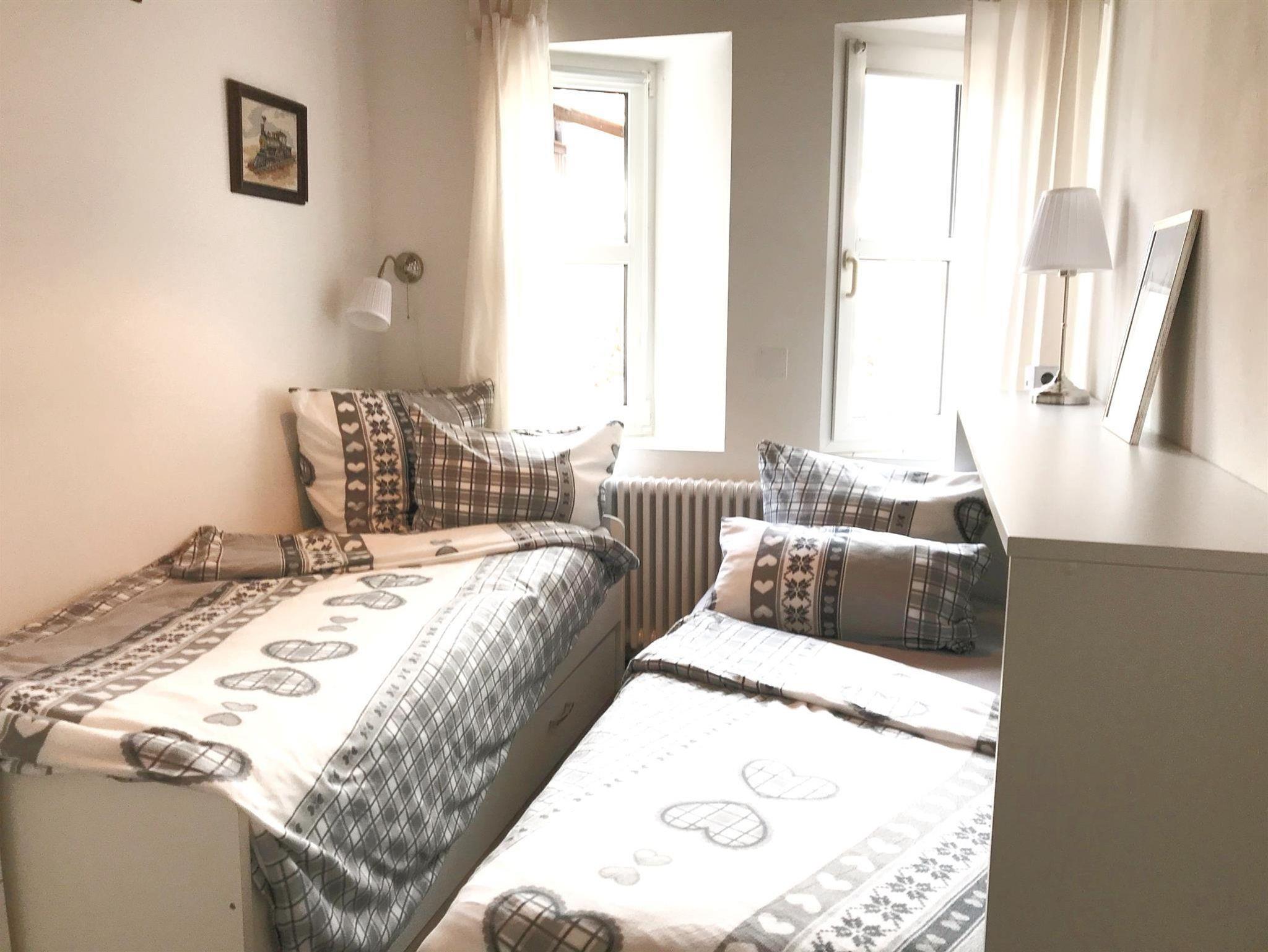 Ein großes Schlafzimmer ist mit einem Doppelbett, Nachtkästchen und einem Schrank ausgestattet. In kleinerem Schlafzimmer steht ein Einzelbett, welches unten zum weiterem Schlafplatz ausgezogen werden kann, und eine Kommode.