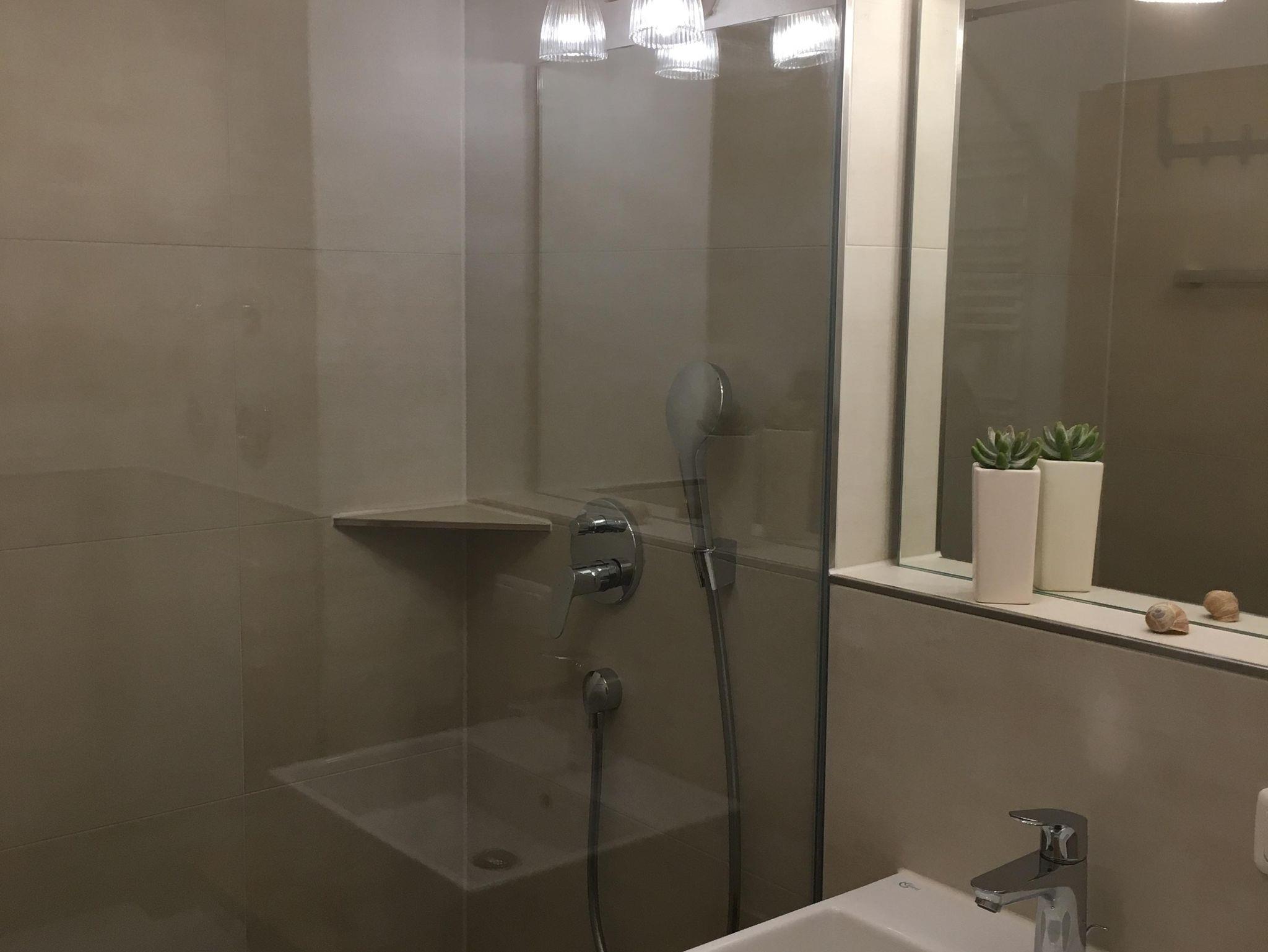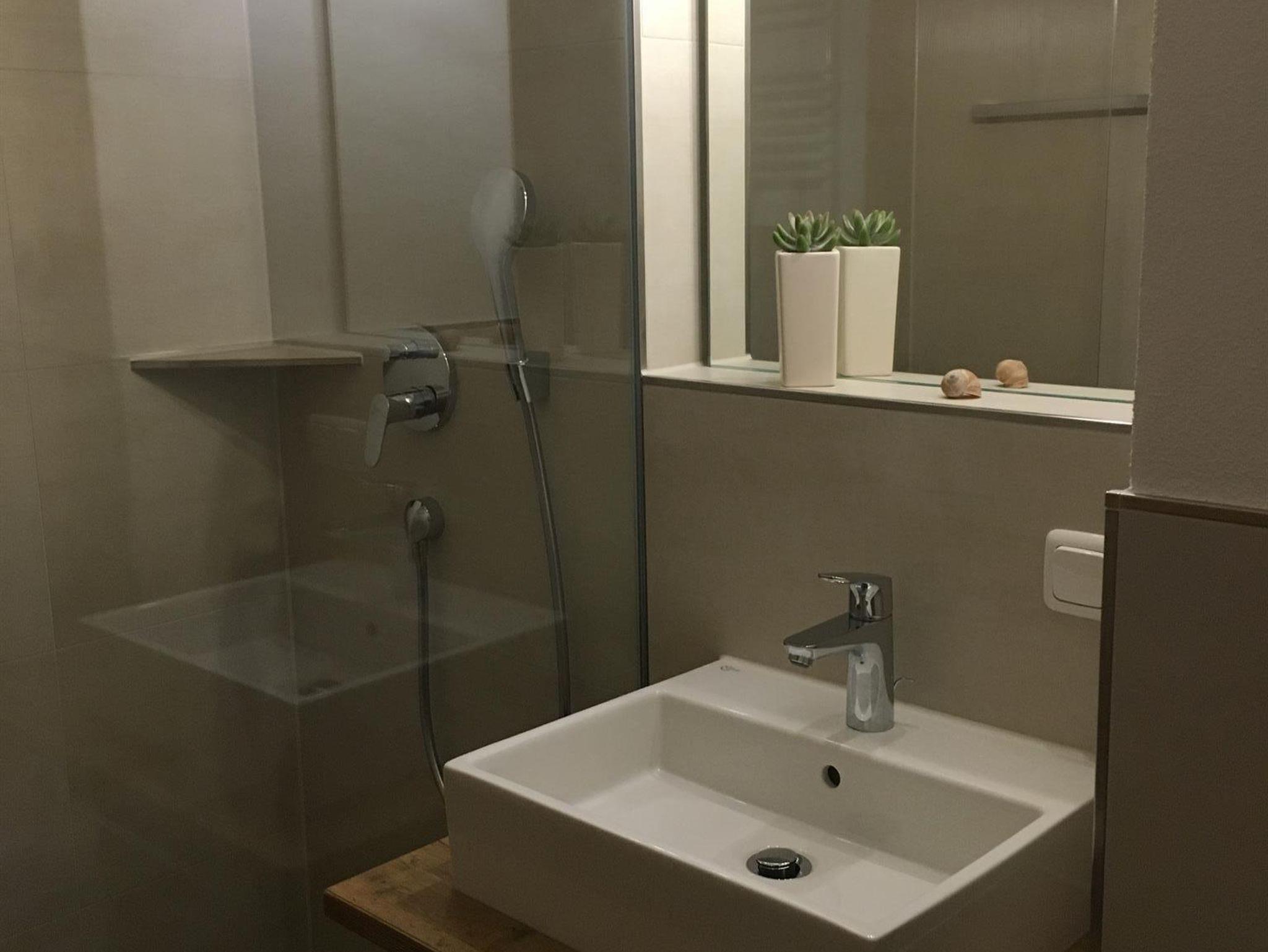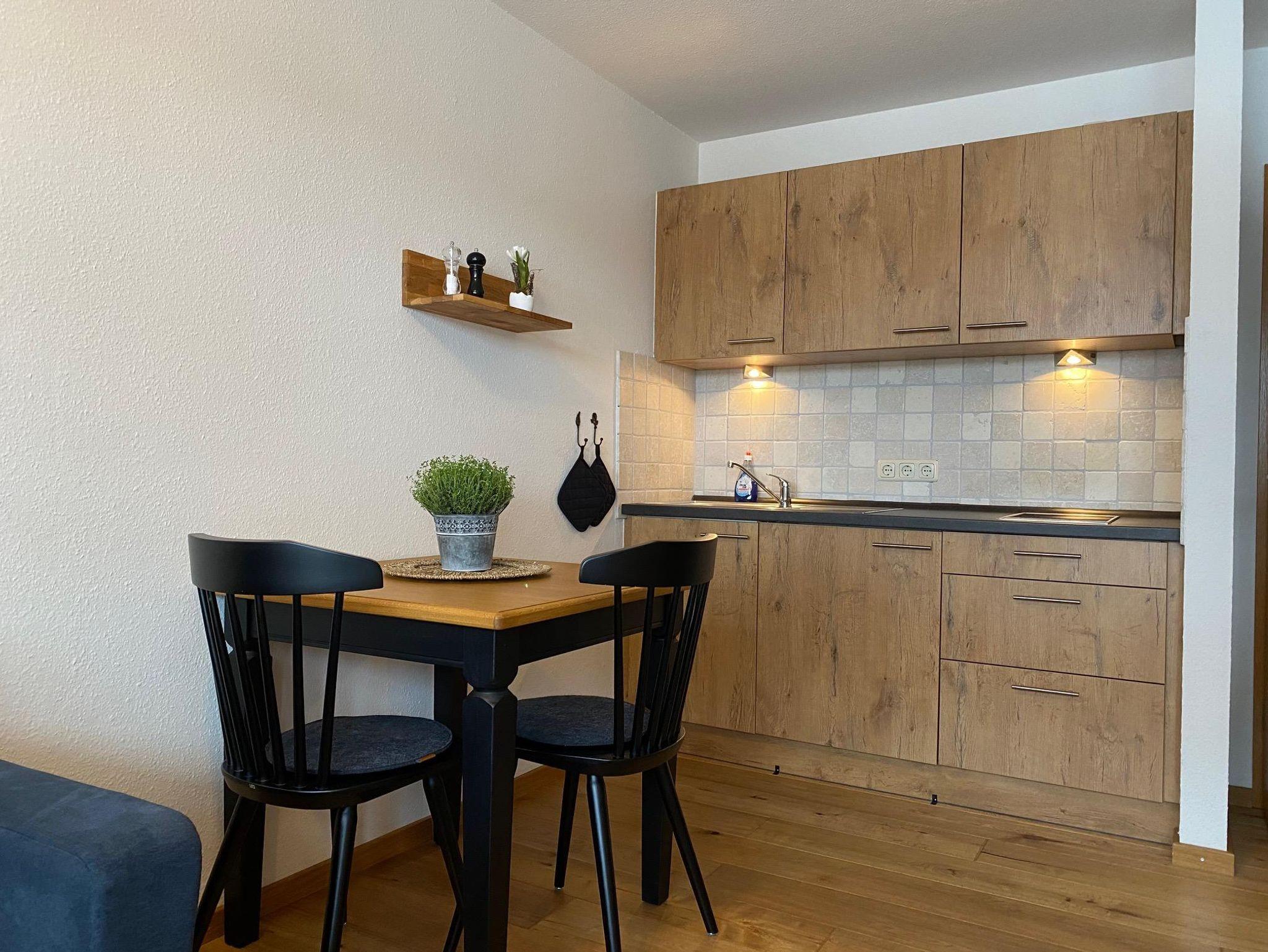 Ausgestattet ist das Appartement mit einem Schrankdoppelbett (Fußenden offen), einer Küchenzeile, Esstisch, Couch, Flachbild-TV, Echtholzboden im Wohnbereich u. einer barrierefreien Dusche.