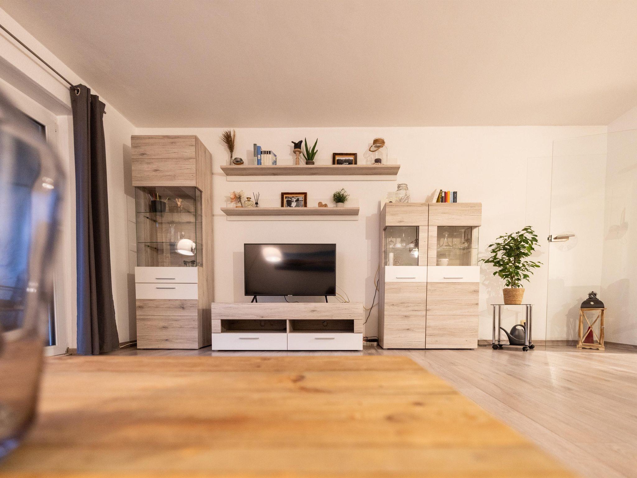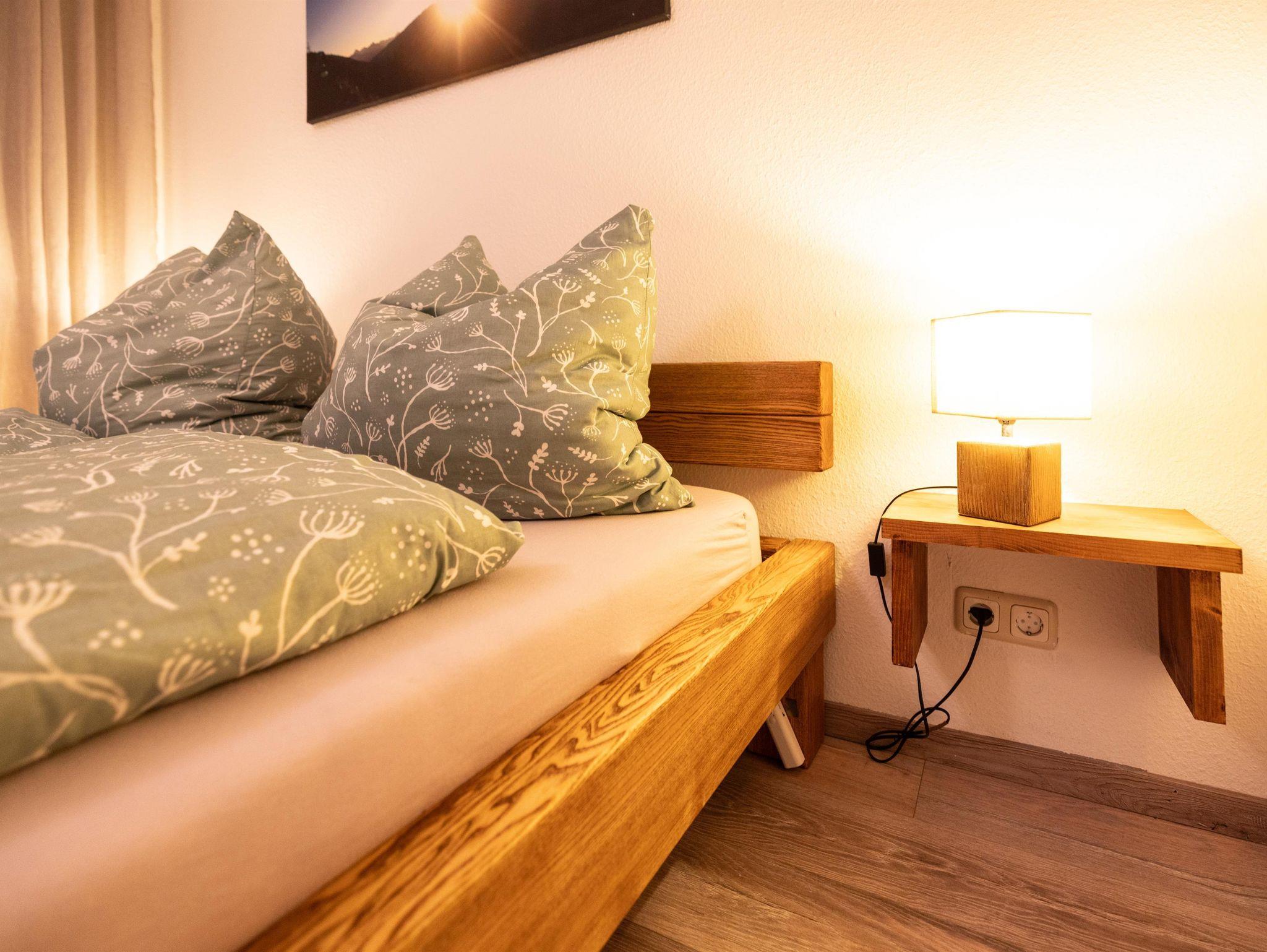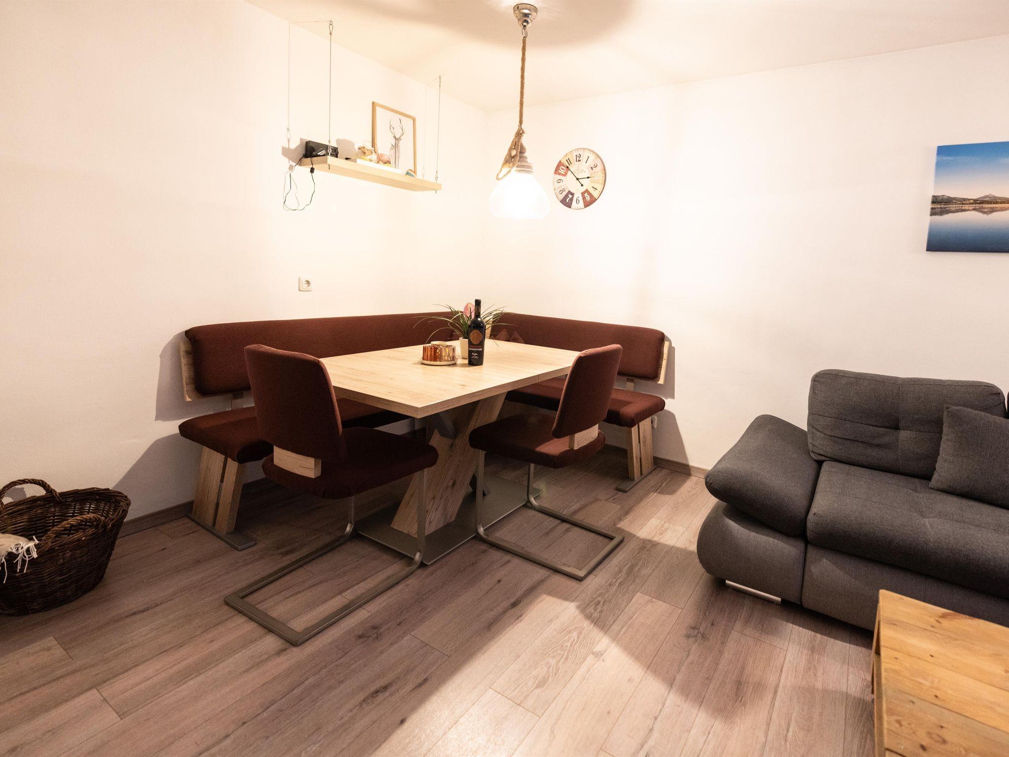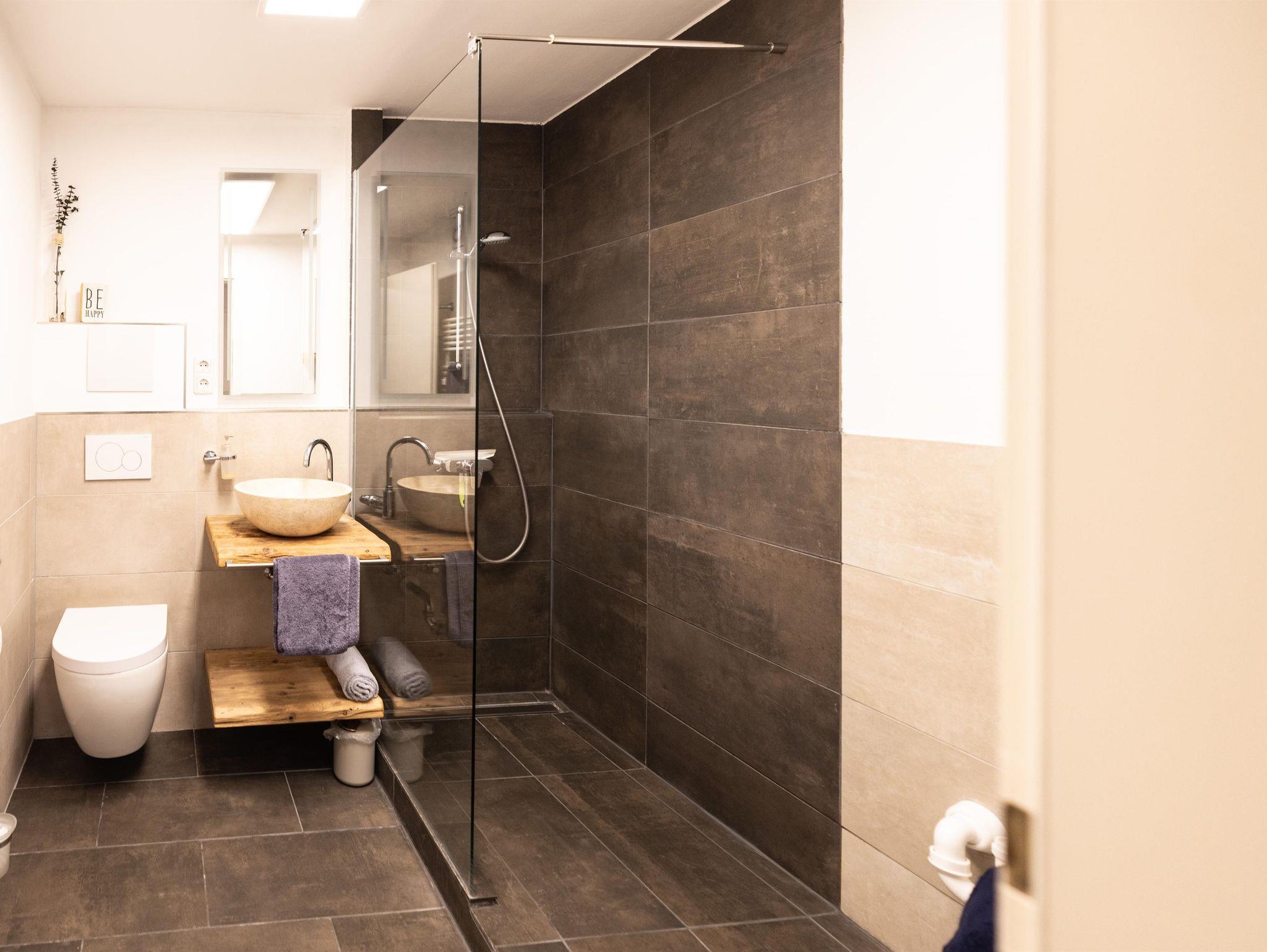 Moderne Küche mit allen üblichen Geräten, wie Kühl- und Gefrierschrank, Backofen, Toaster, Filter-Kaffeemaschine, Induktionskochfeld. Alpenländisch eingerichtetes separates Schlafzimmer und zwei zusätzliche Schlafplätze auf der Couch im Wohnbereich. Modernes Badezimmer mit bodenebener Dusche, WC und LED-Spiegel.