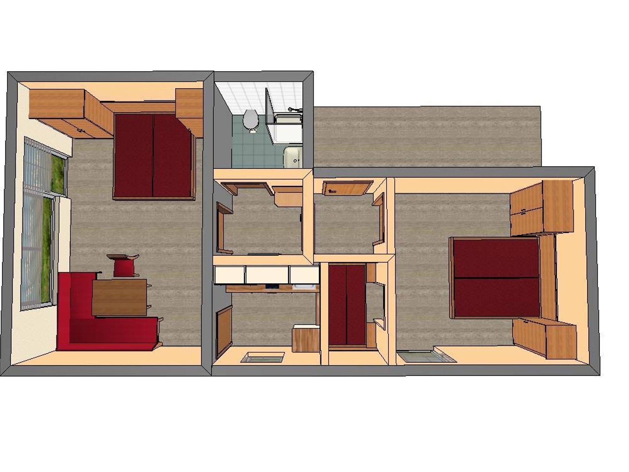 Lage: Süd-West-Seite m. Süd-u. Westbalkon, Flur, grosses Wohn-/Schlafzimmer mit Schrankbett, wunderschöne Sitzgarnitur, Fensterfront u. Türe zum grossen Südbalkon. Komplett eingerichtete Küche mit Dunstabzug, Spühlmasch. und Kühlschrank mit Gefriermöglichkeit, seperates Schlafzimmer, Dusche und WC.