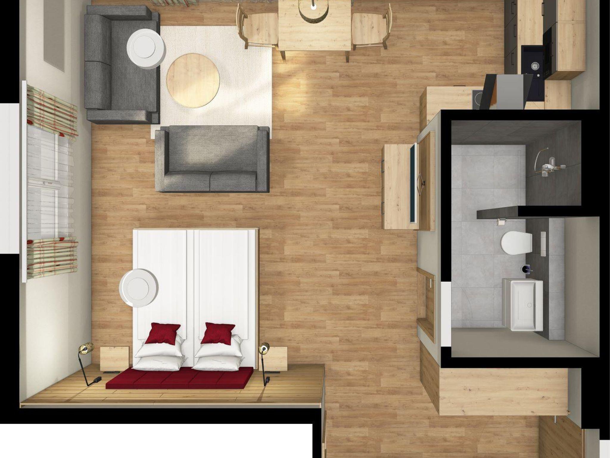 Geräumiges Appartement (42 m²) für 2-3 Personen. Wohn-Schlafraum mit Küche (inkl. Geschirrspüler). Alle Leistungen des Hotels inklusive (Frühstück, Schwimmbad, Sauna, Fitnessraum, Hobbyraum).