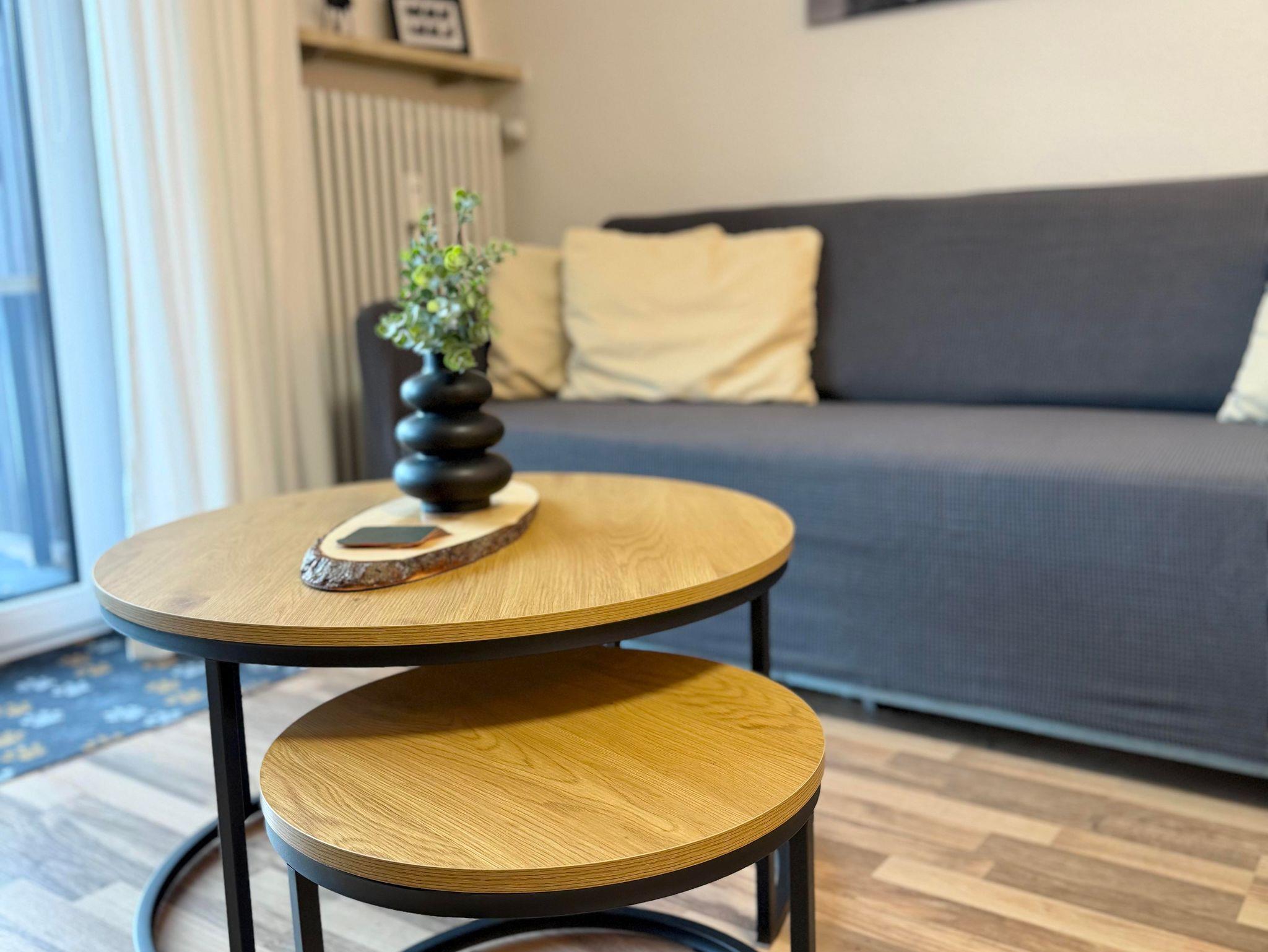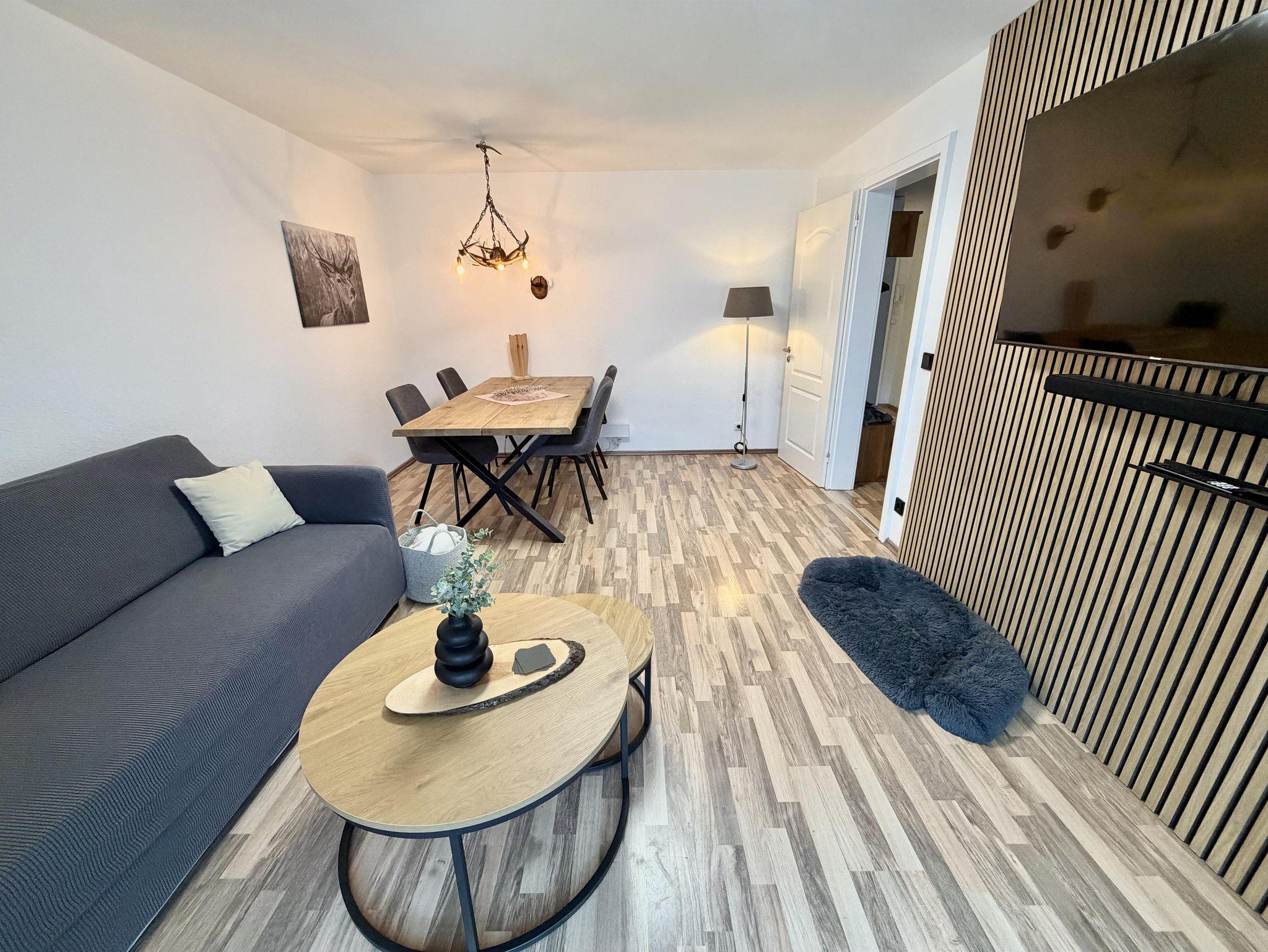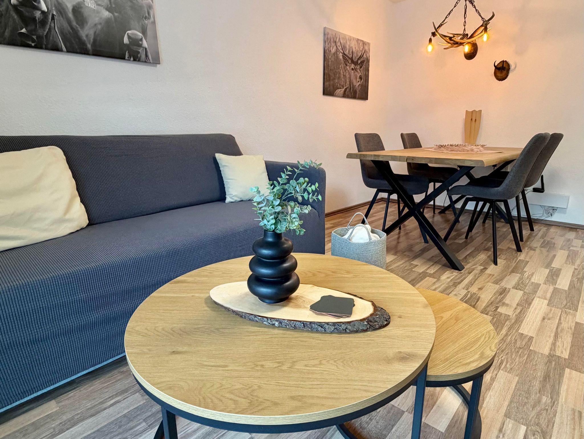 Hier befindet sich ein großer Esstisch mit vier Sitzmöglichkeiten und einer Couch mit Beistelltischen.
