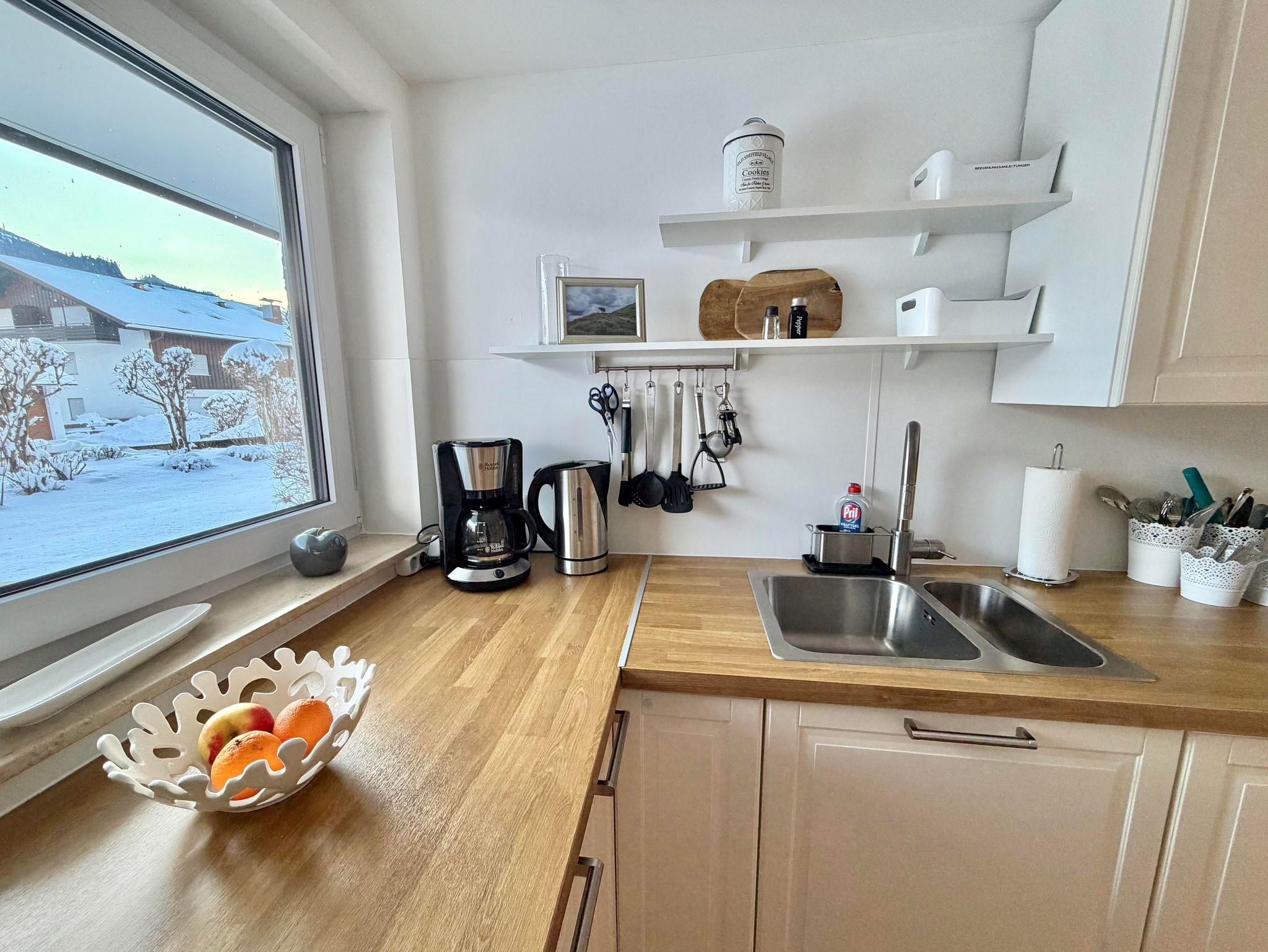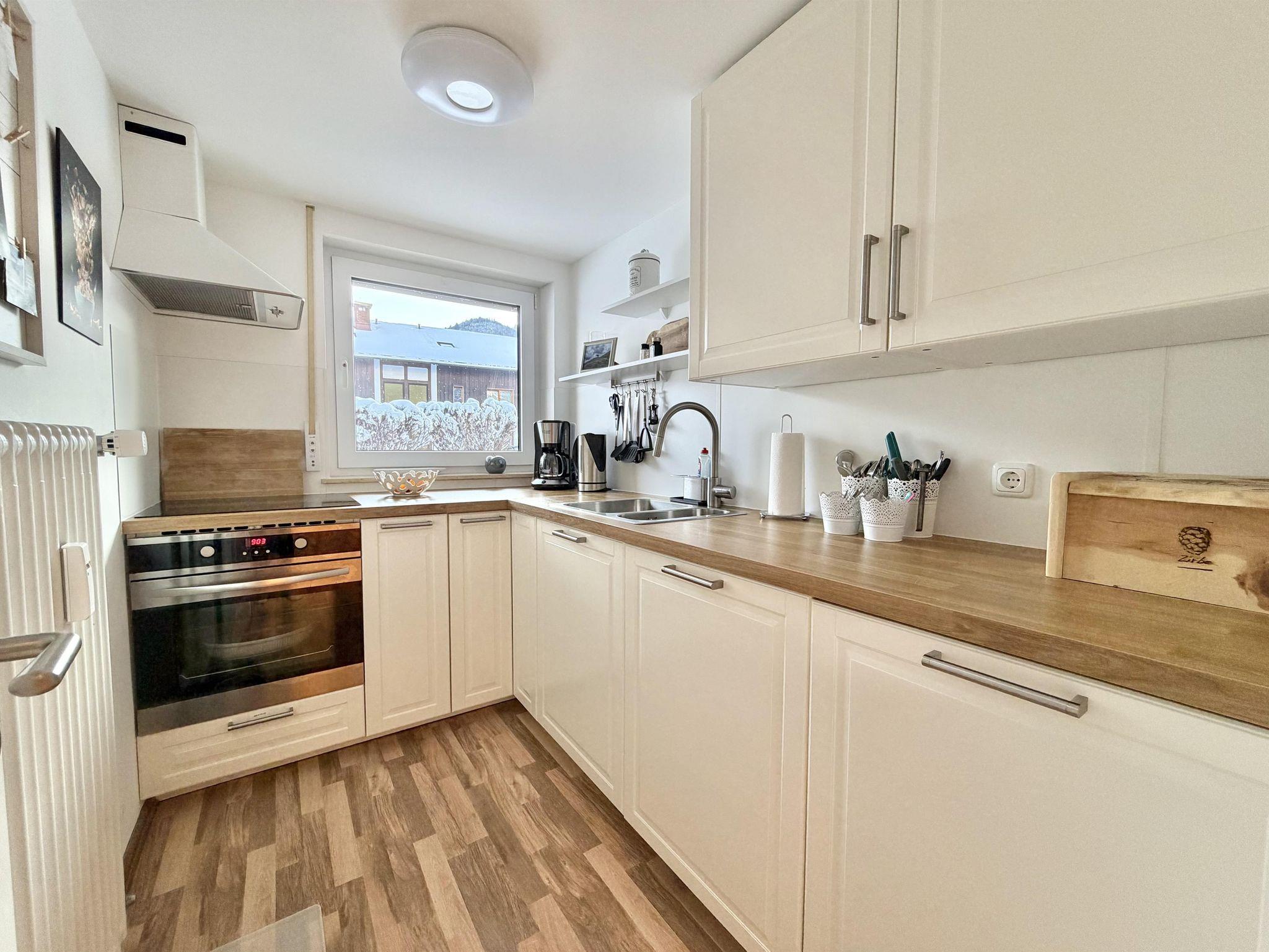 Die vollausgestattete Küche besitzt einen Herd mit Backofen, eine Geschirrspülmaschine und einen Kühlschrank mit Gefrierfach.