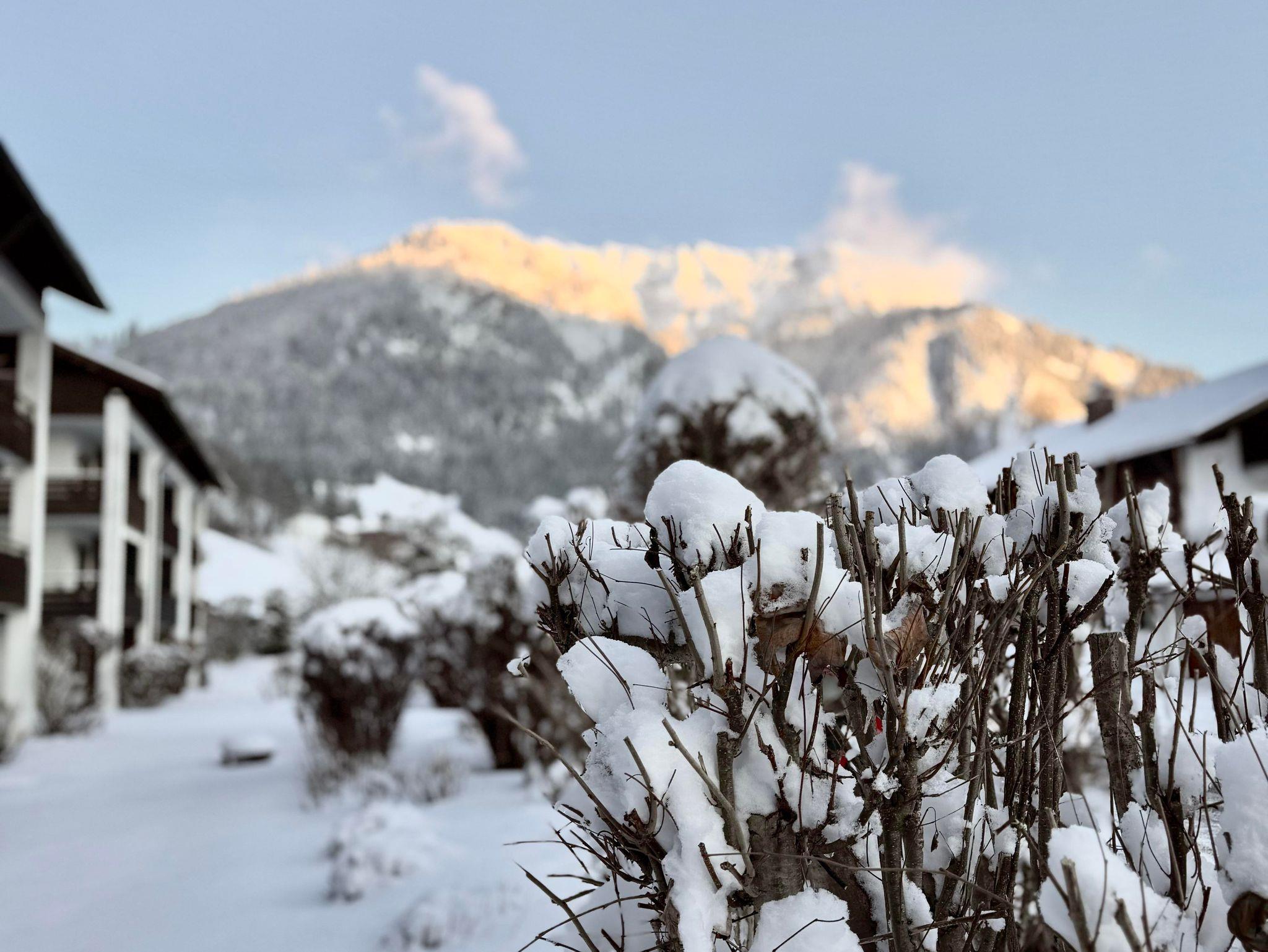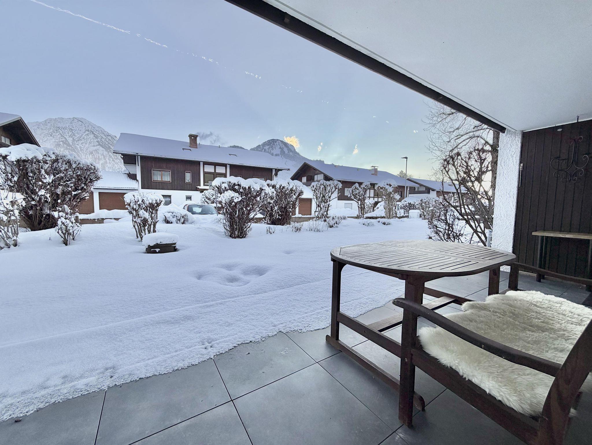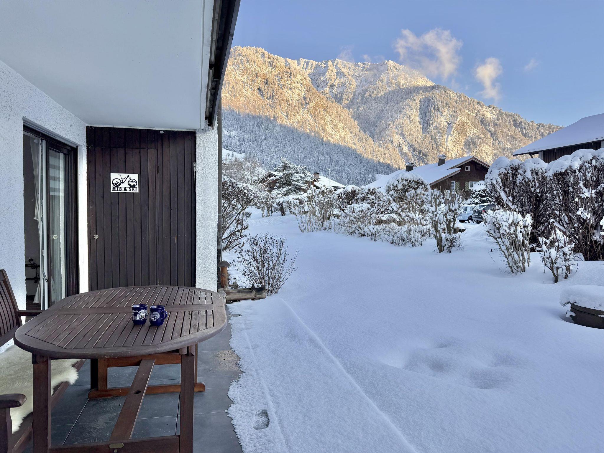 Auf der Terrasse findet ihr neben Sitzmöglichkeiten und einem eigenen, abschließbaren Ski und MTB Abstellraum auch einen herrlichen Blick in die Bad Hindelanger Berge (Liegen und Sonnenschirme vorhanden).