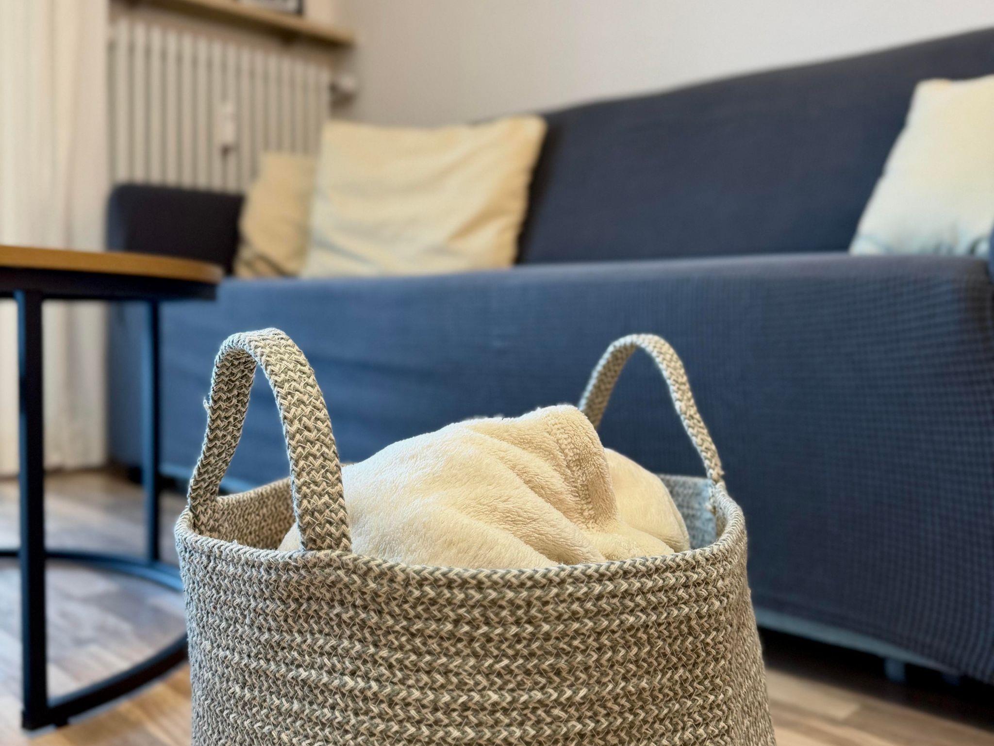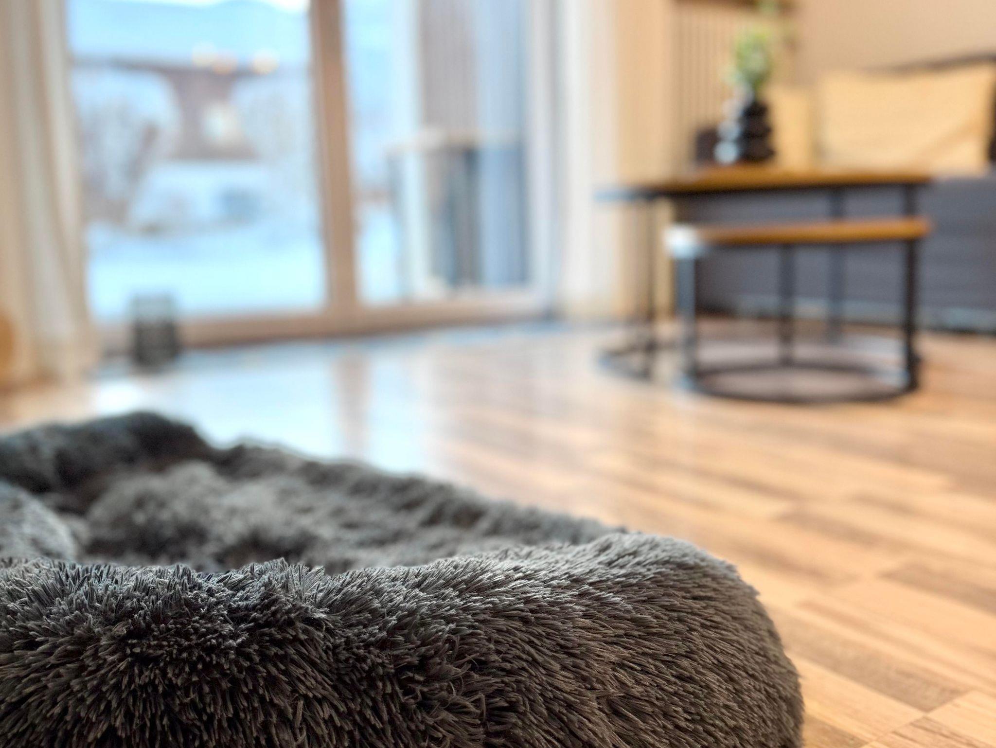 Für eure Fellnasen stehen Näpfe und ein Kuschelkissen bereit.