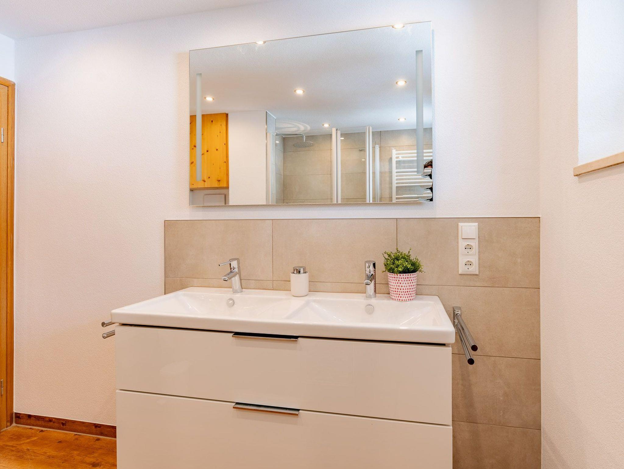 Ein freundlich und modern gestaltetes Bad mit einer Dusche, Doppelwaschbecken, WC und Föhn rundet das Angebot ab.