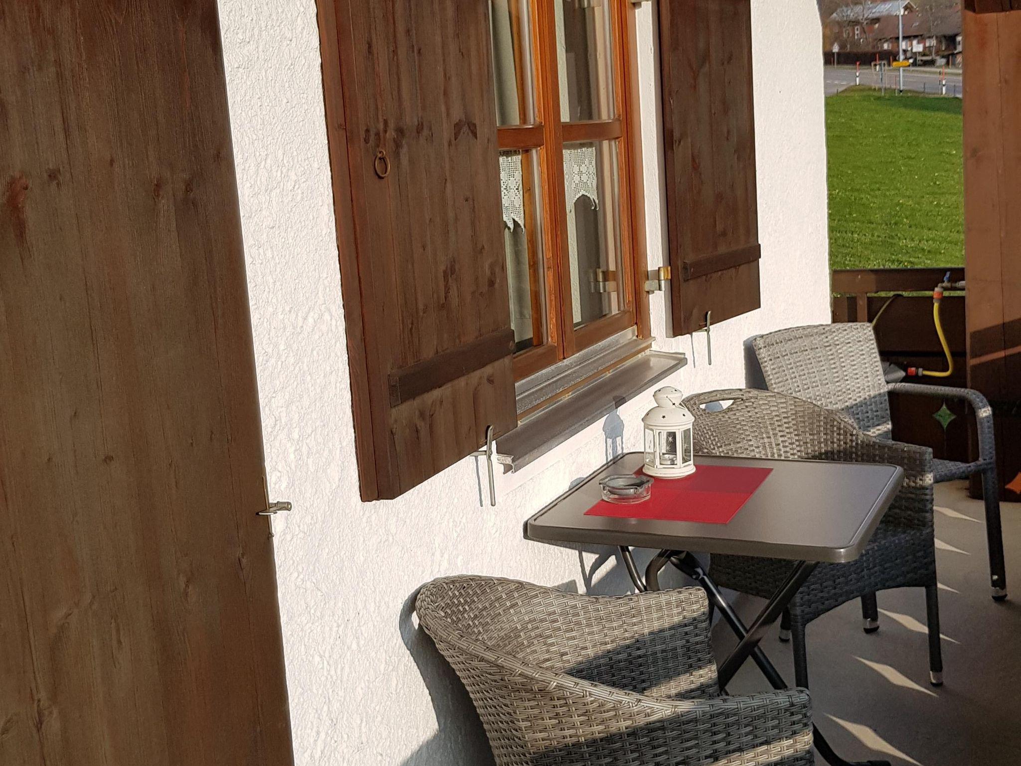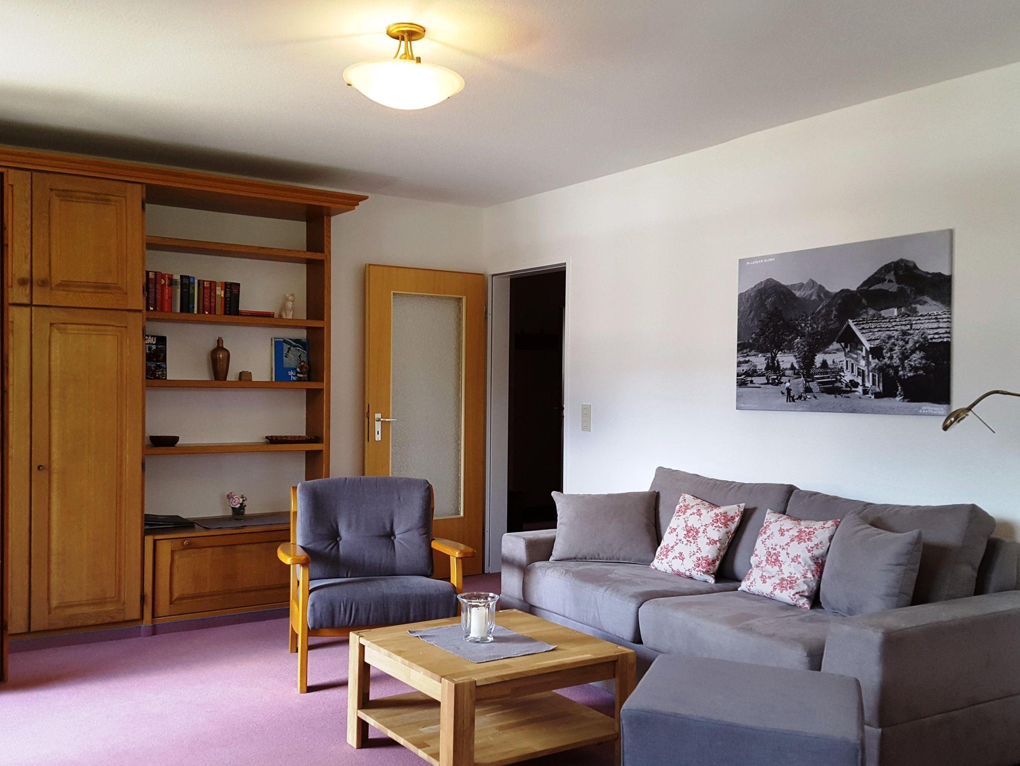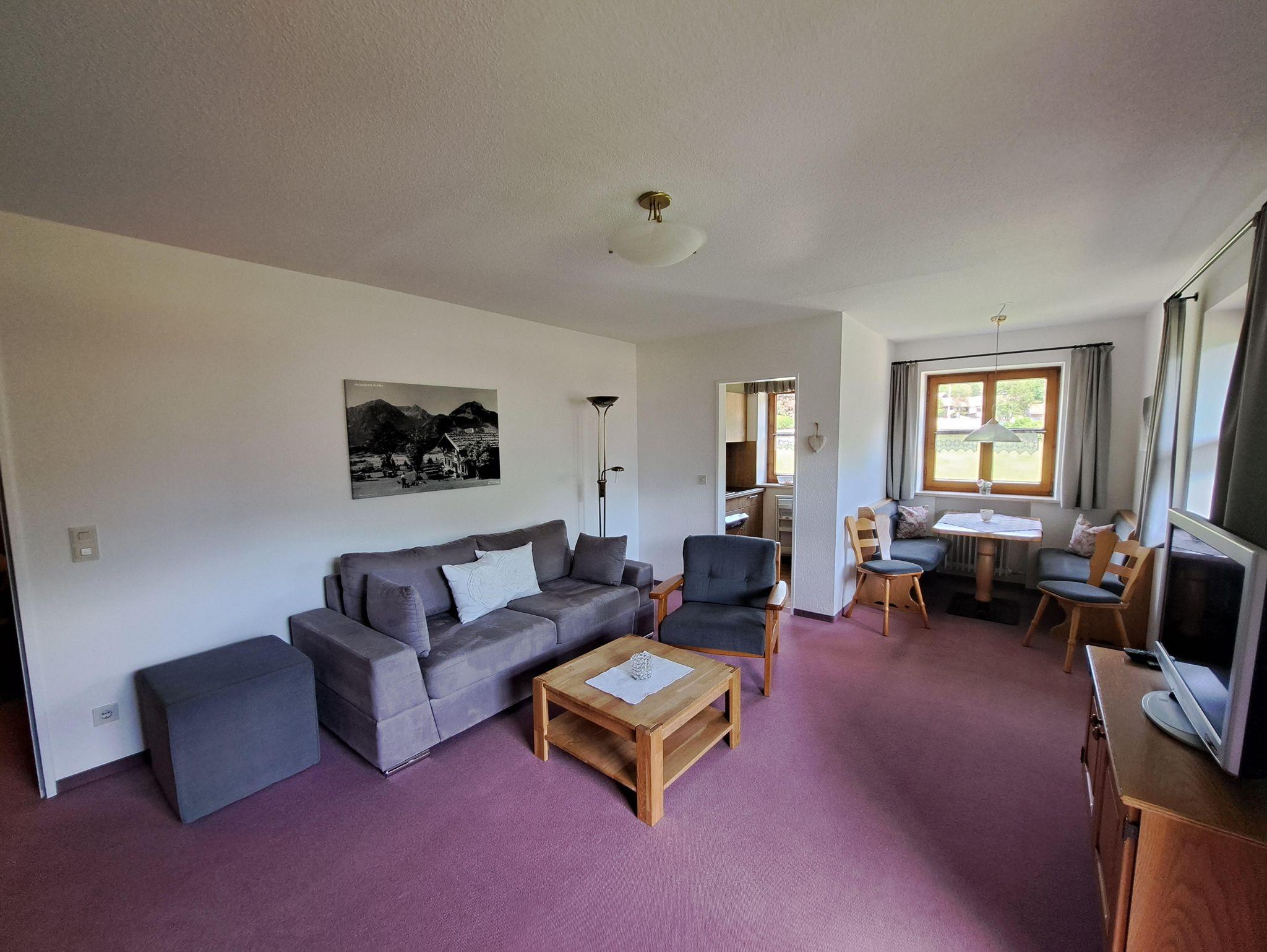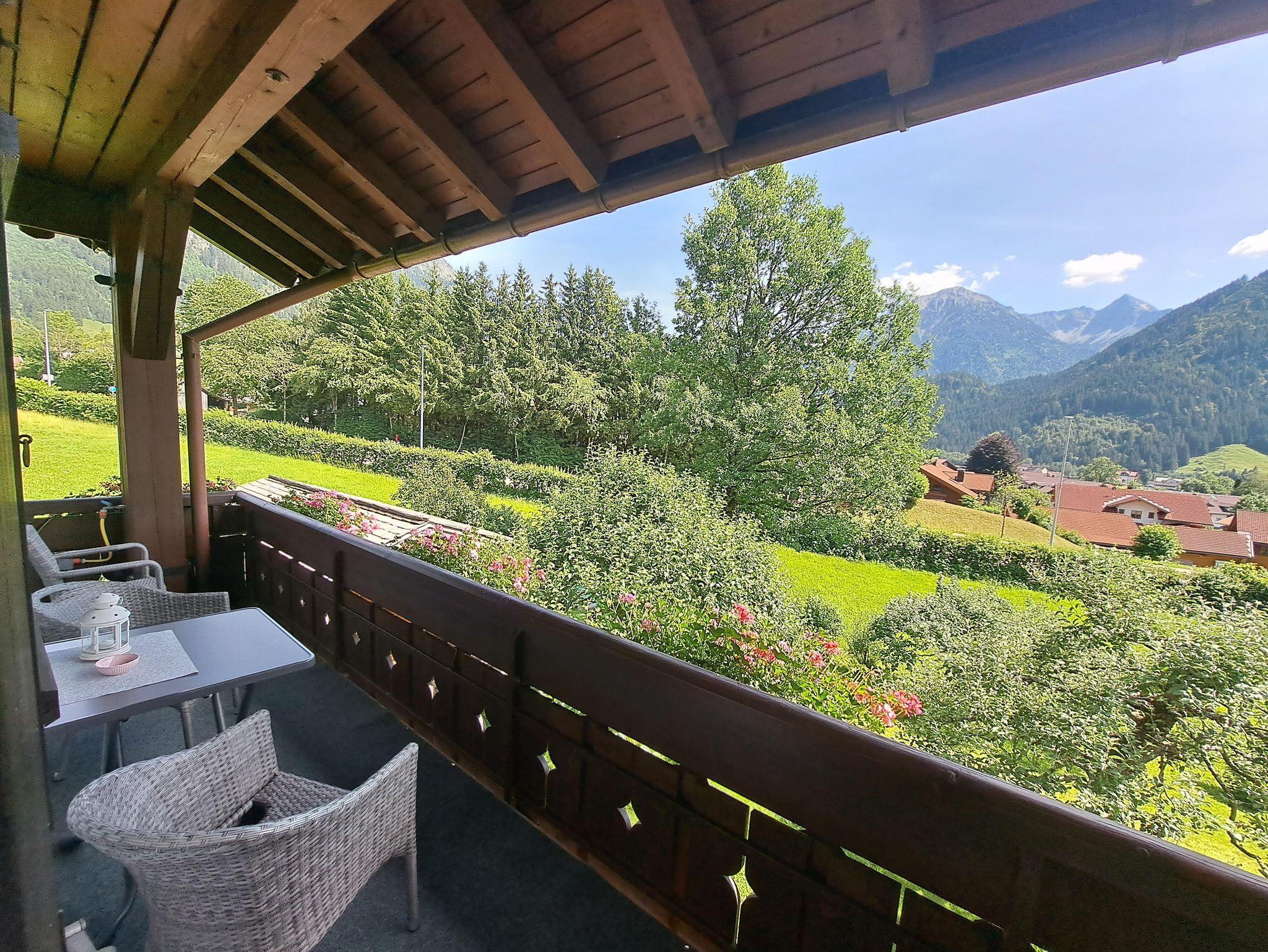 3 Sterne Ferienwohnung im 1 OG, Südbalkon, Wohnzimmer mit Ausziehcouch, Schlafzimmer, Küche, Bad-WC; Landhausstil, freie Gebirgsaussicht; keine Haustiere; auf Wunsch Allergiker Bettwäsche; Bad Hindelang PLUS Betrieb.