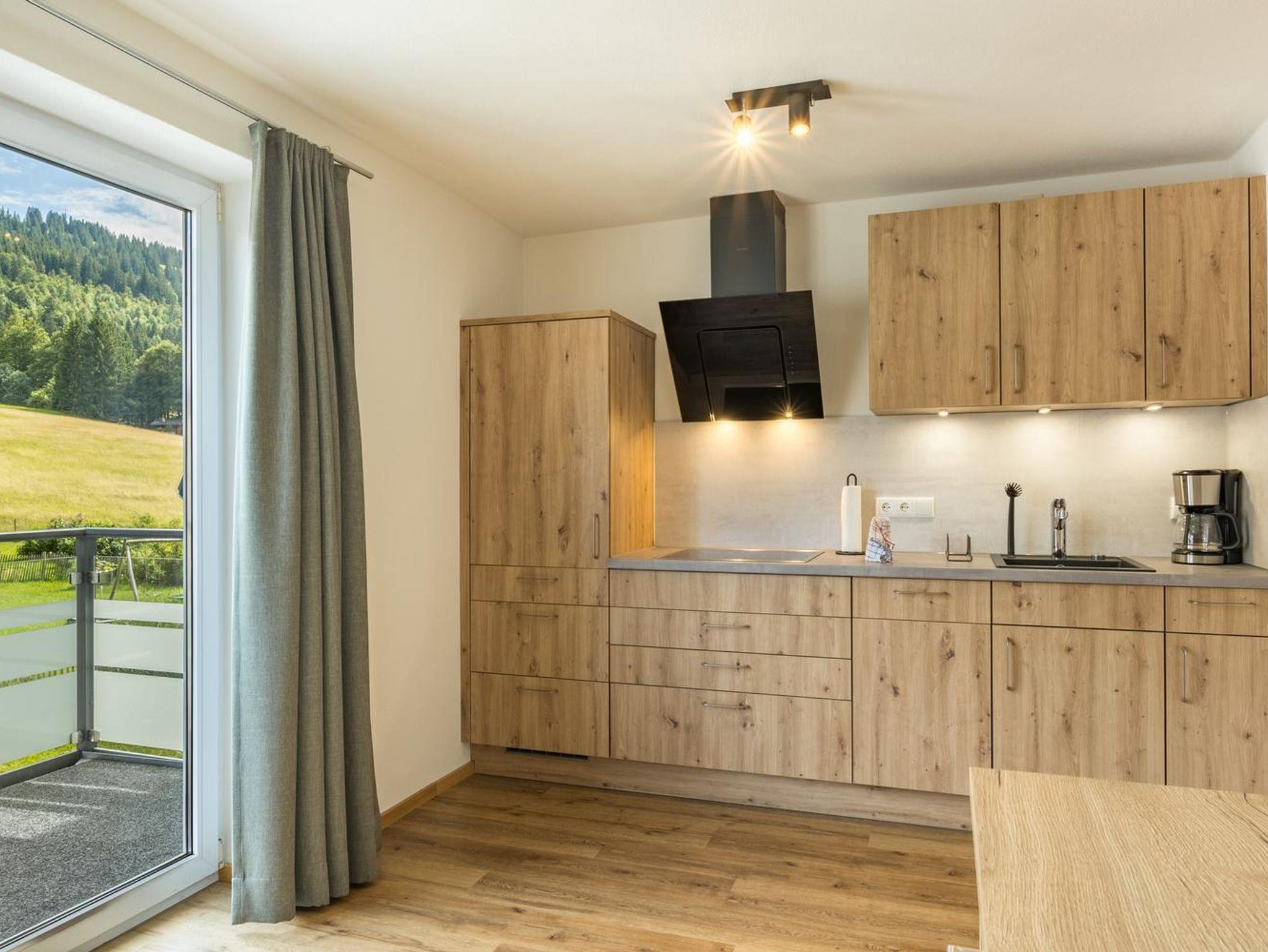 Kleines Appartement (40m²) für 2 Personen mit Wohnküche und offenem Schlafraum sowie Südbalkon mit Bergblick.