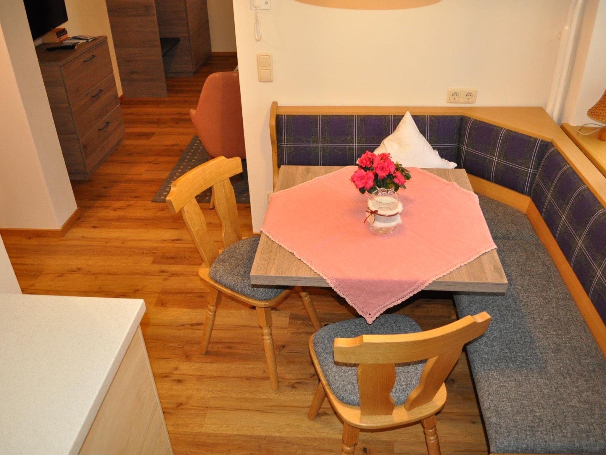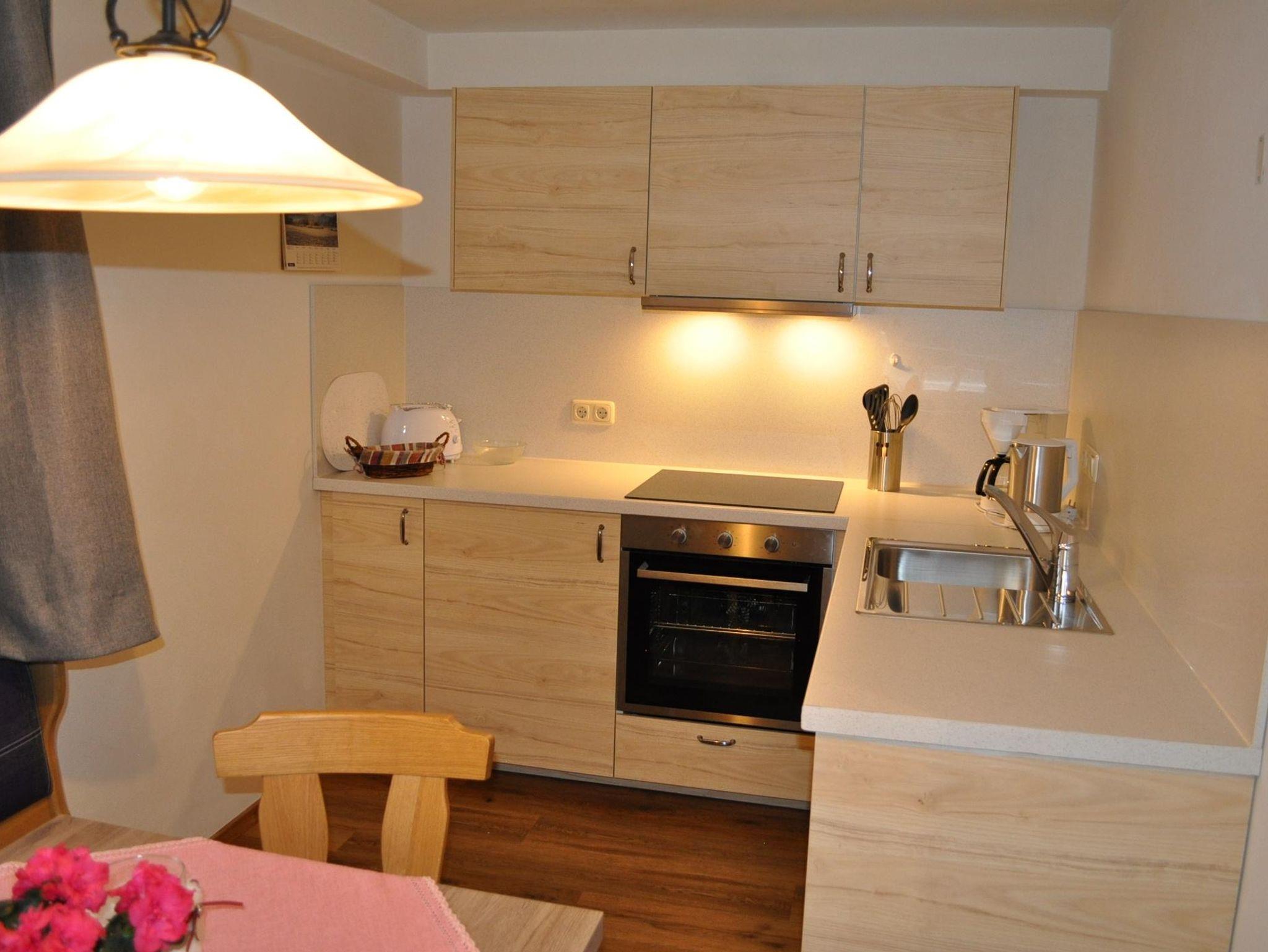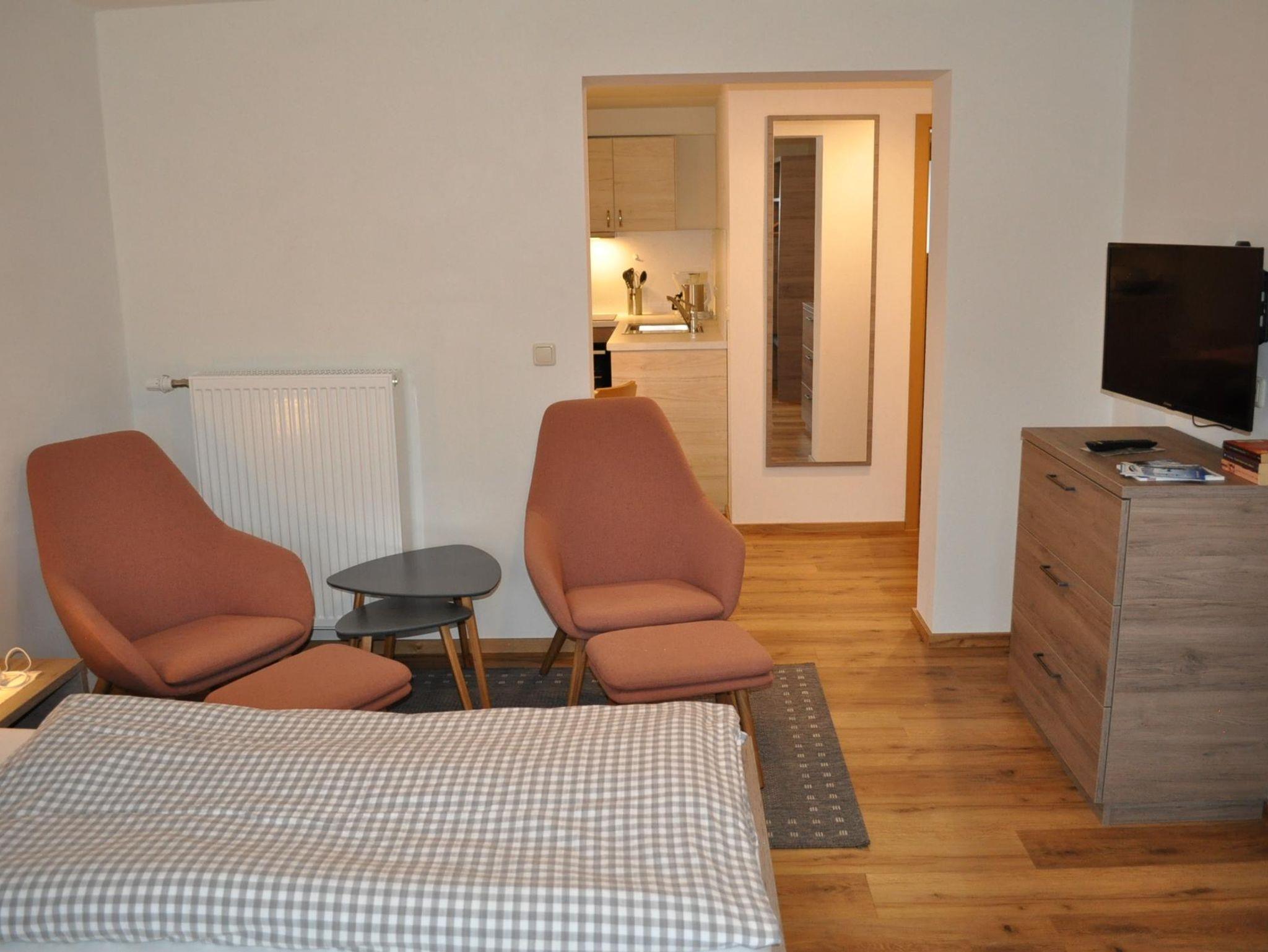 Neue Ferienwohnung mit Südbalkon, Wohn-Schlafraum, Wohnküche, Dusche und WC.