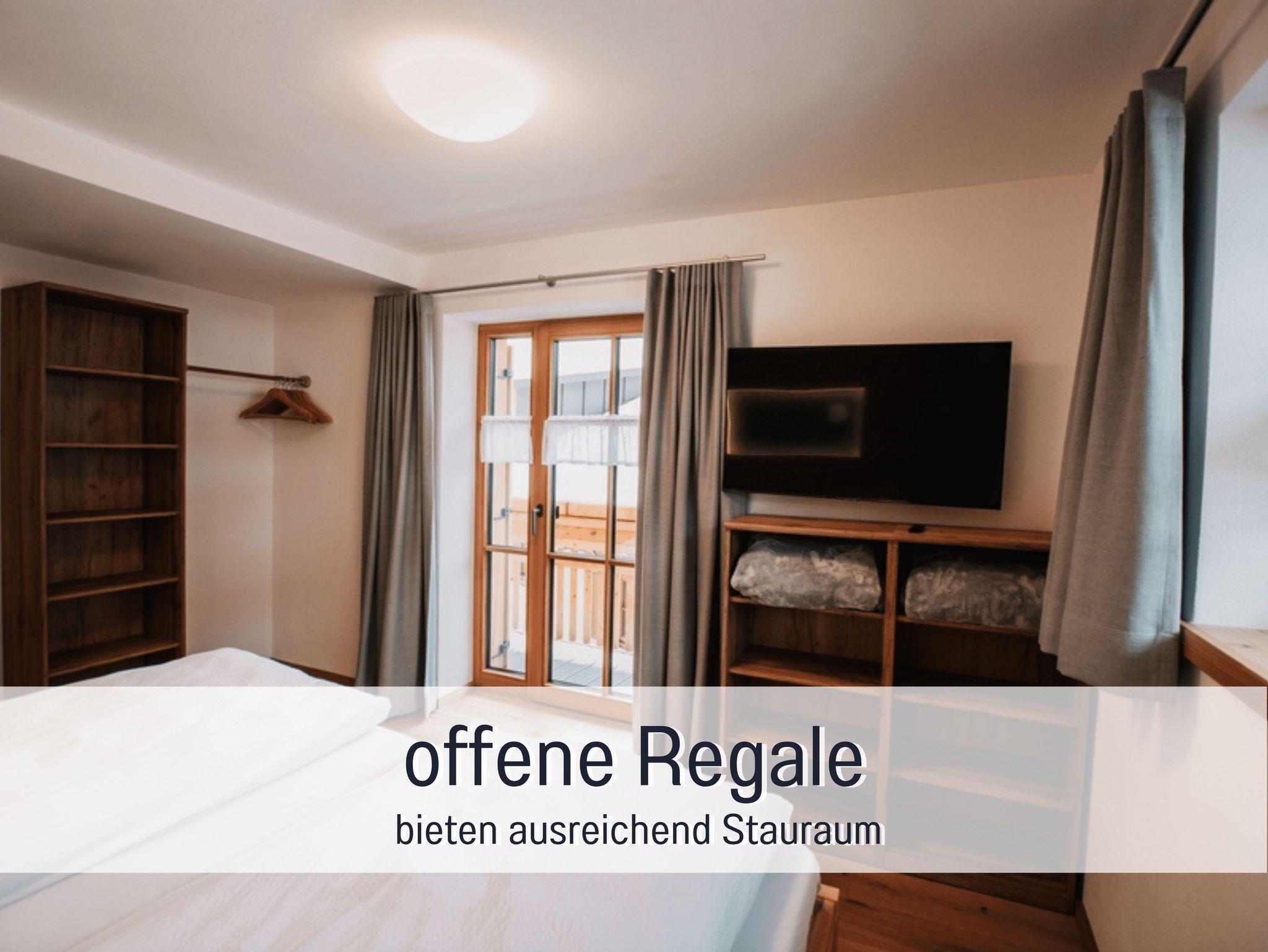 • ein Schlafzimmer mit einem Doppelbett aus Zirbe in Überlänge