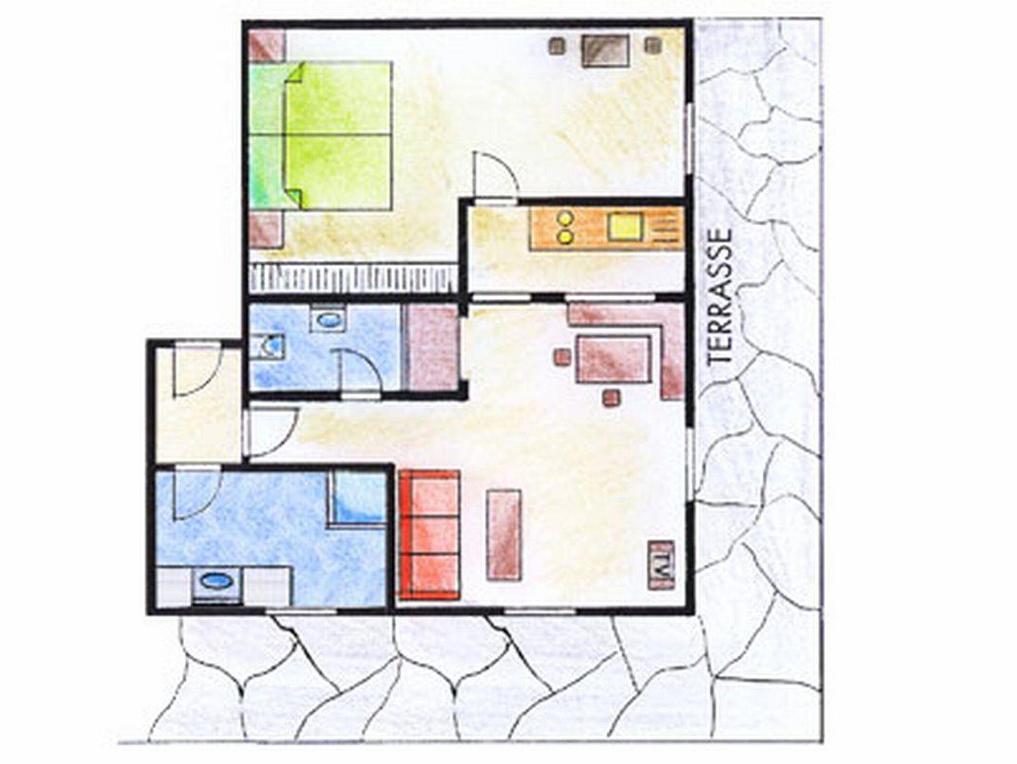 Die 46 qm-große, 4-Sterne-Wohlfühl-Ferienwohnung im Erdgeschoß für 2 Personen mit W-LAN, großer Terrasse und Garten verfügt über eine kleine Diele, ein Wohnzimmer mit Couch, Essecke mit Eckbank, SAT-TV und Stereo-Radio-DVD-Spieler sowie eine Küche mit Cerankochfeld, Mikrowelle, Spülmaschine, Kaffeemaschine und Wasser- und Eierkocher, ein geräumiges Schlafzimmer sowie Dusche und ein separates WC. Das Schlafzimmer ist sehr groß. Hier kann man bequem ein Zustell- oder ein Kinderbett aufstellen.