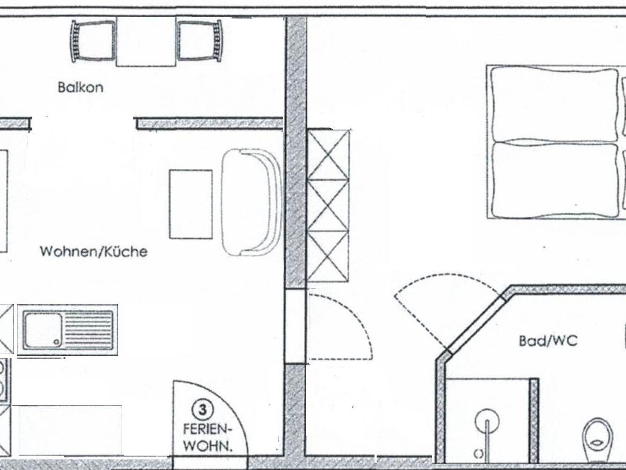 Neu renovierte Ferienwohnung im 1. Stock mit geschlossenem Süd-Balkon. Moderne Küche, sep. Schlafzimmer, Badezimmer mit Dusche/WC. Ideal kombinierbar mit dem App. Eisenbreche als zusätzliches zweites Schlafzimmer.