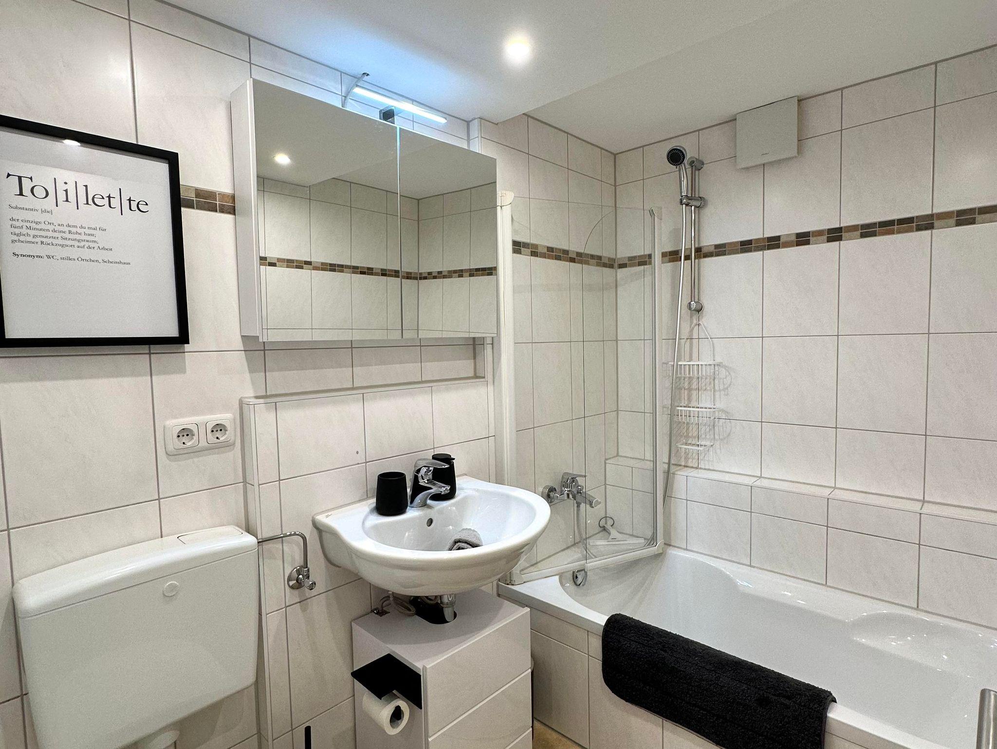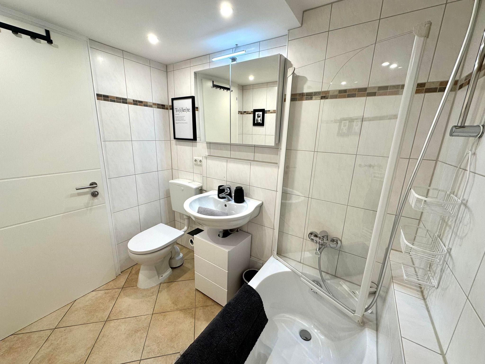 Das Badezimmer verfügt über eine begehbare Dusche, während das WC in einem separatem Raum zu finden ist (Haartrockner vorhanden).