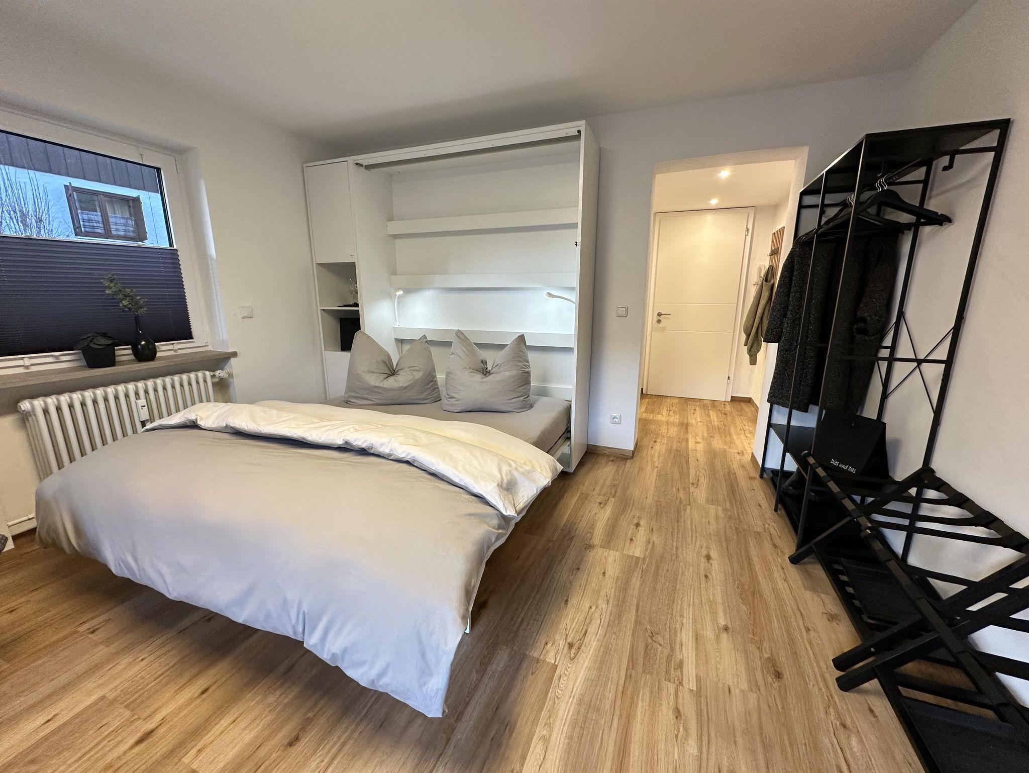 Das Schlafzimmer bietet durch einen Kleiderschrank und eine Kommode ausreichend Platz für eure Garderobe und das 180x200 cm große Bett lädt zum Kuscheln oder Fernsehen ein.