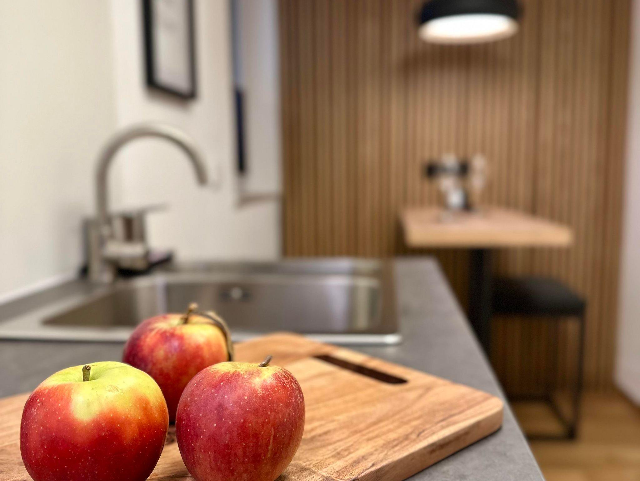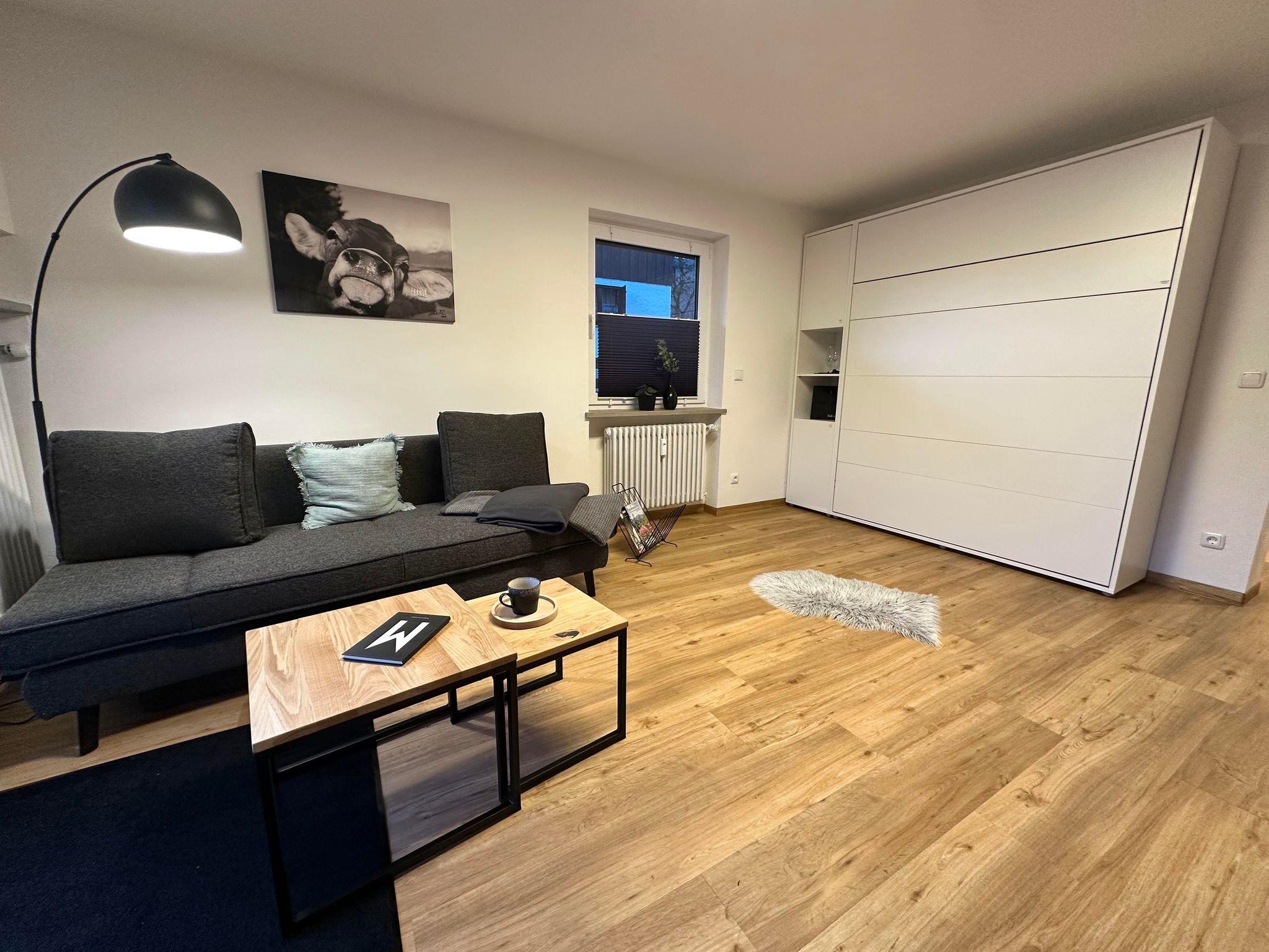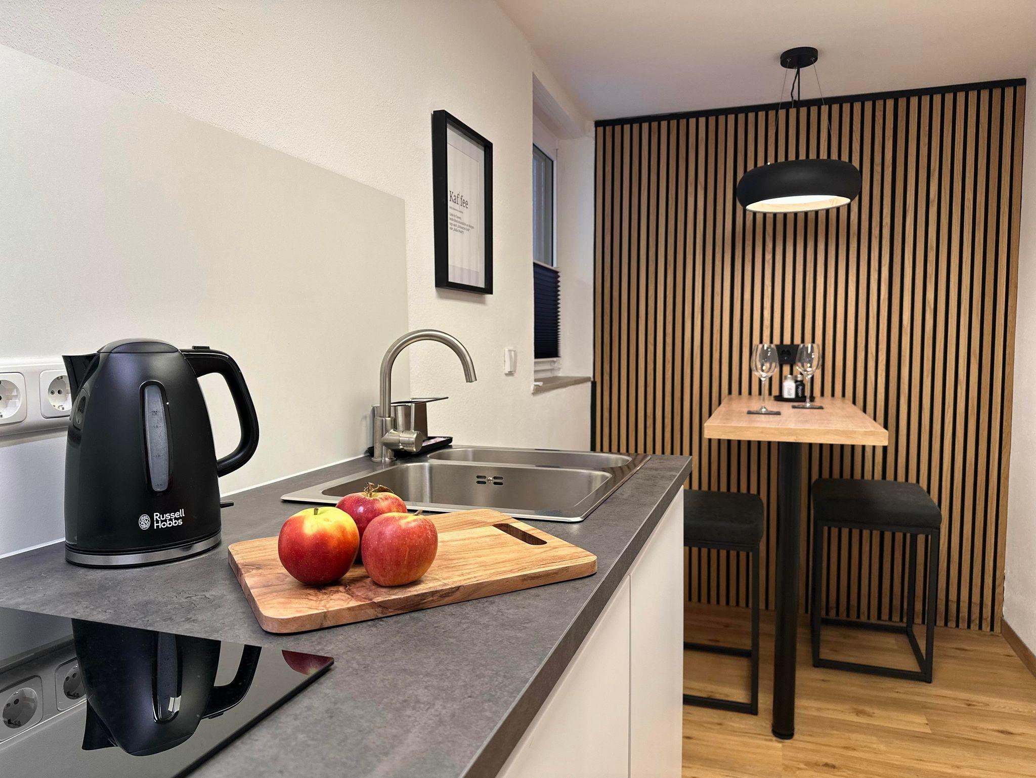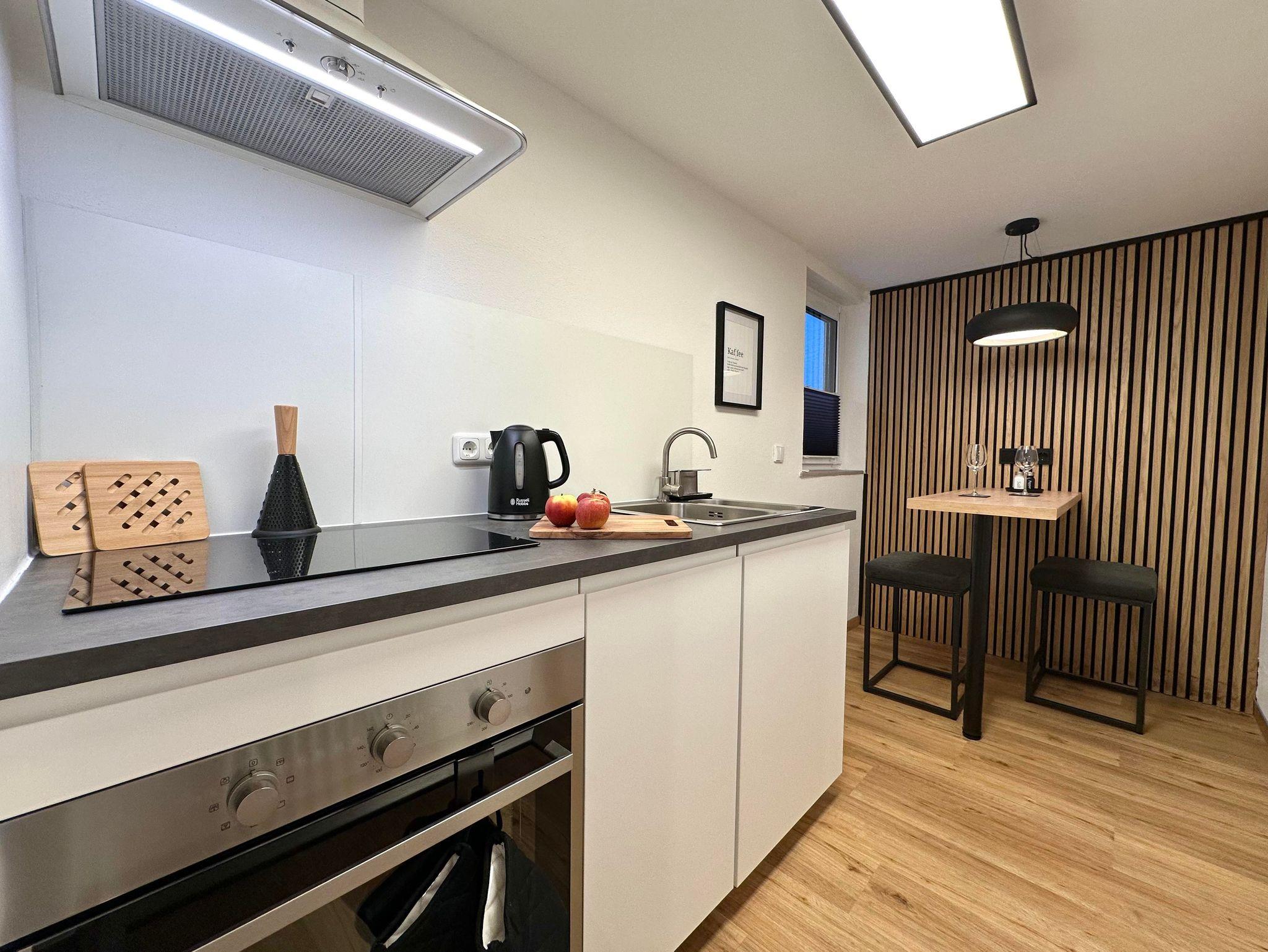 Die ca. 32 qm große Wohnung verfügt über eine vollausgestattete, moderne Küche mit gemütlicher Sitzgelegenheit für Zwei, einem Wannenbad und einem kombinierten Wohn-/ und Schlafraum.