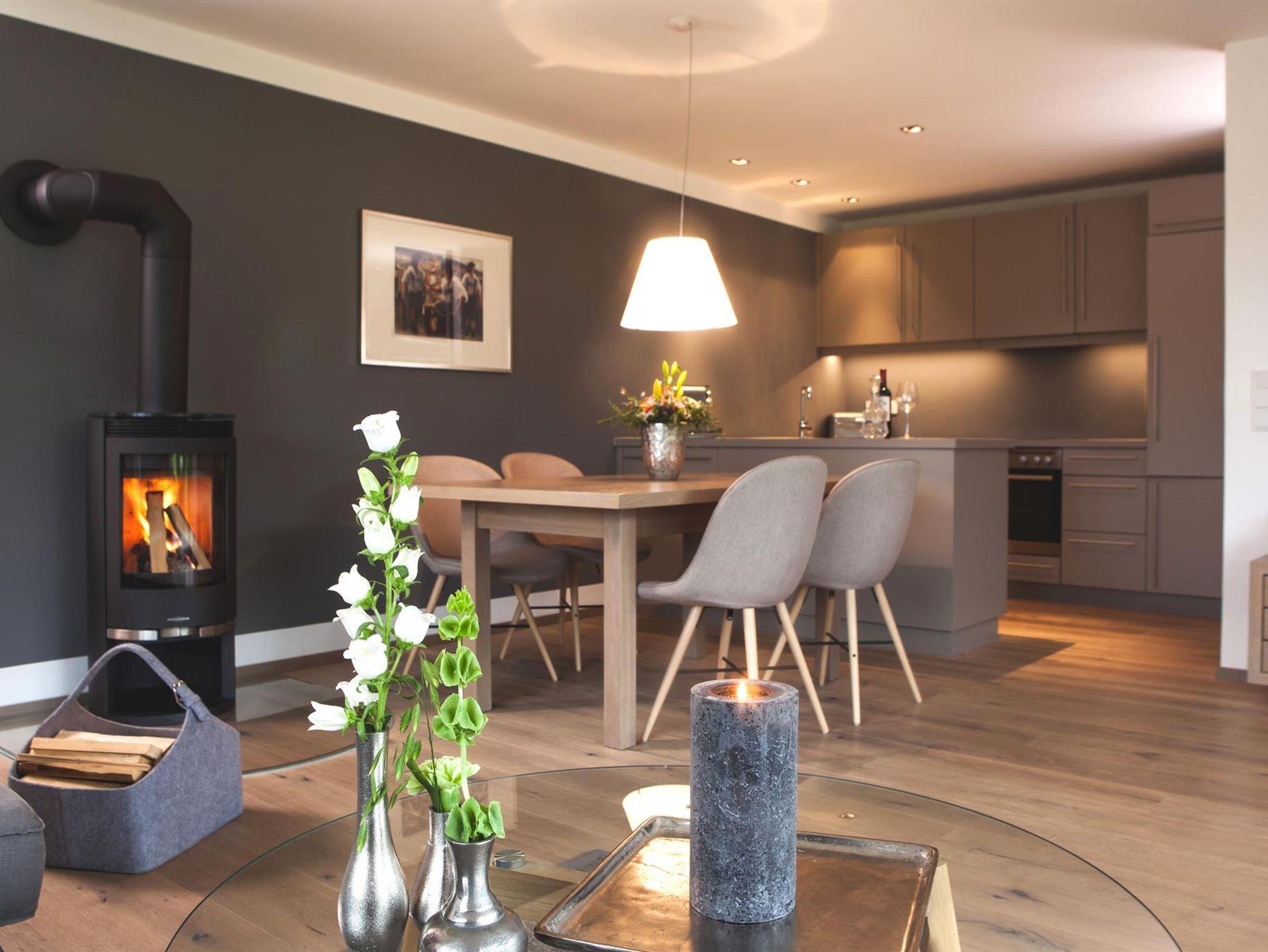 Haus Eisenhammerweg 2: Ferienwohnung 1-heller, großzügiger Wohn- und Essbereich mit gemütlichem Holzofen, Kochbereich mit Nespresso Kaffeemaschine, Ceran-Kochfeld, Geschirrspüler und Backofen, zwei separate Schlafräume mit komfortablen Doppelbetten, großes Tageslicht-Badezimmer mit Doppelwaschbecken, Kosmetikspiegel, Badewanne und bodenebener Dusche, WC separat. Große Fenster geben den Blick frei auf grüne Wiesen und die umgebenden Berge. Tolle Sonnenterrasse mit großem Garten inklusive.