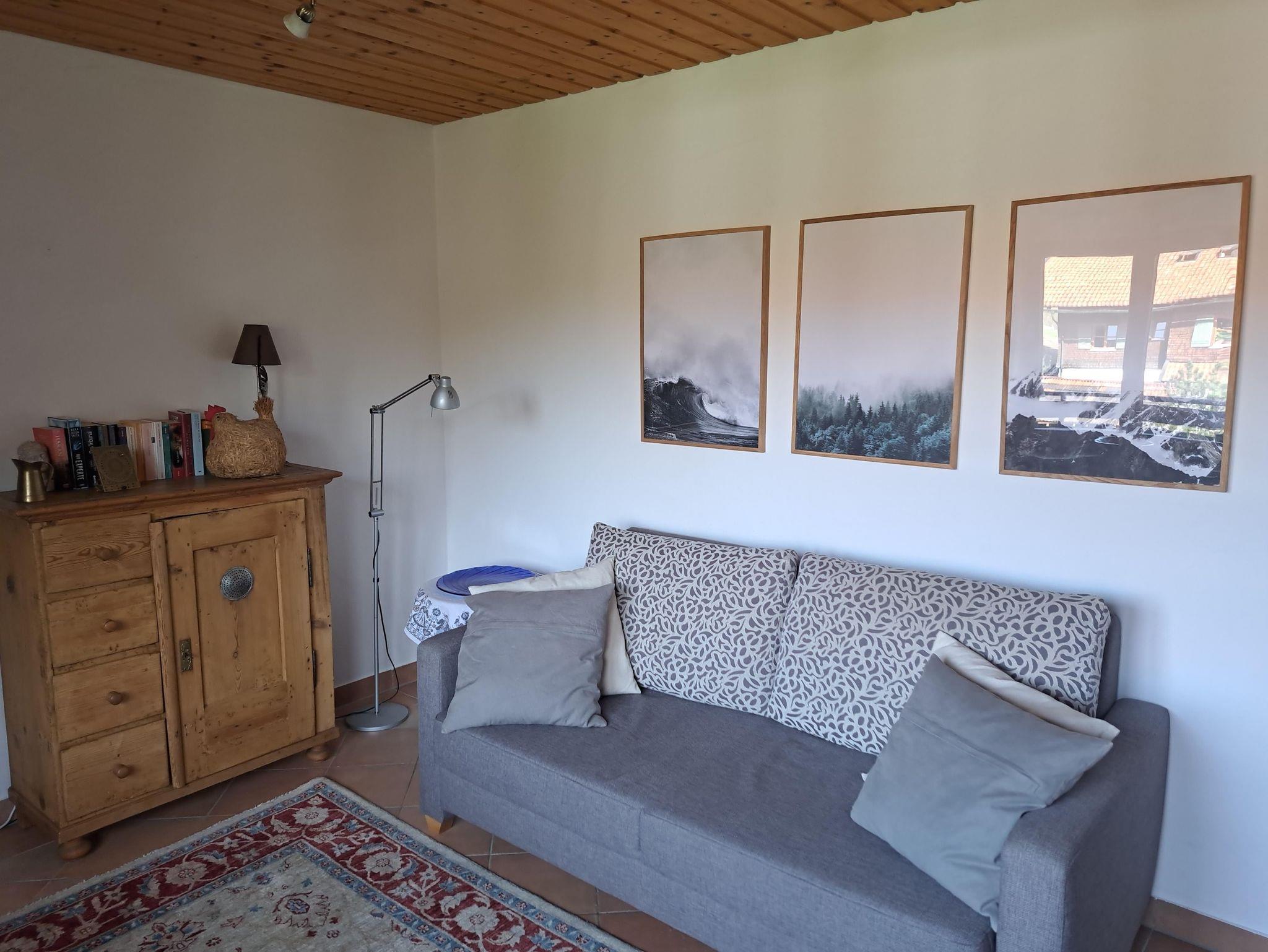 Die Wohnung befindet sich in ruhiger Lage mit Bergblick in Vorderhindelang, 1. OG Westlage. Sie besteht aus einem Wohnzimmer mit Schlafgelegenheit (Klappcouch), Küche (komplett ausgestattet), Bad, Schlafzimmer, Balkon. Die Wohnung ist sehr liebevoll und gemütlich eingerichtet sowie gefliest im mediterranen Stil, im Schlafzimmer befindet sich Parkettboden. Sie ist komplett renoviert, mit neuer Einbauküche und neuem Badezimmer. Zu unserem Preis hinzu kommen 25 € für das Mitbringen Ihres Hundes.