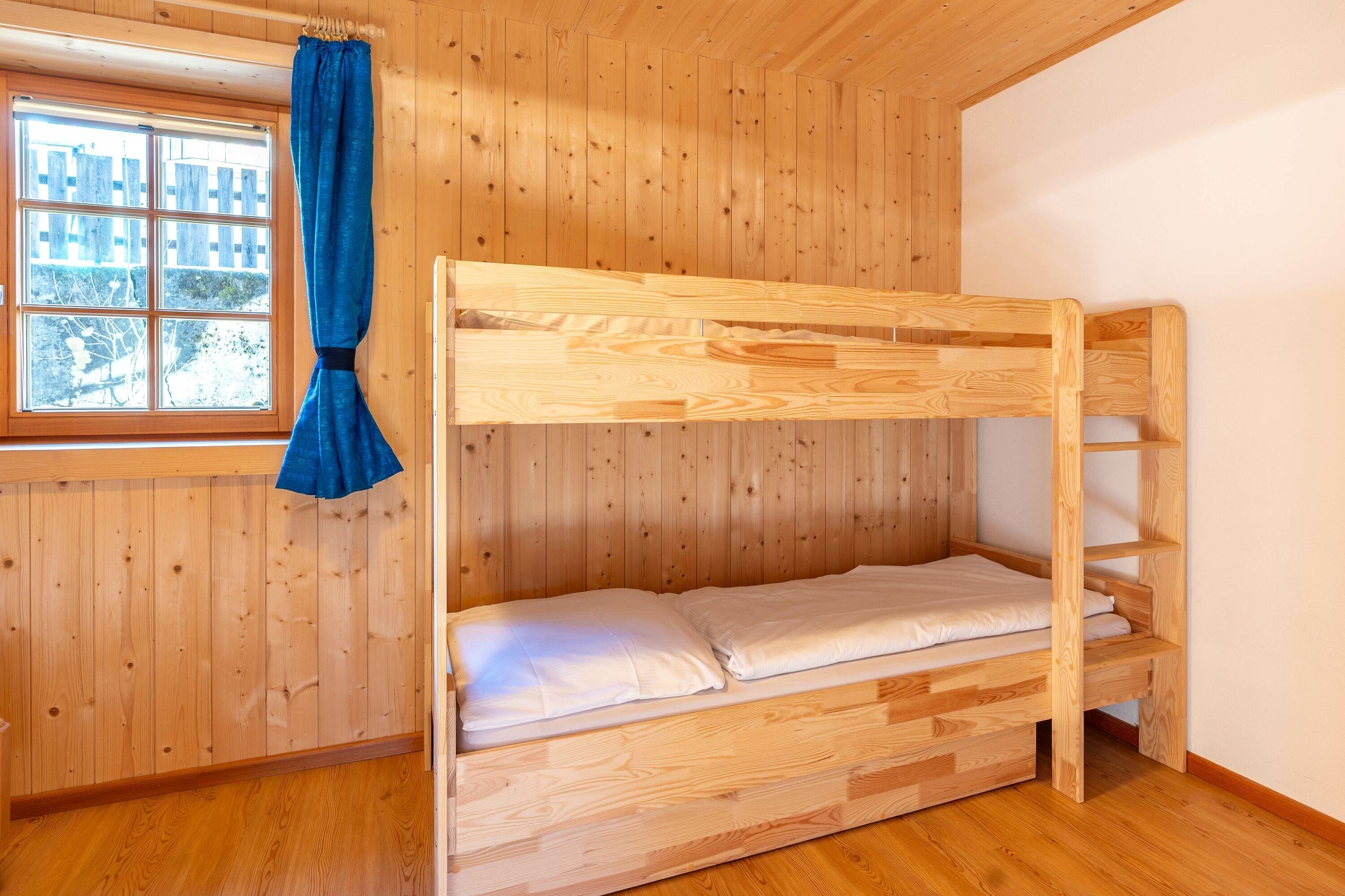 Das separate Schlafzimmer ist funktional und komfortabel ausgestattet und verfügt über ein Doppelbett sowie ein Etagenbett – ideal für Familien oder kleine Gruppen. Ein Kleiderschrank und eine Kommode bieten ausreichend Stauraum für Ihre Urlaubsgarderobe.