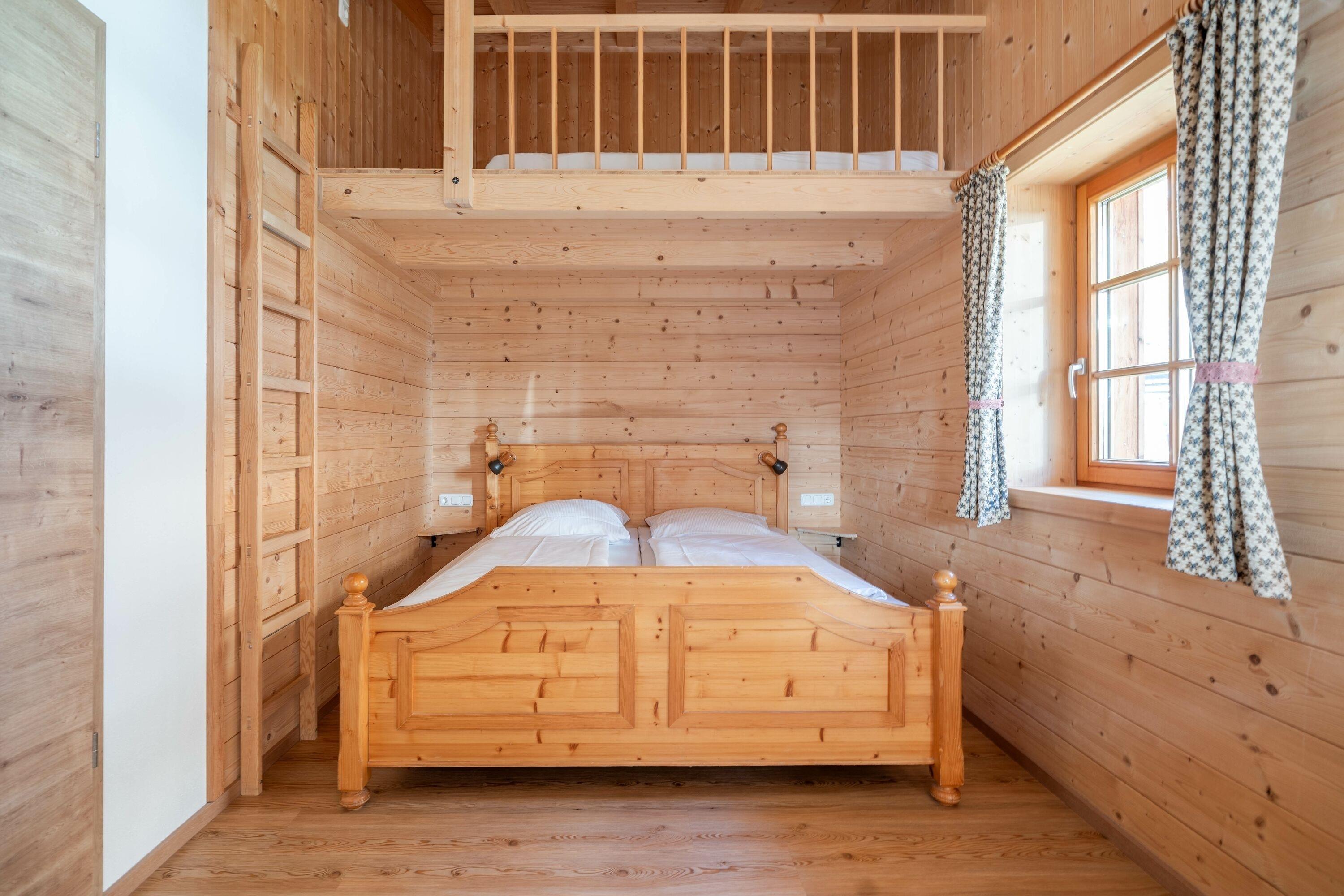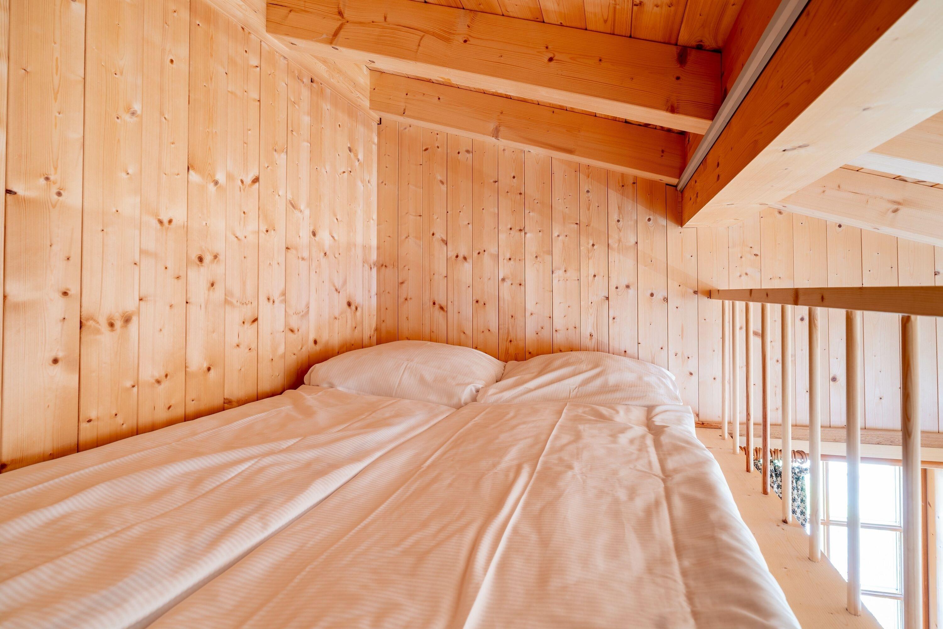 Das separate Schlafzimmer ist praktisch und komfortabel gestaltet und verfügt über ein Doppelbett mit 180 cm Breite sowie ein Hochbett mit einer 140 cm breiten Matratze – ideal für Paare, Familien oder kleine Gruppen. Ein Kleiderschrank und eine Kommode bieten ausreichend Stauraum für Ihre Urlaubsgarderobe.
