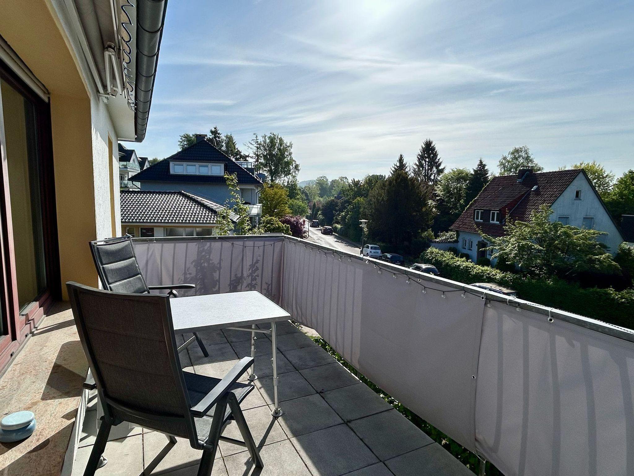 Gemütliche Abende können entweder auf der Couch in dem geräumigen Wohnzimmer verbracht werden oder auch auf dem angrenzenden größeren der zwei Balkone, dem Südbalkon, um mit einem Kaltgetränk den vergangenen Tag ausklingen zu lassen - mit Blick auf das Iburger Schloss. Der Balkon bietet ausreichend Platz, um mit mindestens vier Personen zusammenzusitzen. Mit einer elektrisch ausfahrbaren Markise ist bei strahlendem Sonnenschein für Schatten gesorgt.