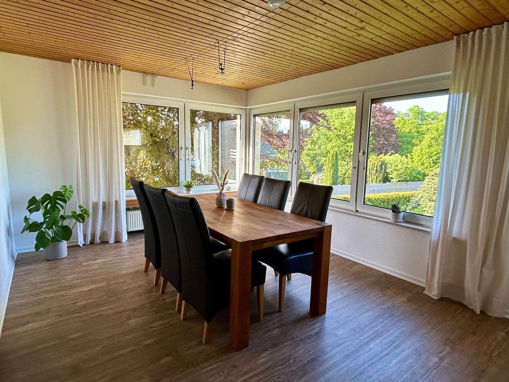 Angrenzend an die Küche finden Sie das Herzstück der Wohnung - das Esszimmer. Hier können sich an einem großen Tisch bis zu 6 Personen zusammenfinden, sodass auch Besuch in der Ferienwohnung herzlich empfangen werden kann. In der zugehörigen Vitrine gibt es jegliche Gläser, sowie zusätzliches Geschirr für weitere Anlässe (Kuchenteller, Eierbecher, Sekt- und Weingläser). Eine große Rotbuche direkt vor der Fensterfront des Esszimmers lässt den Eindruck entstehen, man befände sich direkt in der Natur.