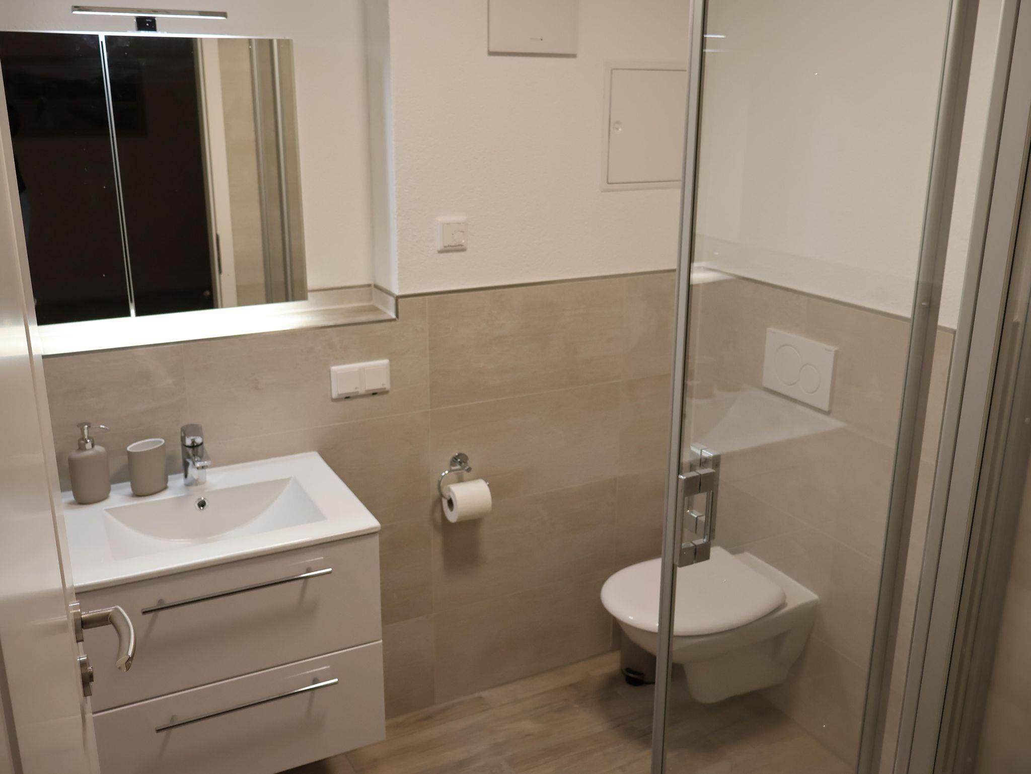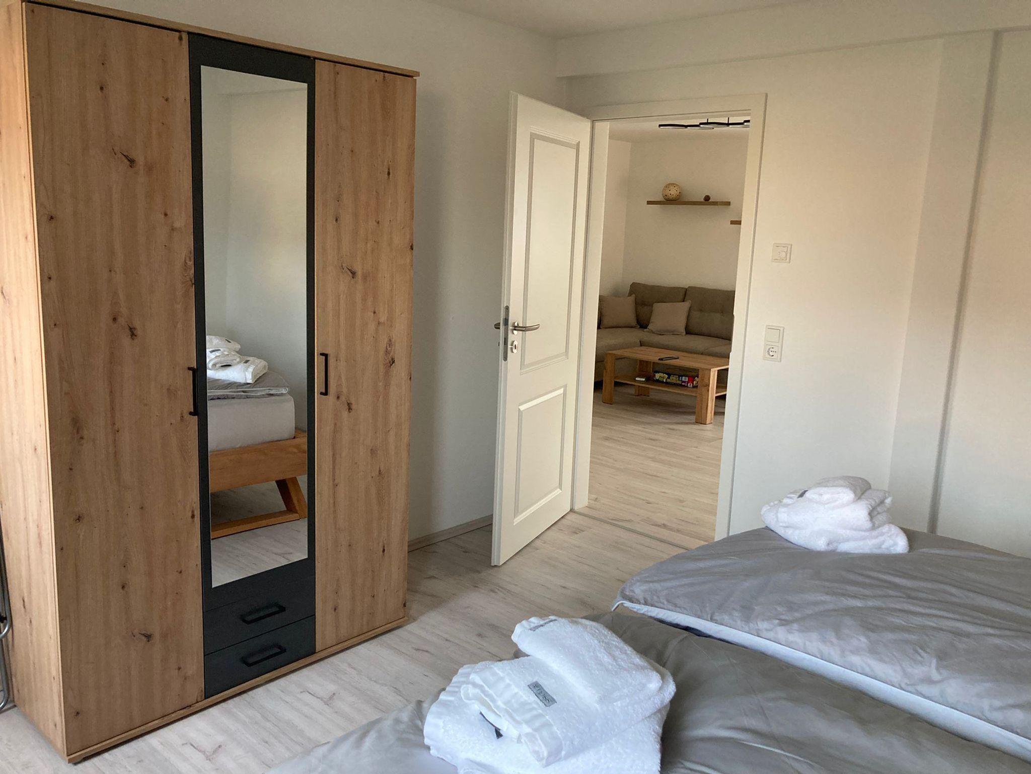 Unsere neue Ferienwohnung mit 56 m² Wohnfläche bietet im Erdgeschoss mit Gartenblick Platz für 1-4 Personen. Die gemütliche Wohnküche mit Sofa und Flachbild-TV lädt zum Verweilen ein. Die komplett ausgestattete Küchenzeile mit Geschirrspüler, Kühlschrank inkl. Gefrierfach, Herd, Backofen, Mikrowelle, Wasserkocher, Toaster und Kaffeemaschine lässt keine Wünsche offen. Die Ferienwohnung verfügt über zwei separate Schlafzimmer mit einem Doppelbett und einem Einzelbett. Das Badezimmer mit ebenerdiger Dusche, WC, Waschtisch und Handtuchtrockner rundet das Gesamtbild ab. Vor allem im Sommer können Sie entspannte Grillabende in unserem Garten verbringen. Bitte beachten Sie, dass keine Haustiere erlaubt sind. Das WLAN und den Parkplatz vor dem Haus können Sie kostenfrei nutzen.