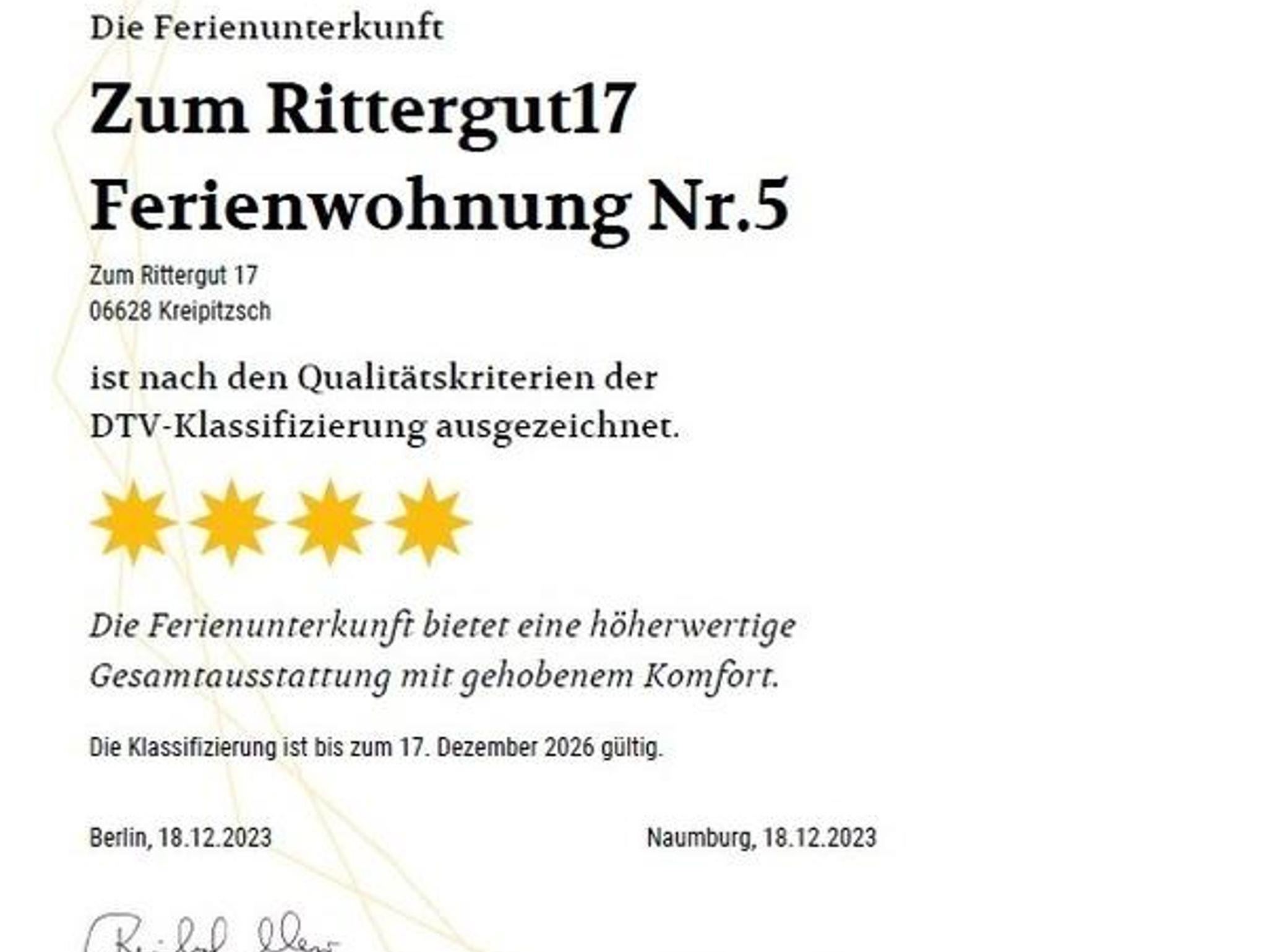 Die Ferienwohnung wurde im Dezember 2023 vom Deutschen Tourismusverband mit vier Sternen nach den Qualitätskriterien der DTV-Klassifizierung ausgezeichnet.
