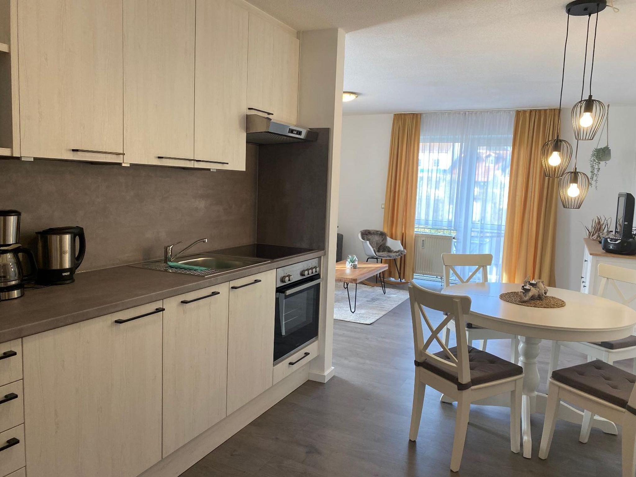 Komfortables Wohlfühl-Appartement mit komplett neuer moderner Ausstattung, funktionale moderne Küche mit Geschirrspüler, Mikrowelle, Backofen, Kühlschrank und allen notwendigen Küchenutensilien, zwei Schlafräume ausgestattet mit jeweils zwei Boxspringbetten, Wohnküche mit Schlafsofa, Essecke und Balkonzugang, komplett neu ausgestattetes Badezimmer mit Fön, Dusche und Badematten. Das Appartement liegt Richtung Regenseite mit Balkon mit einem herrlichen Blick zum Regen-Fluß.