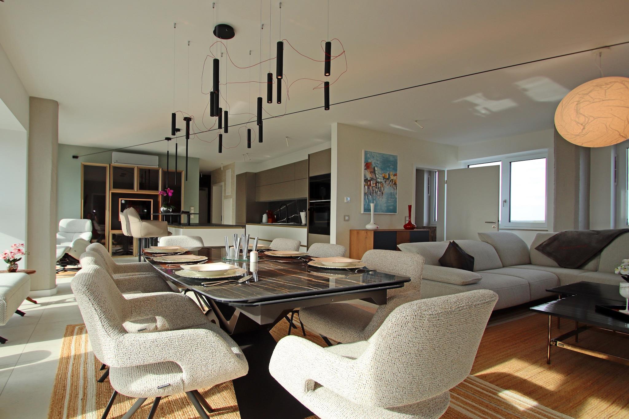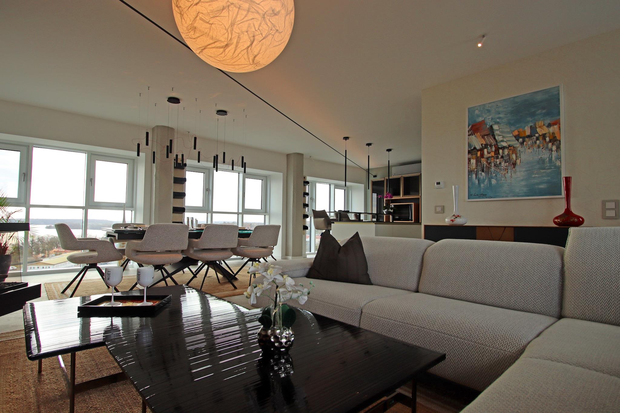 Denne eksklusive toppleiligheten i 9. etasje i lagerbygningen i Bad Kleinen kan skilte med en unik panoramautsikt over Schwerinsjøen og designdetaljer i toppklasse. Tre stilige soverom – hvorav to er omtrent 10 m² store og har direkte utsikt over innsjøen – kombinerer varme sandtoner, ekte eikeparkett, gulvvarme og toppmoderne OLED-TV-teknologi. Soverommet til venstre har en designer-sovesofa med springmadrass, et skrivebord og god lagringsplass, mens soverommet til høyre imponerer med klimaanlegg, en SwissSence-seng med springmadrass og et sammenleggbart skrivebord. Hovedsoverommet tilbyr en fantastisk utsikt over marinaen ved Schwerinsjøen, en elektrisk justerbar 180 cm boksmadrass, bambustapet fra Elites, en stor innebygd garderobe og en 42-tommers OLED-TV. Badet kombinerer italiensk design med et sitzbadekar med utsikt over innsjøen, en glassdusj, en Inda-servant, Gessie-armaturer og Villeroy & Boch-keramikk. Det andre badet huser det private spa-området med en finsk og infrarød TEKA-sauna, bambusfliser, eksklusive armaturer og en glassdusj. Et separat vaskerom med vaskemaskin er et annet høydepunkt. Den romslige stuen har møbler fra Himolla, inkludert elektrisk justerbare sitteplasser og en massasjestol, et italiensk ARCUS-bord i naturstein for opptil ti personer, designerstoler fra Sven Jacob og eksepsjonell belysning fra Davide Groppi. Et eksklusivt kjøkken med helautomatisk kaffemaskin, induksjonstopp med integrert avtrekksvifte, vinkjøler og ismaskin fullfører den luksuriøse atmosfæren. Reisebilder og stilige suvenirer fra eieren gir leiligheten et personlig og kosmopolitisk preg. Beliggenheten byr på perfekte forhold for båt- og SUP-turer, sykkelturer langs innsjøen, turer i naturen (sykkelparkering tilgjengelig), utflukter til verdensarvbyene Schwerin eller Wismar, og avslappende timer ved marinaen eller stranden i Bad Kleinen.