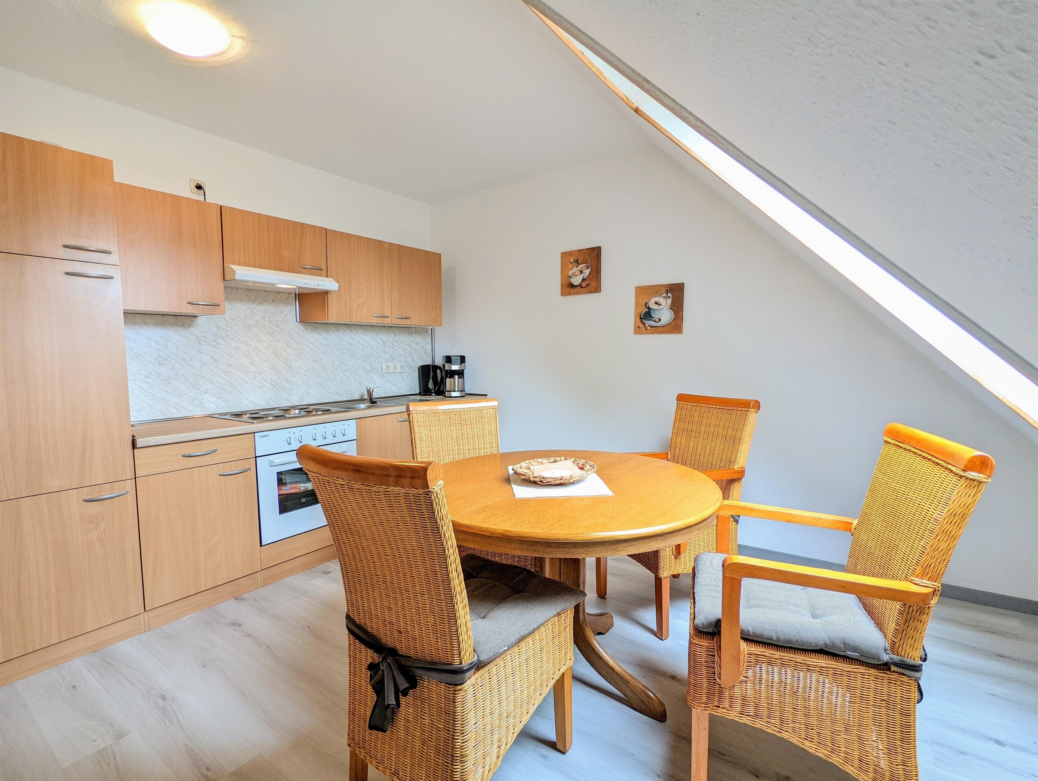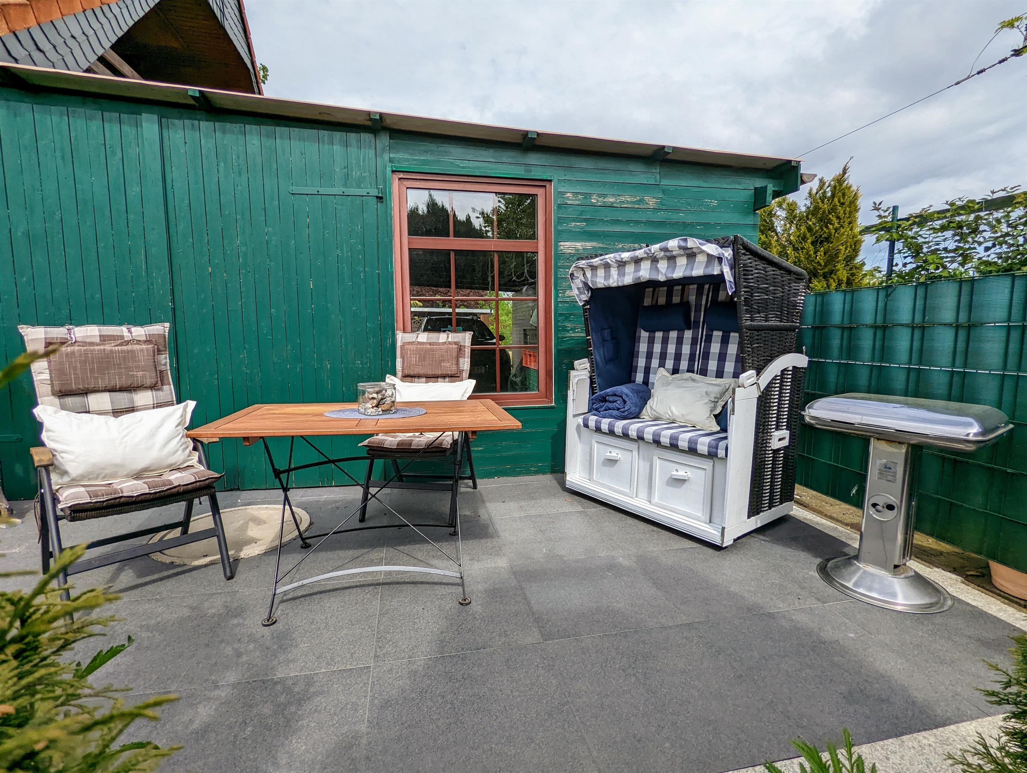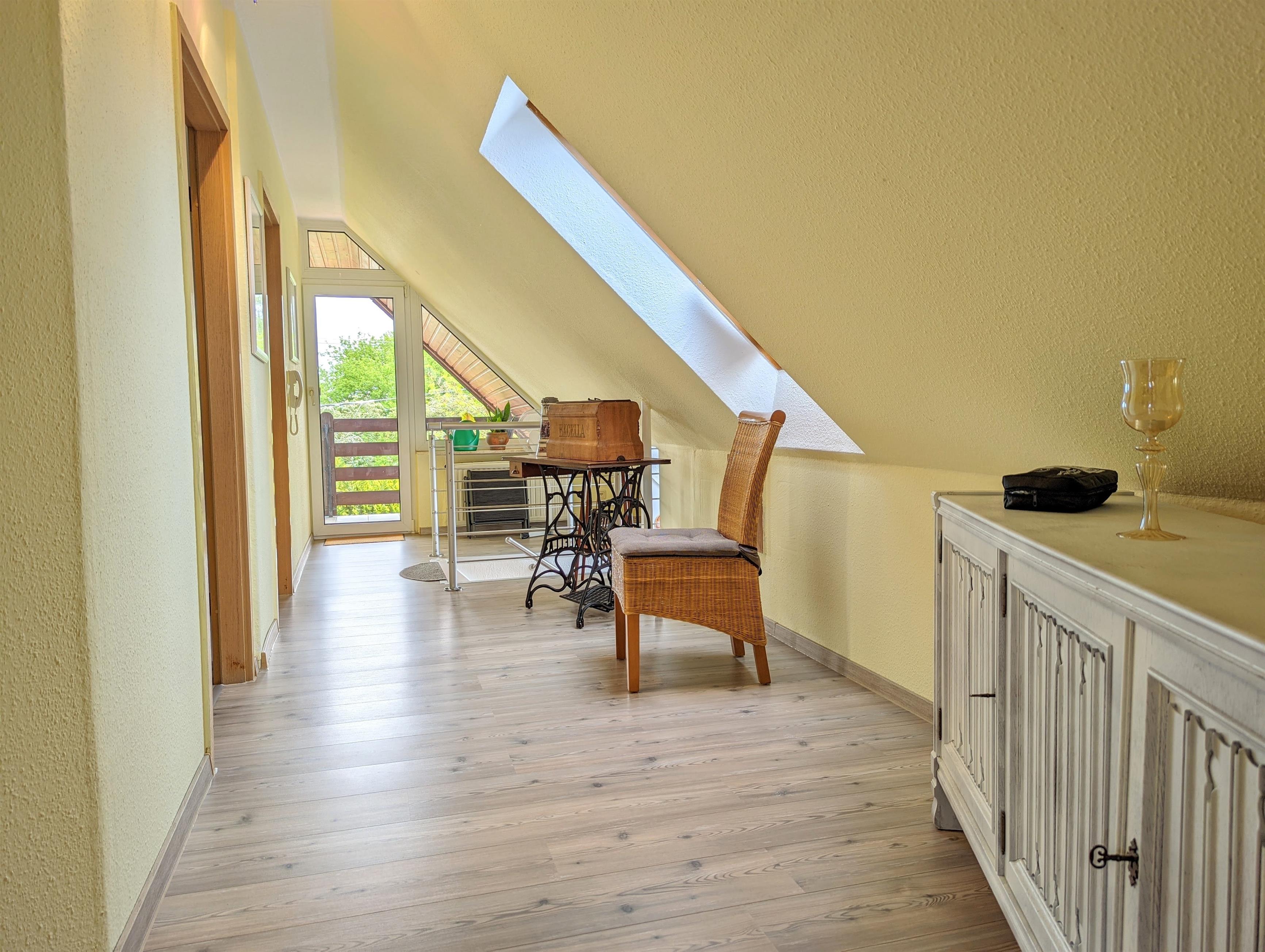 Ein Ort zum Wohlfühlen. Die hochwertig ausgestattete Ferienwohnung bietet ausreichend Platz für 2 Erwachsene + 1 Kleinkind. Auf etwa 55 m² Wohnfläche + Balkon, Freifläche und Wiese können Sie sich wie Zuhause fühlen. Vom Wohnzimmer mit Sat-TV und Schlafsofa (1,40 m breit) und Balkon genießen Sie einen kleinen Seeblick und Blick ins Grüne. Das Schlafzimmer ist mit hochwertigen Matratzen, Kleiderschrank, Insektenschutz und Verdunkelungsmöglichkeit ausgestattet. In der großen und komplett ausgestatteten Küche, mit Essbereich, können Sie leckere Gerichte zubereiten. Das Bad mit Badewanne, Waschbecken und WC besitzt ein Dachfenster, durch das Sie beim Baden den Sternenhimmel sehen können. Die Ferienwohnung befindet sich im 1. Obergeschoss mit separaten Eingang. W-LAN, Carport für Ihr PKW, Strandkorb, Schaukel für die Kinder, Kinderreisebett und Hochstuhl sind vorhanden. Am Grundstück verläuft eine Bahnlinie entlang. Die meisten Gäste stört das jedoch nicht, da der Zug unterhalb des Grundstücks (Hanglage) fährt und nicht sichtbar ist.