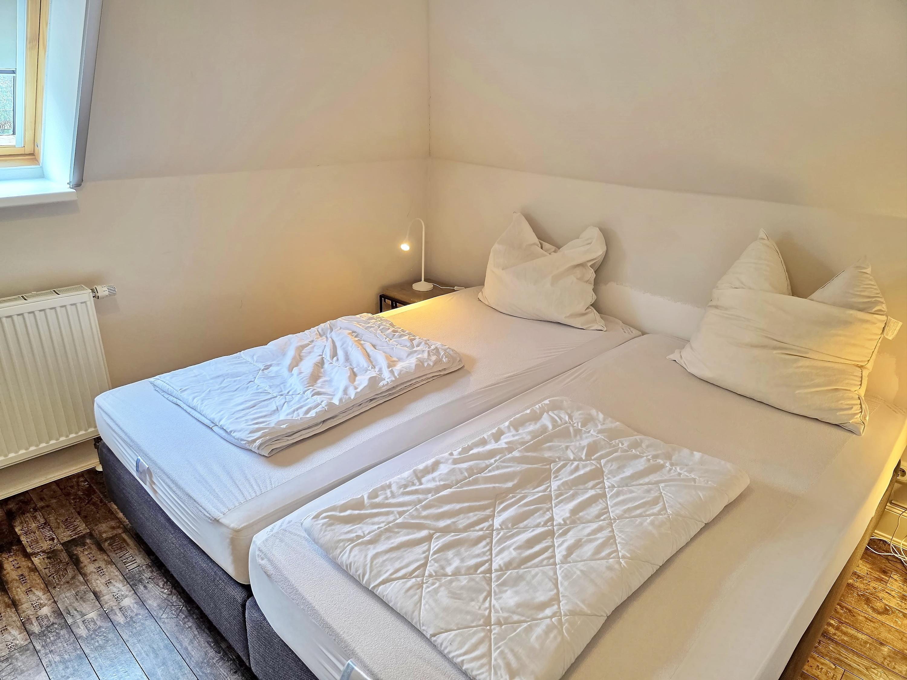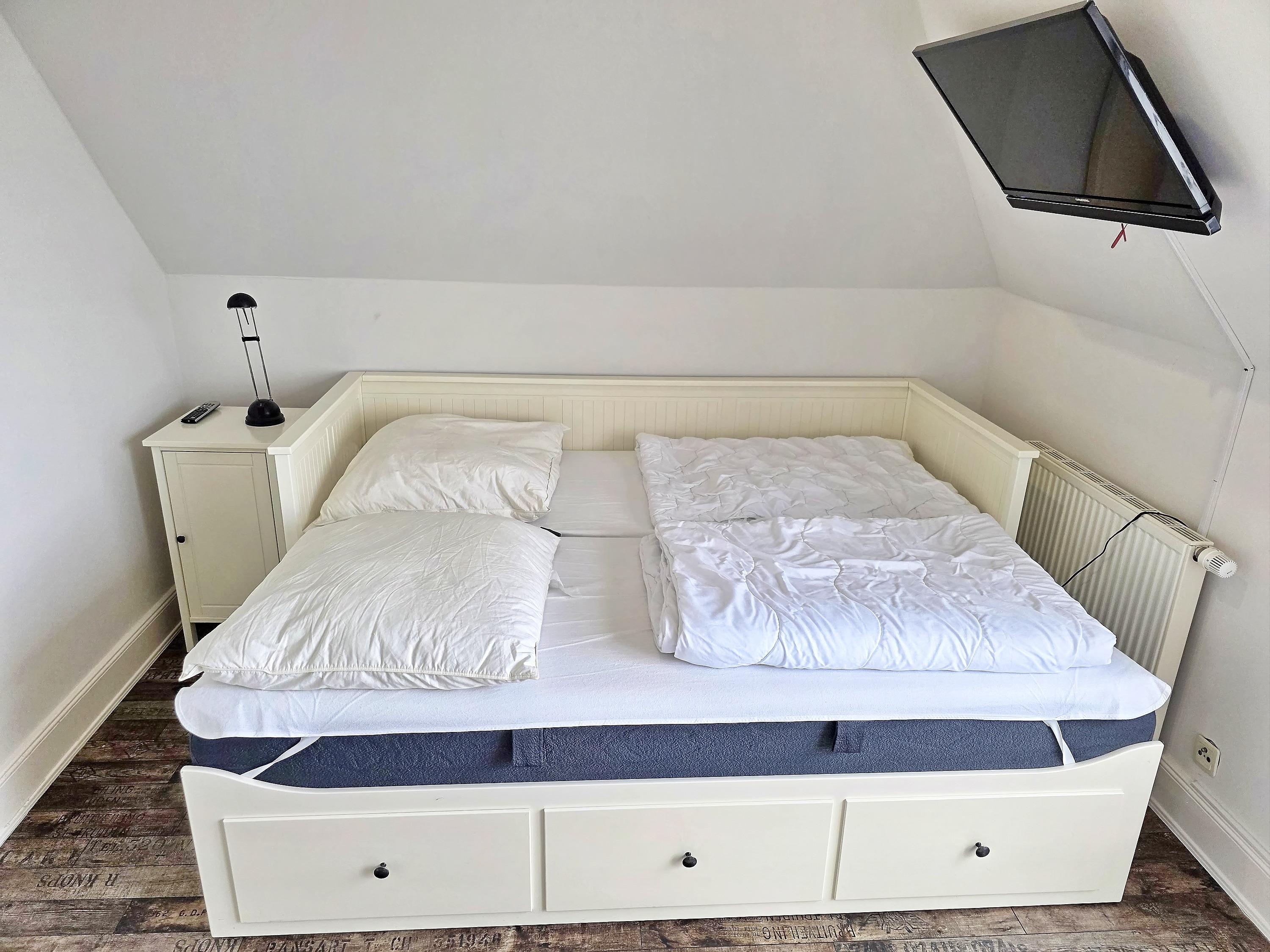 - 1. Schlafzimmer mit ausgezogenen Bett (Liegefläche 2 x 0,80 x 2,00 m), Schrank, Stuhl, Radio, Zugang zum Balkon, kein TV!!!