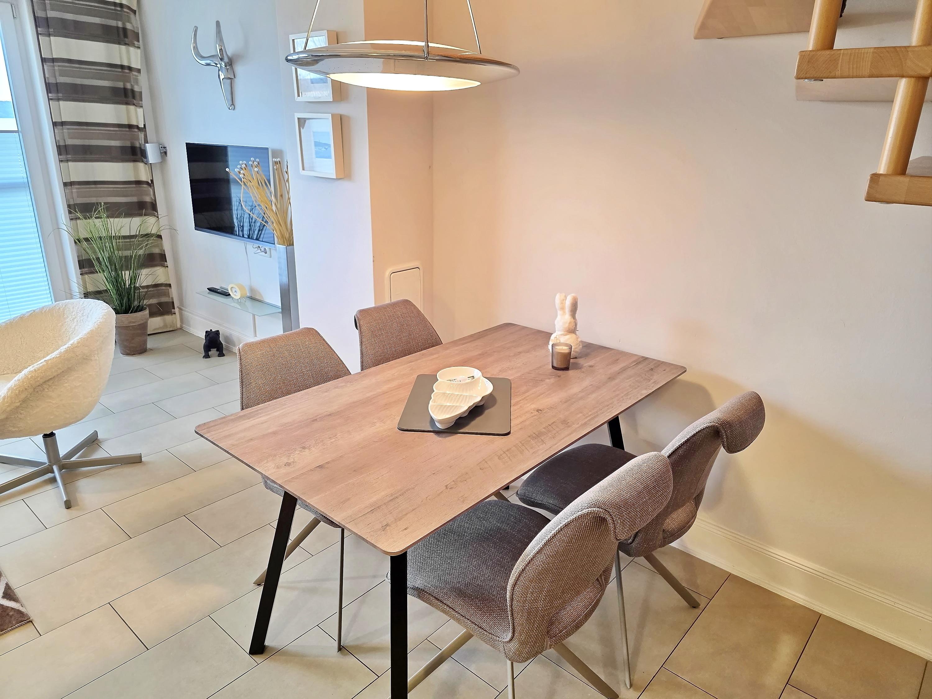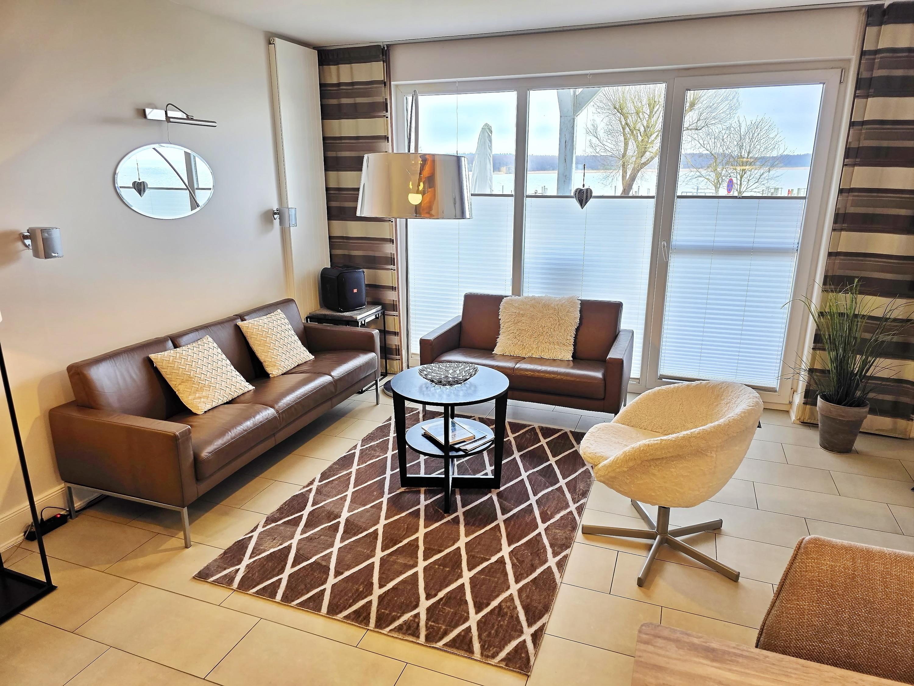 - großes Wohnzimmer mit Couch, 2 Sessel, TV, Essbereich für 4 Personen, Seeblick und Zugang zur Terrasse