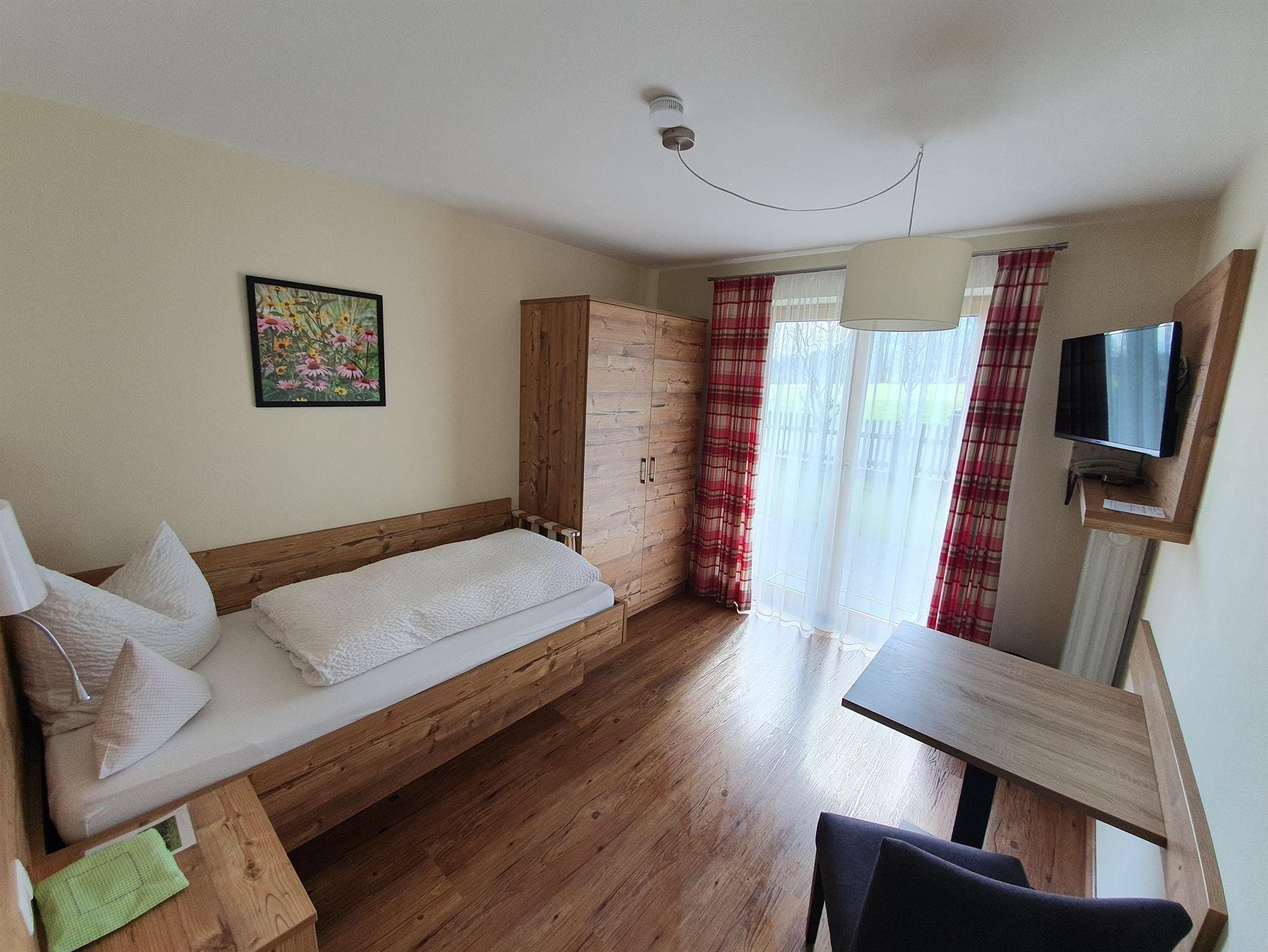 Fühlen Sie sich wohl in unserem gemütlich eingerichteten Einzelzimmer mit Dusche/WC. Geniessen Sie die Vorzüge einer möblierten Terrasse mit direktem Zugang zum Garten. Lassen Sie sich morgens mit regionalen Köstlichkeiten von unserem Frühstücksbufett verwöhnen!