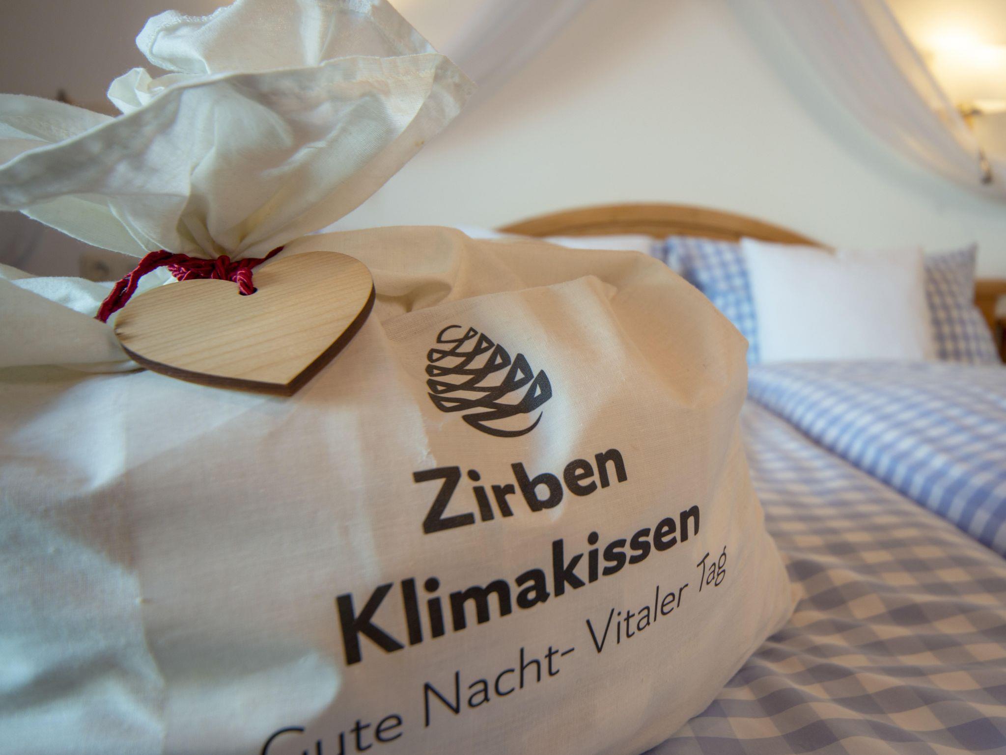 • Schlafzimmer mit Zirbenholz-Klimakissen für einen guten Schlaf