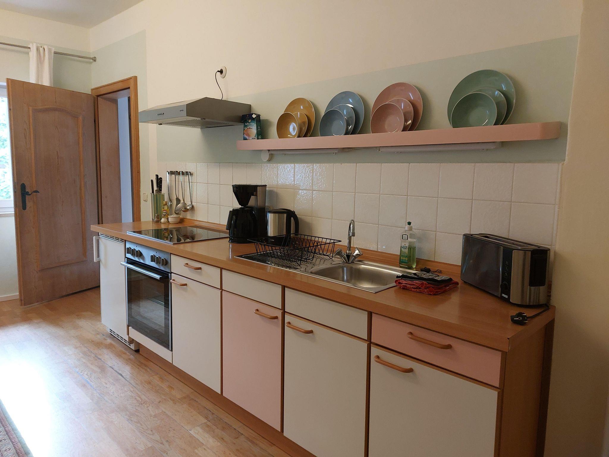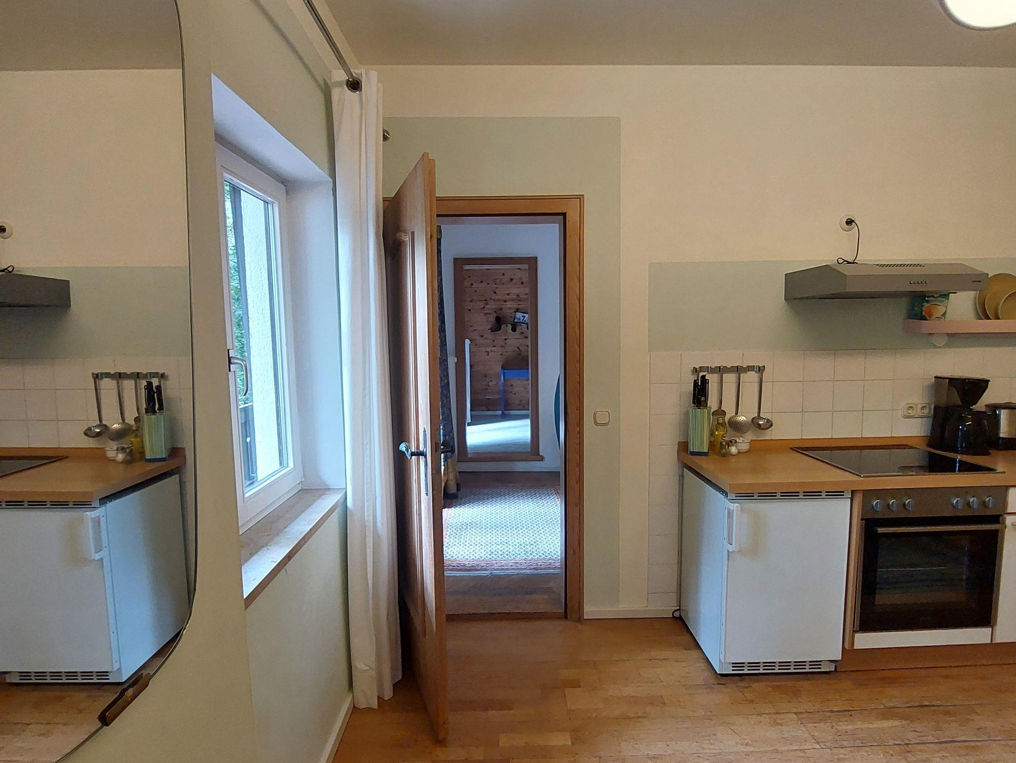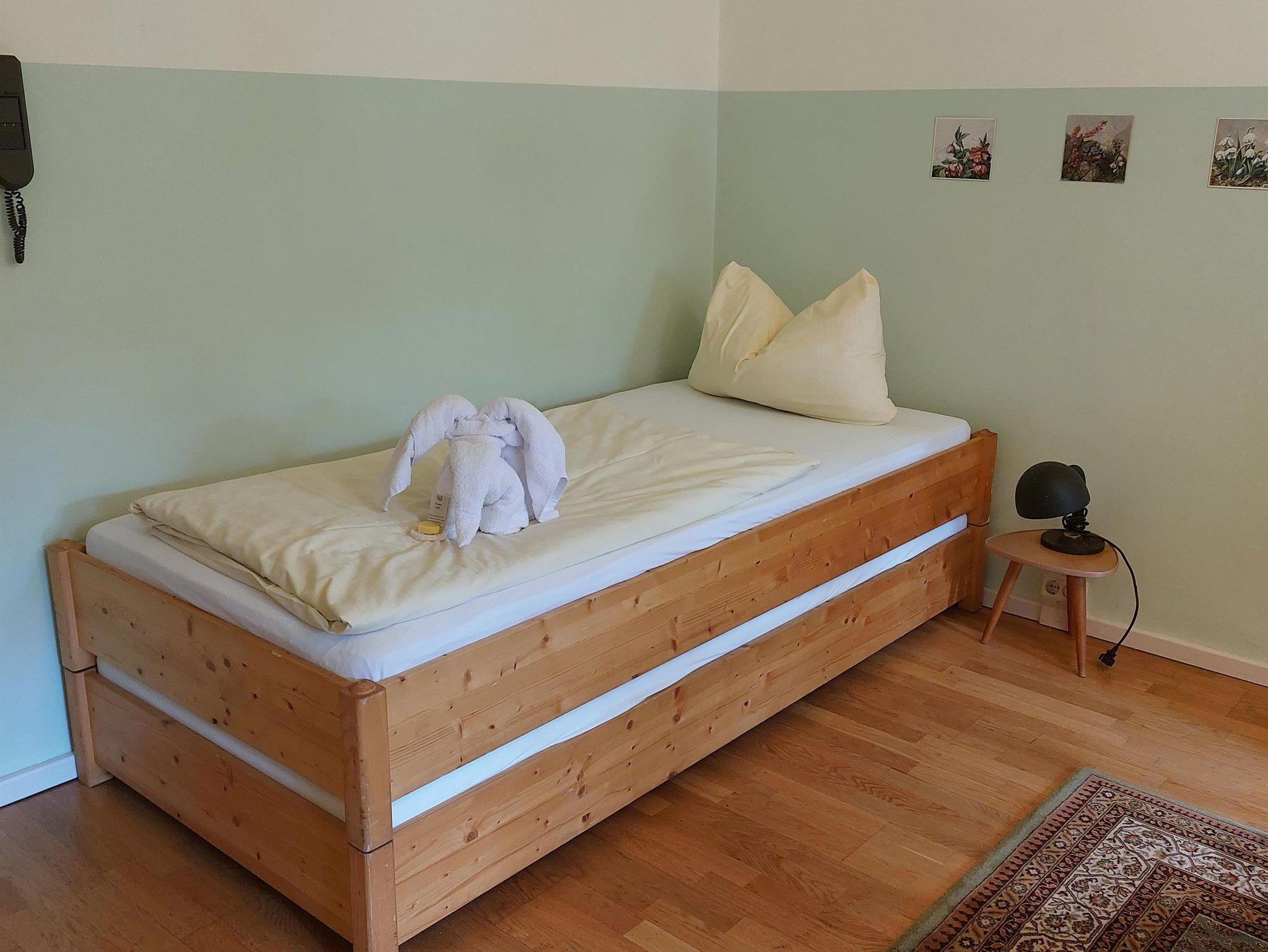 Die Ferienwohnung verfügt über 1 Schlafzimmer, Bad und ein Multifunktionszimmer. In diesem großzügigen Raum ist Küche und Wohnbereich sowie zwei Einzelbetten integriert. Der Zugang zum Balkon befindet sich über das Bad und Schlafzimmer. Die Einrichtung ist einfach und funktionstüchtig. Die Gäste können die Räumlichkeiten im Erdgeschoss (Gastraum und Weinstube) nutzen.