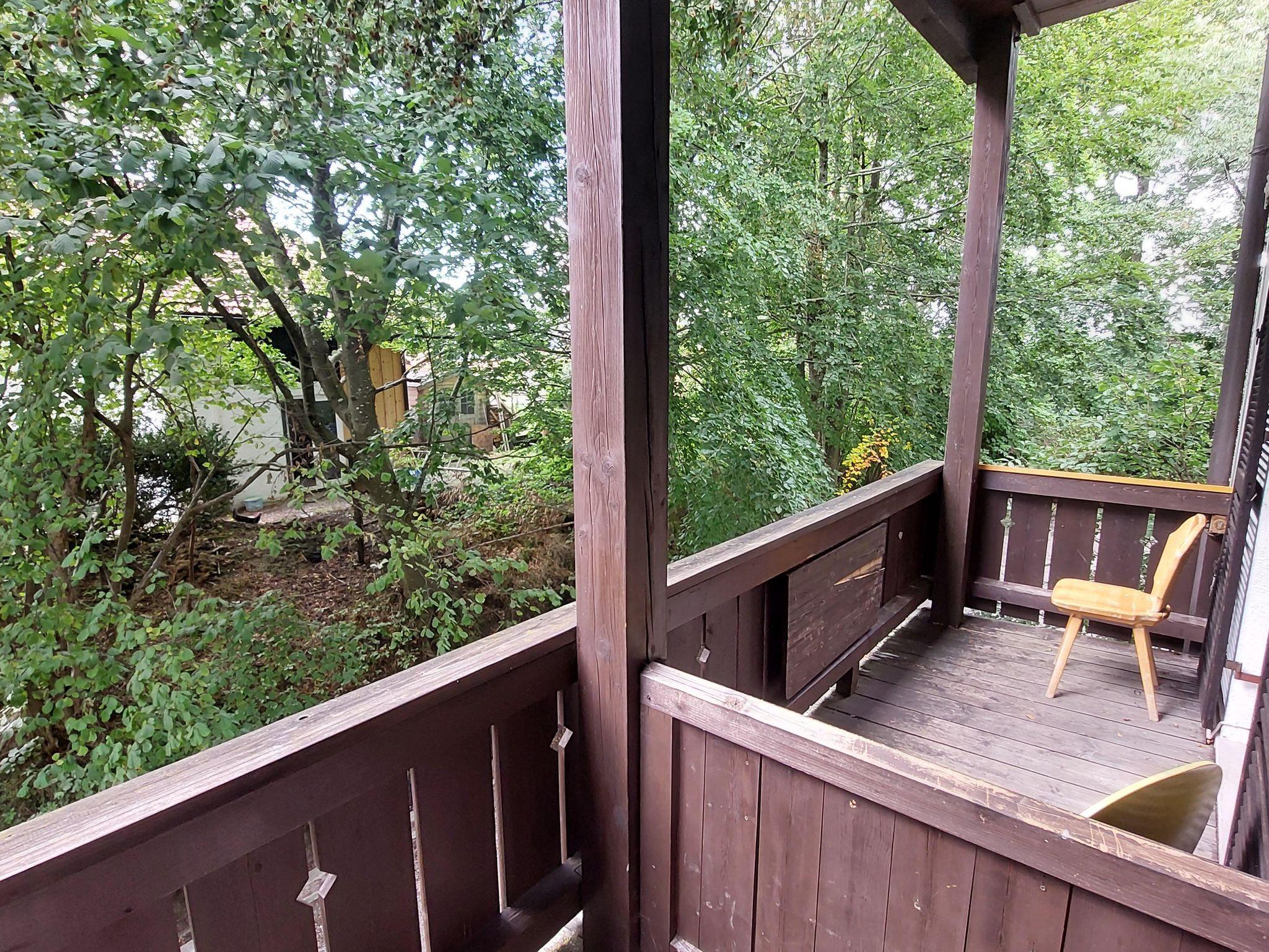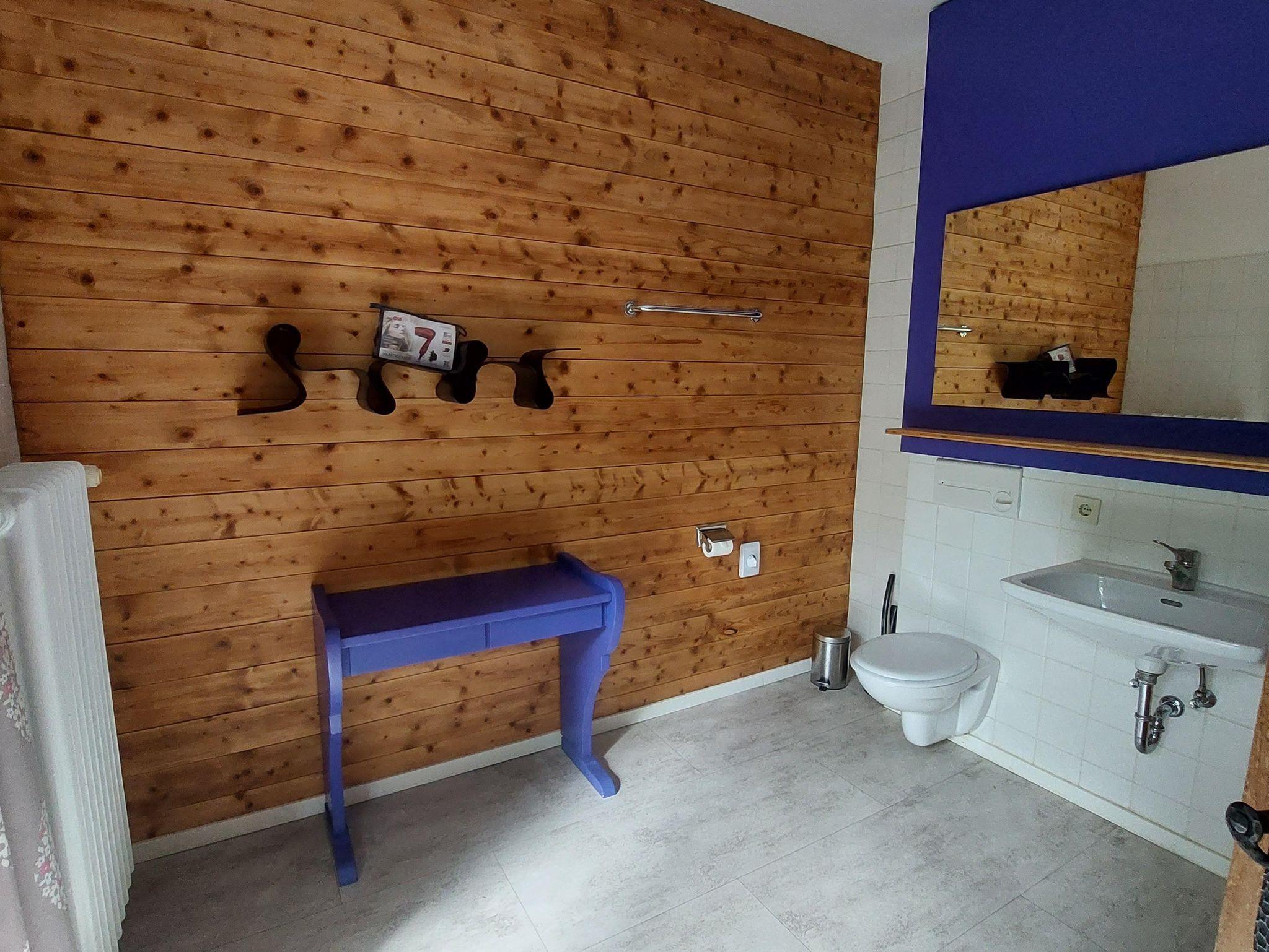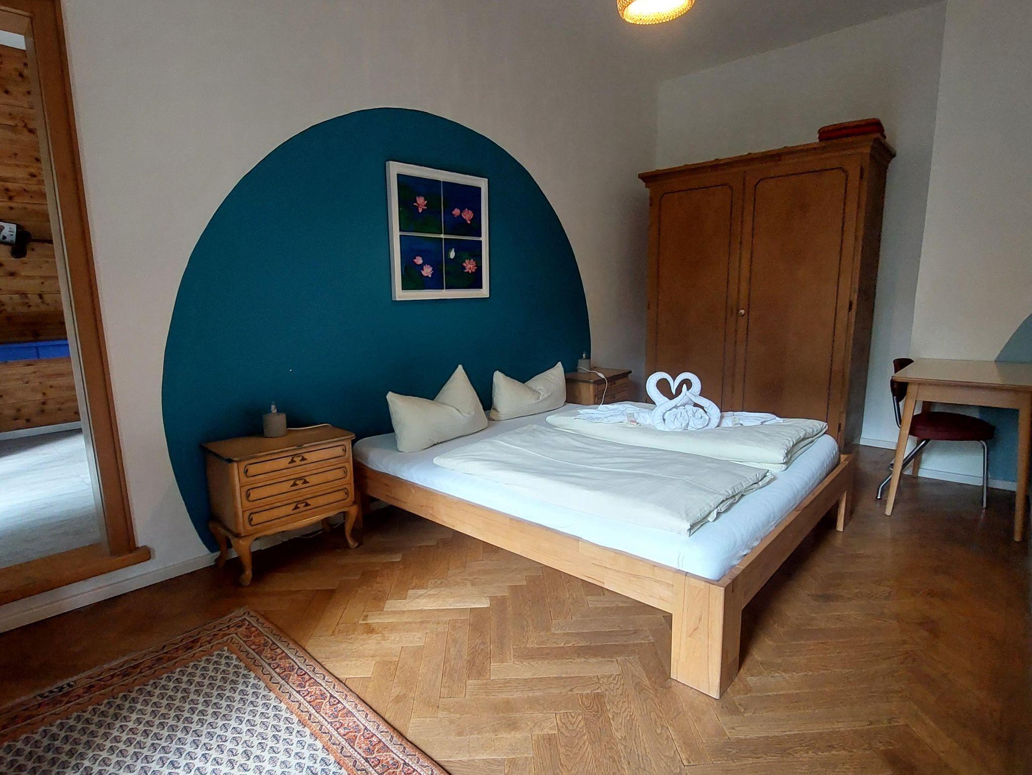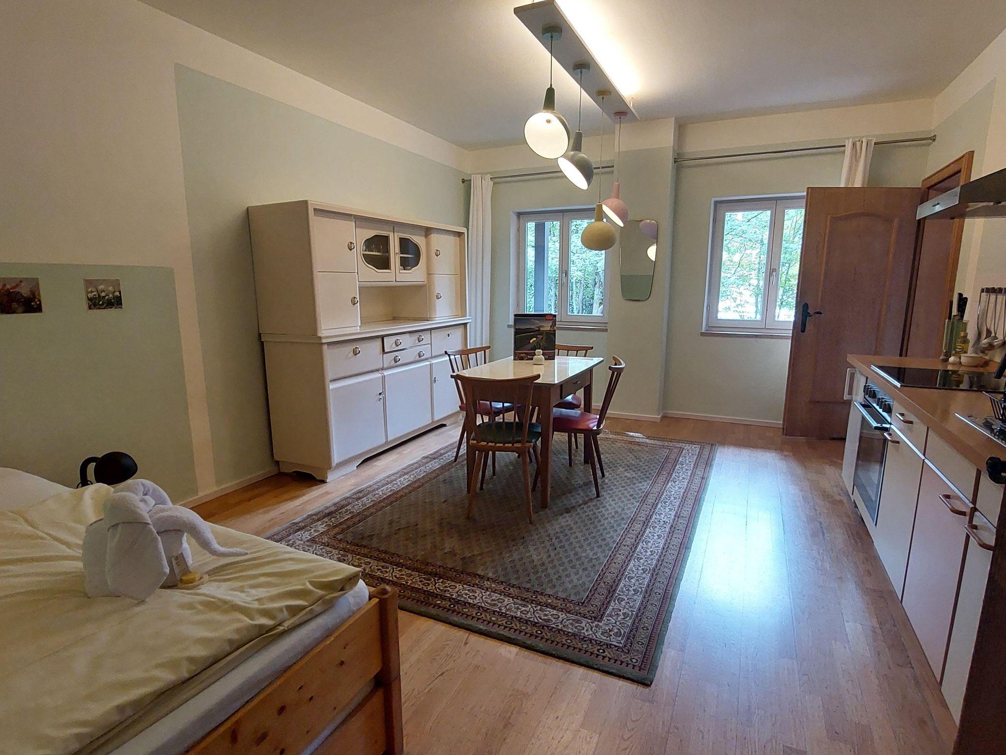 Die Ferienwohnung verfügt über 1 Schlafzimmer, Bad und ein Multifunktionszimmer. In diesem großzügigen Raum ist Küche und Wohnbereich sowie zwei Einzelbetten integriert. Der Zugang zum Balkon befindet sich über das Bad und Schlafzimmer. Die Einrichtung ist einfach und funktionstüchtig. Die Gäste können die Räumlichkeiten im Erdgeschoss (Gastraum und Weinstube) nutzen.